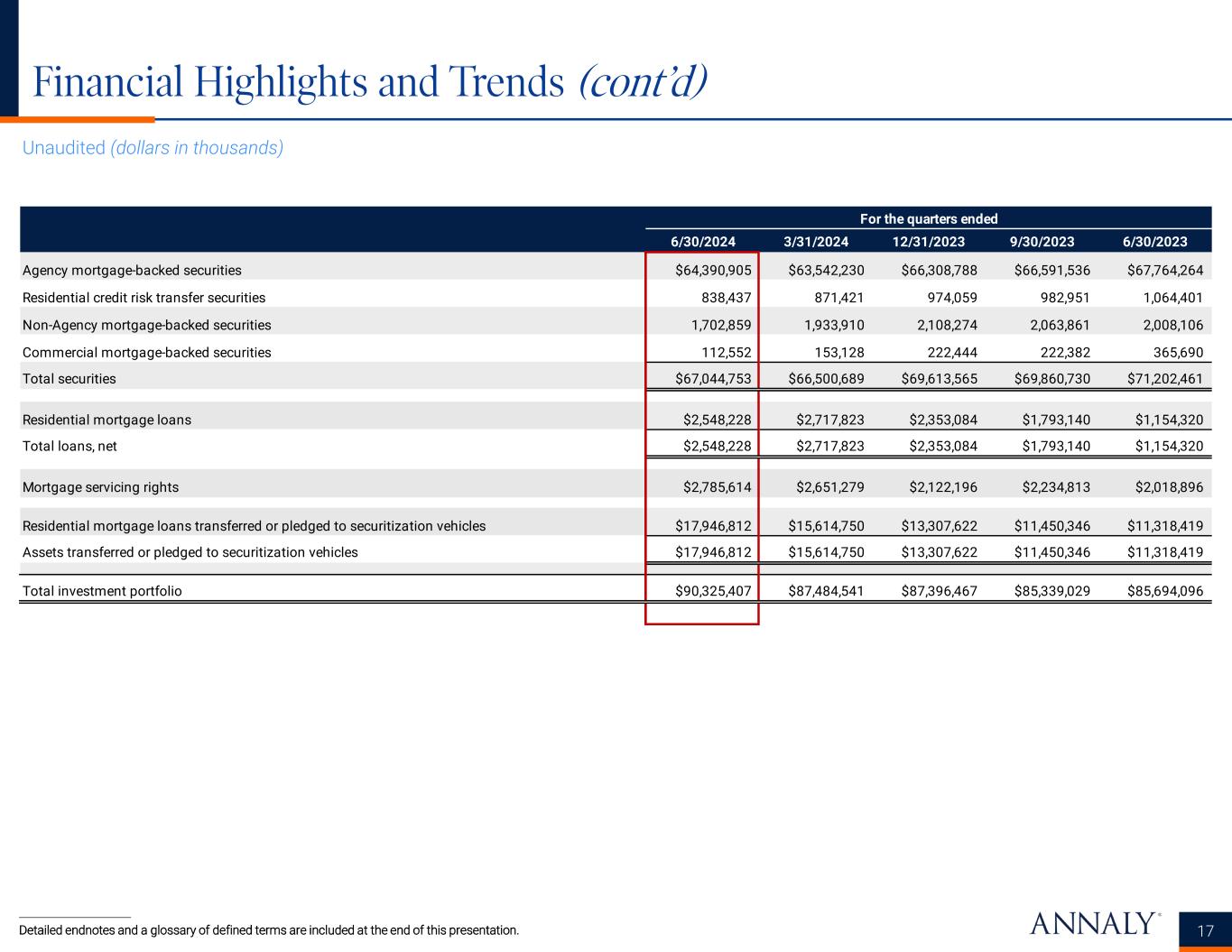 Financial Highlights and Trends 16 For the quarters ended 6/30/2024 3/31/2024 12/31/2023 9/30/2023 6/30/2023 GAAP net income (loss) per average common share(1) ($0.09) $0.85 ($0.88) ($1.21) $0.27 Earnings available for distribution per average common share*(1) $0.68 $0.64 $0.68 $0.66 $0.72 Dividends declared per common share $0.65 $0.65 $0.65 $0.65 $0.65 Book value per common share $19.25 $19.73 $19.44 $18.25 $20.73 Annualized GAAP return (loss) on average equity(2) (0.31%) 16.29% (14.21%) (20.18%) 5.42% Annualized EAD return on average equity* 13.36% 12.63% 13.76% 12.96% 13.22% Net interest margin(3) 0.24% (0.03%) (0.25%) (0.20%) (0.15%) Average yield on interest earning assets(4) 5.17% 4.88% 4.55% 4.49% 4.27% Average GAAP cost of interest bearing liabilities(5) 5.43% 5.40% 5.37% 5.27% 5.00% Net interest margin (excluding PAA)(3)* 1.58% 1.43% 1.58% 1.48% 1.66% Average yield on interest earning assets (excluding PAA)(4)* 5.14% 4.87% 4.64% 4.46% 4.22% Average economic cost of interest bearing liabilities(5)* 3.90% 3.78% 3.42% 3.28% 2.77% GAAP leverage, at period-end(6) 7.1x 6.7x 6.8x 7.1x 6.1x Economic leverage, at period-end(6)* 5.8x 5.6x 5.7x 6.4x 5.8x * Represents a non-GAAP financial measure; see Appendix. Detailed endnotes and a glossary of defined terms are included at the end of this presentation. Unaudited