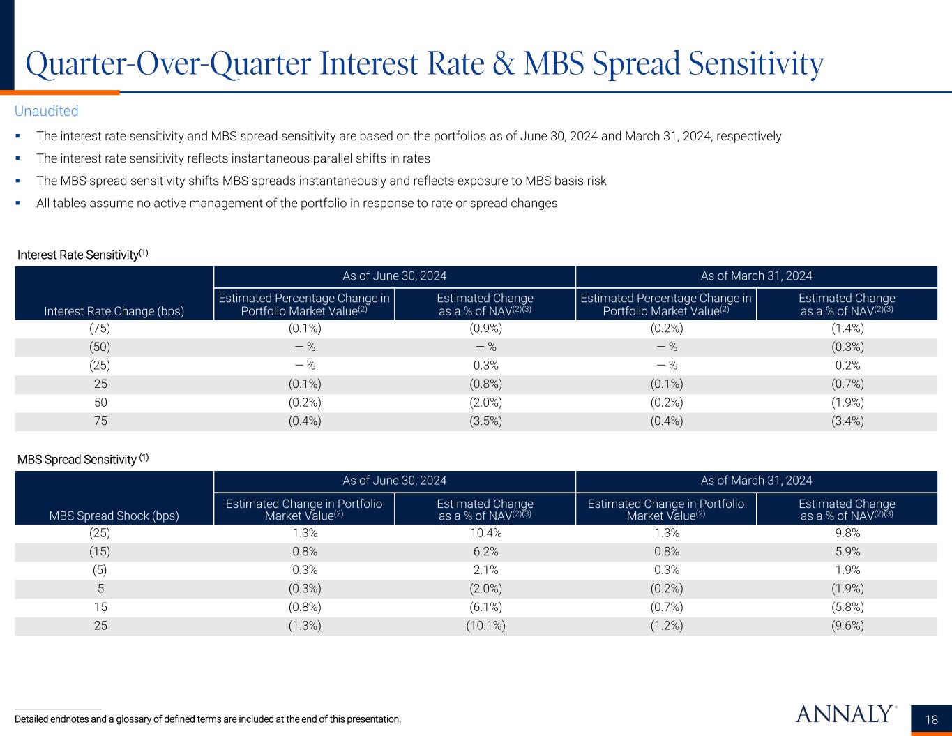 Financial Highlights and Trends (cont’d) 17 Unaudited (dollars in thousands) For the quarters ended 6/30/2024 3/31/2024 12/31/2023 9/30/2023 6/30/2023 Agency mortgage-backed securities $64,390,905 $63,542,230 $66,308,788 $66,591,536 $67,764,264 Residential credit risk transfer securities 838,437 871,421 974,059 982,951 1,064,401 Non-Agency mortgage-backed securities 1,702,859 1,933,910 2,108,274 2,063,861 2,008,106 Commercial mortgage-backed securities 112,552 153,128 222,444 222,382 365,690 Total securities $67,044,753 $66,500,689 $69,613,565 $69,860,730 $71,202,461 Residential mortgage loans $2,548,228 $2,717,823 $2,353,084 $1,793,140 $1,154,320 Total loans, net $2,548,228 $2,717,823 $2,353,084 $1,793,140 $1,154,320 Mortgage servicing rights $2,785,614 $2,651,279 $2,122,196 $2,234,813 $2,018,896 Residential mortgage loans transferred or pledged to securitization vehicles $17,946,812 $15,614,750 $13,307,622 $11,450,346 $11,318,419 Assets transferred or pledged to securitization vehicles $17,946,812 $15,614,750 $13,307,622 $11,450,346 $11,318,419 Total investment portfolio $90,325,407 $87,484,541 $87,396,467 $85,339,029 $85,694,096 Detailed endnotes and a glossary of defined terms are included at the end of this presentation.