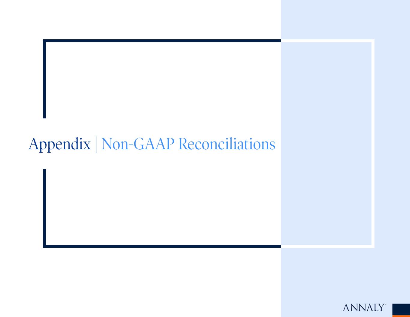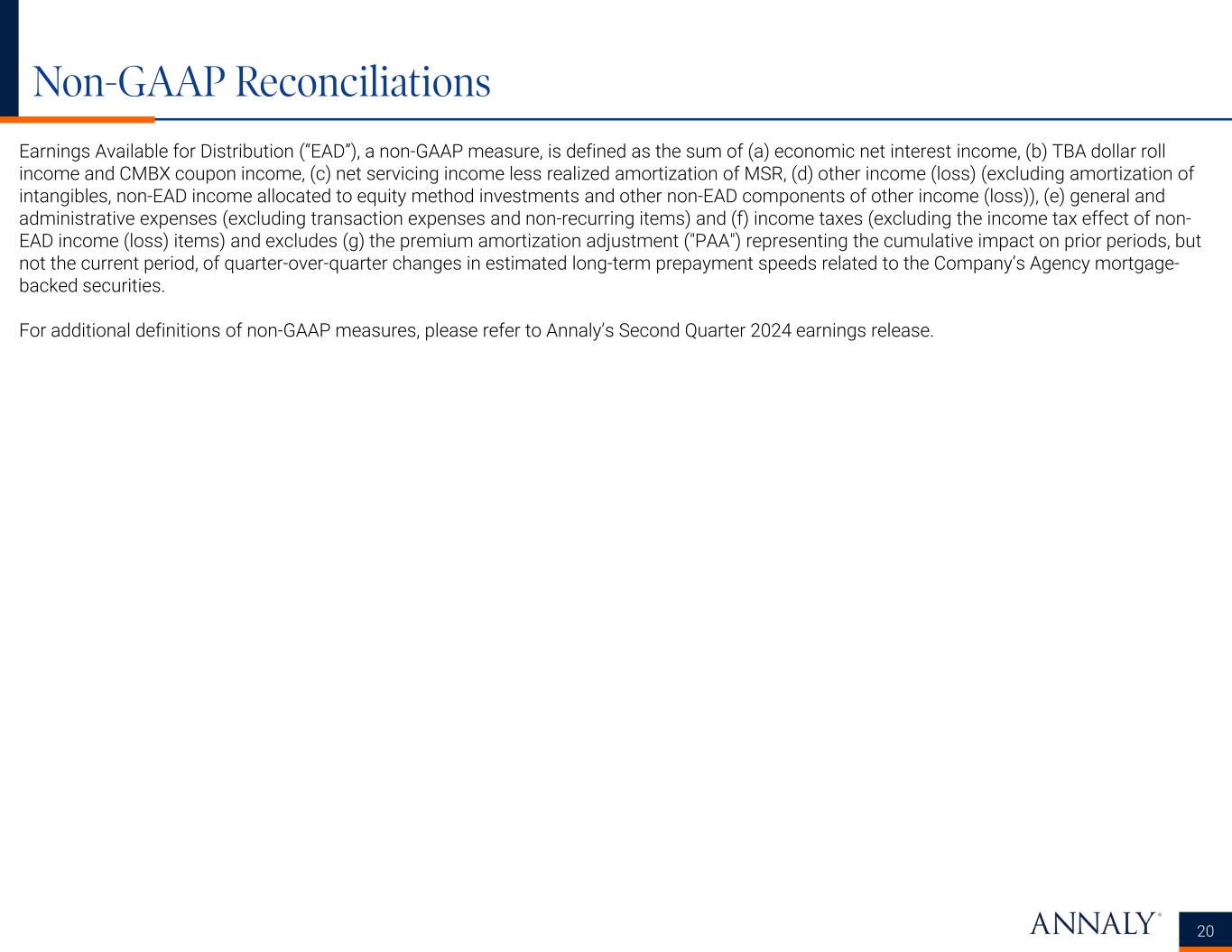 Non-GAAP Reconciliations 20 Earnings Available for Distribution (“EAD”), a non-GAAP measure, is defined as the sum of (a) economic net interest income, (b) TBA dollar roll income and CMBX coupon income, (c) net servicing income less realized amortization of MSR, (d) other income (loss) (excluding amortization of intangibles, non-EAD income allocated to equity method investments and other non-EAD components of other income (loss)), (e) general and administrative expenses (excluding transaction expenses and non-recurring items) and (f) income taxes (excluding the income tax effect of non- EAD income (loss) items) and excludes (g) the premium amortization adjustment ("PAA") representing the cumulative impact on prior periods, but not the current period, of quarter-over-quarter changes in estimated long-term prepayment speeds related to the Company’s Agency mortgage- backed securities. For additional definitions of non-GAAP measures, please refer to Annaly’s Second Quarter 2024 earnings release.