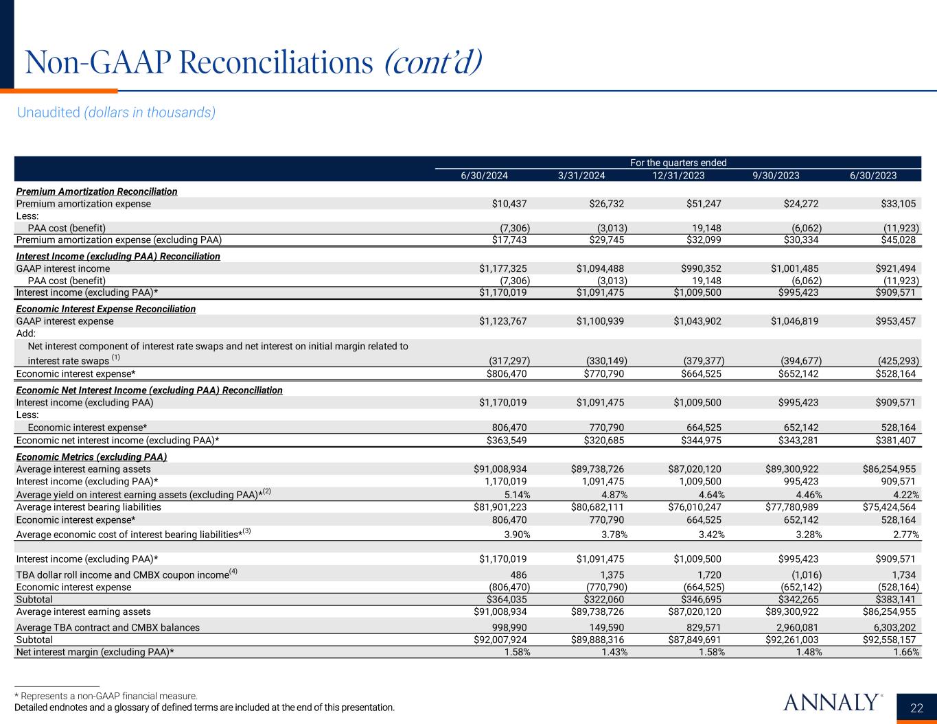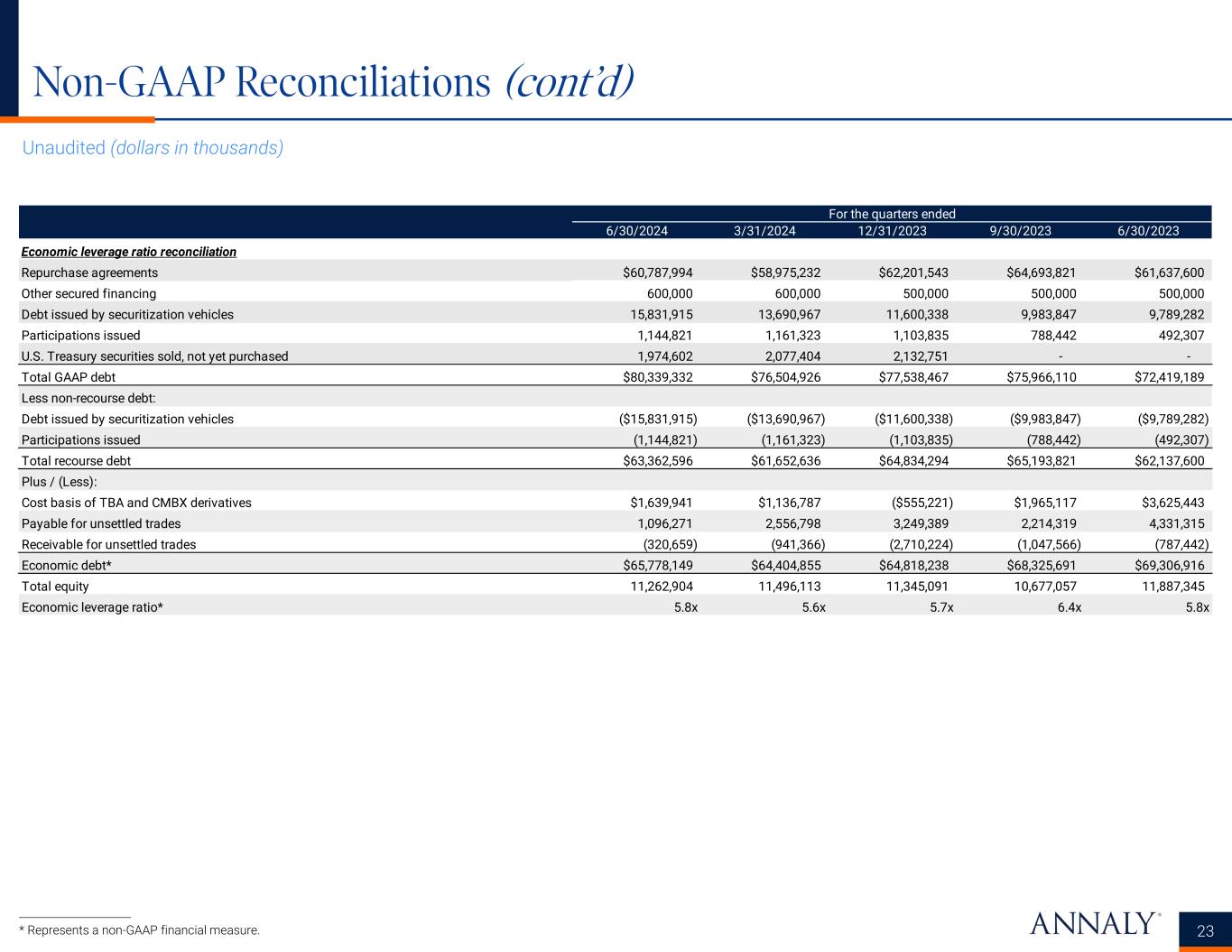 For the quarters ended 6/30/2024 3/31/2024 12/31/2023 9/30/2023 6/30/2023 Economic leverage ratio reconciliation Repurchase agreements $60,787,994 $58,975,232 $62,201,543 $64,693,821 $61,637,600 Other secured financing 600,000 600,000 500,000 500,000 500,000 Debt issued by securitization vehicles 15,831,915 13,690,967 11,600,338 9,983,847 9,789,282 Participations issued 1,144,821 1,161,323 1,103,835 788,442 492,307 U.S. Treasury securities sold, not yet purchased 1,974,602 2,077,404 2,132,751 - - Total GAAP debt $80,339,332 $76,504,926 $77,538,467 $75,966,110 $72,419,189 Less non-recourse debt: Debt issued by securitization vehicles ($15,831,915) ($13,690,967) ($11,600,338) ($9,983,847) ($9,789,282) Participations issued (1,144,821) (1,161,323) (1,103,835) (788,442) (492,307) Total recourse debt $63,362,596 $61,652,636 $64,834,294 $65,193,821 $62,137,600 Plus / (Less): Cost basis of TBA and CMBX derivatives $1,639,941 $1,136,787 ($555,221) $1,965,117 $3,625,443 Payable for unsettled trades 1,096,271 2,556,798 3,249,389 2,214,319 4,331,315 Receivable for unsettled trades (320,659) (941,366) (2,710,224) (1,047,566) (787,442) Economic debt* $65,778,149 $64,404,855 $64,818,238 $68,325,691 $69,306,916 Total equity 11,262,904 11,496,113 11,345,091 10,677,057 11,887,345 Economic leverage ratio* 5.8x 5.6x 5.7x 6.4x 5.8x Non-GAAP Reconciliations (cont’d) 23 Unaudited (dollars in thousands) * Represents a non-GAAP financial measure.