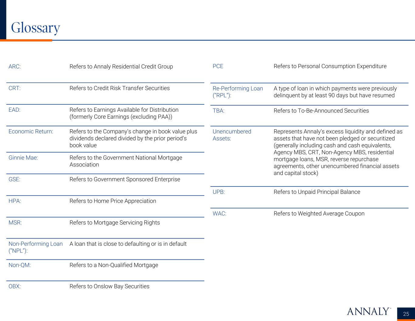 Glossary 25 ARC: Refers to Annaly Residential Credit Group CRT: Refers to Credit Risk Transfer Securities EAD: Refers to Earnings Available for Distribution (formerly Core Earnings (excluding PAA)) Economic Return: Refers to the Company’s change in book value plus dividends declared divided by the prior period’s book value Ginnie Mae: Refers to the Government National Mortgage Association GSE: Refers to Government Sponsored Enterprise HPA: Refers to Home Price Appreciation MSR: Refers to Mortgage Servicing Rights Non-Performing Loan (“NPL”): A loan that is close to defaulting or is in default Non-QM: Refers to a Non-Qualified Mortgage OBX: Refers to Onslow Bay Securities PCE Refers to Personal Consumption Expenditure Re-Performing Loan (“RPL”): A type of loan in which payments were previously delinquent by at least 90 days but have resumed TBA: Refers to To-Be-Announced Securities Unencumbered Assets: Represents Annaly’s excess liquidity and defined as assets that have not been pledged or securitized (generally including cash and cash equivalents, Agency MBS, CRT, Non-Agency MBS, residential mortgage loans, MSR, reverse repurchase agreements, other unencumbered financial assets and capital stock) UPB: Refers to Unpaid Principal Balance WAC: Refers to Weighted Average Coupon