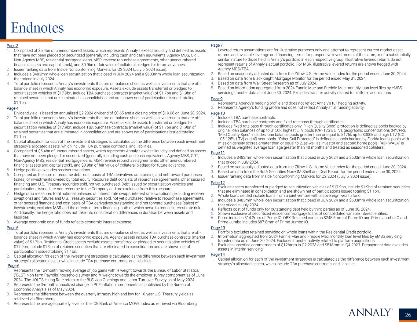 Endnotes 26 Page 3 1. Comprised of $5.4bn of unencumbered assets, which represents Annaly’s excess liquidity and defined as assets that have not been pledged or securitized (generally including cash and cash equivalents, Agency MBS, CRT, Non-Agency MBS, residential mortgage loans, MSR, reverse repurchase agreements, other unencumbered financial assets and capital stock), and $0.9bn of fair value of collateral pledged for future advances. 2. Issuer ranking data from Inside Nonconforming Markets for Q2 2024 (July 5, 2024 issue). 3. Includes a $483mm whole loan securitization that closed in July 2024 and a $603mm whole loan securitization that priced in July 2024. 4. Total portfolio represents Annaly’s investments that are on-balance sheet as well as investments that are off- balance sheet in which Annaly has economic exposure. Assets exclude assets transferred or pledged to securitization vehicles of $17.9bn, include TBA purchase contracts (market value) of $1.7bn and $1.9bn of retained securities that are eliminated in consolidation and are shown net of participations issued totaling $1.1bn. Page 4 1. Dividend yield is based on annualized Q2 2024 dividend of $0.65 and a closing price of $19.06 on June 28, 2024. 2. Total portfolio represents Annaly’s investments that are on-balance sheet as well as investments that are off- balance sheet in which Annaly has economic exposure. Assets exclude assets transferred or pledged to securitization vehicles of $17.9bn, include TBA purchase contracts (market value) of $1.7bn and $1.9bn of retained securities that are eliminated in consolidation and are shown net of participations issued totaling $1.1bn. 3. Capital allocation for each of the investment strategies is calculated as the difference between each investment strategy’s allocated assets, which include TBA purchase contracts, and liabilities. 4. Comprised of $5.4bn of unencumbered assets, which represents Annaly’s excess liquidity and defined as assets that have not been pledged or securitized (generally including cash and cash equivalents, Agency MBS, CRT, Non-Agency MBS, residential mortgage loans, MSR, reverse repurchase agreements, other unencumbered financial assets and capital stock), and $0.9bn of fair value of collateral pledged for future advances. 5. Hedge portfolio excludes receiver swaptions. 6. Computed as the sum of recourse debt, cost basis of TBA derivatives outstanding and net forward purchases (sales) of investments divided by total equity. Recourse debt consists of repurchase agreements, other secured financing and U.S. Treasury securities sold, not yet purchased. Debt issued by securitization vehicles and participations issued are non-recourse to the Company and are excluded from this measure. 7. Hedge ratio measures total notional balances of interest rate swaps, interest rate swaptions (excluding receiver swaptions) and futures and U.S. Treasury securities sold, not yet purchased relative to repurchase agreements, other secured financing and cost basis of TBA derivatives outstanding and net forward purchases (sales) of investments; excludes MSR and the effects of term financing, both of which serve to reduce interest rate risk. Additionally, the hedge ratio does not take into consideration differences in duration between assets and liabilities. 8. Average economic cost of funds reflects economic interest expense. Page 5 1. Total portfolio represents Annaly’s investments that are on-balance sheet as well as investments that are off- balance sheet in which Annaly has economic exposure. Agency assets include TBA purchase contracts (market value) of $1.7bn. Residential Credit assets exclude assets transferred or pledged to securitization vehicles of $17.9bn, include $1.9bn of retained securities that are eliminated in consolidation and are shown net of participations issued totaling $1.1bn. 2. Capital allocation for each of the investment strategies is calculated as the difference between each investment strategy’s allocated assets, which include TBA purchase contracts, and liabilities. Page 6 1. Represents the 12-month moving average of job gains with ¼ weight towards the Bureau of Labor Statistics’ (“BLS”) Non-farm Payrolls' household survey and ¾ weight towards the employer survey component as of June 2024. The JOLTS Hiring Rate refers to the BLS' Job Openings and Labor Turnover Survey as of May 2024. 2. Represents the 3-month annualized change in PCE inflation components as published by the Bureau of Economic Analysis as of May 2024. 3. Represents the difference between the quarterly intraday high and low for 10-year U.S. Treasury yields as retrieved via Bloomberg. 4. Represents the average quarterly level for the ICE Bank of America MOVE Index as retrieved via Bloomberg. Page 7 1. Levered return assumptions are for illustrative purposes only and attempt to represent current market asset returns and available leverage and financing terms for prospective investments of the same, or of a substantially similar, nature to those held in Annaly’s portfolio in each respective group. Illustrative levered returns do not represent returns of Annaly’s actual portfolio. For MSR, illustrative levered returns are shown hedged with Agency MBS/TBA. 2. Based on seasonally adjusted data from the Zillow U.S. Home Value Index for the period ended June 30, 2024. 3. Based on data from BlackKnight Mortgage Monitor for the period ended May 31, 2024. 4. Based on data from Wall Street Research as of July 2024. 5. Based on information aggregated from 2024 Fannie Mae and Freddie Mac monthly loan level files by eMBS servicing transfer data as of June 30, 2024. Excludes transfer activity related to platform acquisitions Page 9 1. Represents Agency's hedging profile and does not reflect Annaly's full hedging activity. 2. Represents Agency’s funding profile and does not reflect Annaly's full funding activity. Page 10 1. Includes TBA purchase contracts. 2. Includes TBA purchase