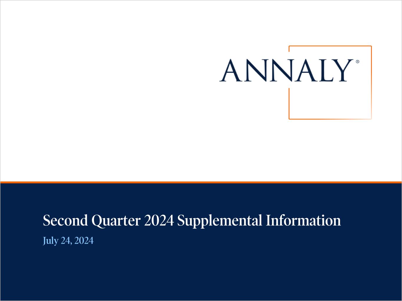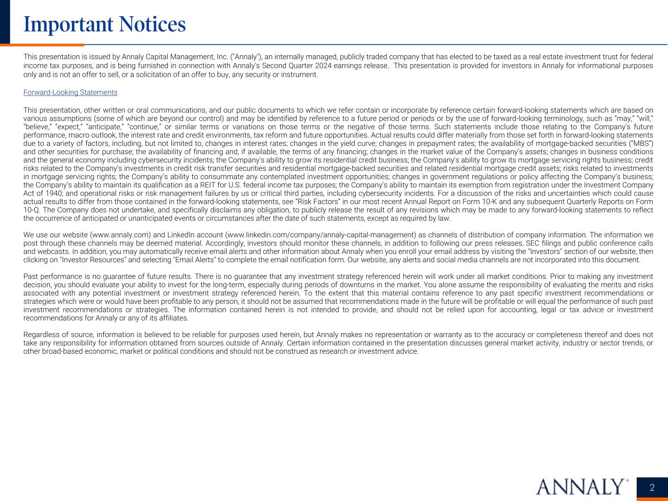 This presentation is issued by Annaly Capital Management, Inc. ("Annaly"), an internally managed, publicly traded company that has elected to be taxed as a real estate investment trust for federal income tax purposes, and is being furnished in connection with Annaly’s Second Quarter 2024 earnings release. This presentation is provided for investors in Annaly for informational purposes only and is not an offer to sell, or a solicitation of an offer to buy, any security or instrument. Forward-Looking Statements This presentation, other written or oral communications, and our public documents to which we refer contain or incorporate by reference certain forward-looking statements which are based on various assumptions (some of which are beyond our control) and may be identified by reference to a future period or periods or by the use of forward-looking terminology, such as “may,” “will,” “believe,” “expect,” “anticipate,” “continue,” or similar terms or variations on those terms or the negative of those terms. Such statements include those relating to the Company’s future performance, macro outlook, the interest rate and credit environments, tax reform and future opportunities. Actual results could differ materially from those set forth in forward-looking statements due to a variety of factors, including, but not limited to, changes in interest rates; changes in the yield curve; changes in prepayment rates; the availability of mortgage-backed securities (“MBS”) and other securities for purchase; the availability of financing and, if available, the terms of any financing; changes in the market value of the Company’s assets; changes in business conditions and the general economy including cybersecurity incidents; the Company’s ability to grow its residential credit business; the Company's ability to grow its mortgage servicing rights business; credit risks related to the Company’s investments in credit risk transfer securities and residential mortgage-backed securities and related residential mortgage credit assets; risks related to investments in mortgage servicing rights; the Company’s ability to consummate any contemplated investment opportunities; changes in government regulations or policy affecting the Company’s business; the Company’s ability to maintain its qualification as a REIT for U.S. federal income tax purposes; the Company’s ability to maintain its exemption from registration under the Investment Company Act of 1940; and operational risks or risk management failures by us or critical third parties, including cybersecurity incidents. For a discussion of the risks and uncertainties which could cause actual results to differ from those contained in the forward-looking statements, see “Risk Factors” in our most recent Annual Report on Form 10-K and any subsequent Quarterly Reports on Form 10-Q. The Company does not undertake, and specifically disclaims any obligation, to publicly release the result of any revisions which may be made to any forward-looking statements to reflect the occurrence of anticipated or unanticipated events or circumstances after the date of such statements, except as required by law. We use our website (www.annaly.com) and LinkedIn account (www.linkedin.com/company/annaly-capital-management) as channels of distribution of company information. The information we post through these channels may be deemed material. Accordingly, investors should monitor these channels, in addition to following our press releases, SEC filings and public conference calls and webcasts. In addition, you may automatically receive email alerts and other information about Annaly when you enroll your email address by visiting the "Investors" section of our website, then clicking on "Investor Resources" and selecting "Email Alerts" to complete the email notification form. Our website, any alerts and social media channels are not incorporated into this document. Past performance is no guarantee of future results. There is no guarantee that any investment strategy referenced herein will work under all market conditions. Prior to making any investment decision, you should evaluate your ability to invest for the long-term, especially during periods of downturns in the market. You alone assume the responsibility of evaluating the merits and risks associated with any potential investment or investment strategy referenced herein. To the extent that this material contains reference to any past specific investment recommendations or strategies which were or would have been profitable to any person, it should not be assumed that recommendations made in the future will be profitable or will equal the performance of such past investment recommendations or strategies. The information contained herein is not intended to provide, and should not be relied upon for accounting, legal or tax advice or investment recommendations for Annaly or any of its affiliates. Regardless of source, information is believed to be reliable for purposes used herein, but Annaly makes no representation or warranty as to the accuracy or completeness thereof and does not take any responsibility for information obtained from sources outside of Annaly. Certain information contained in the presentation discusses general market activity, industry or sector trends, or other broad-based economic, market or political conditions and should not be construed as research or investment advice. Important Notices 2