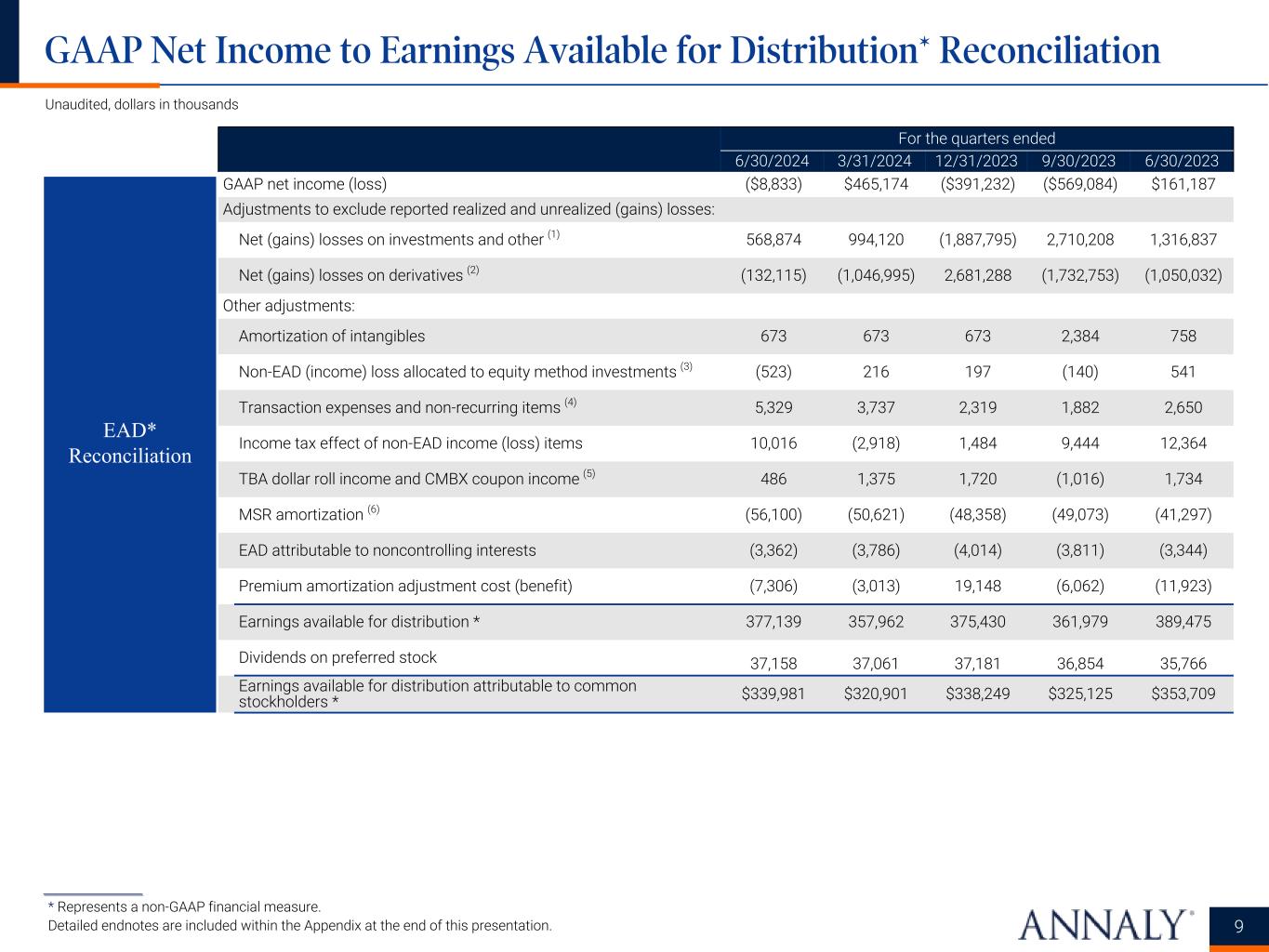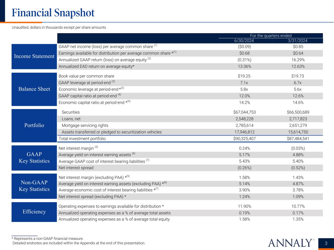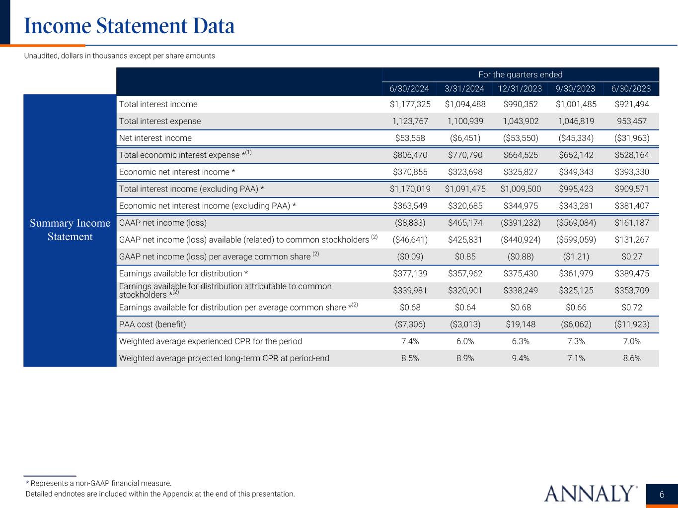 ___________________ * Represents a non-GAAP financial measure. Detailed endnotes are included within the Appendix at the end of this presentation. Unaudited, dollars in thousands except per share amounts For the quarters ended 6/30/2024 3/31/2024 12/31/2023 9/30/2023 6/30/2023 Total interest income $1,177,325 $1,094,488 $990,352 $1,001,485 $921,494 Total interest expense 1,123,767 1,100,939 1,043,902 1,046,819 953,457 Net interest income $53,558 ($6,451) ($53,550) ($45,334) ($31,963) Total economic interest expense *(1) $806,470 $770,790 $664,525 $652,142 $528,164 Economic net interest income * $370,855 $323,698 $325,827 $349,343 $393,330 Total interest income (excluding PAA) * $1,170,019 $1,091,475 $1,009,500 $995,423 $909,571 Economic net interest income (excluding PAA) * $363,549 $320,685 $344,975 $343,281 $381,407 GAAP net income (loss) ($8,833) $465,174 ($391,232) ($569,084) $161,187 GAAP net income (loss) available (related) to common stockholders (2) ($46,641) $425,831 ($440,924) ($599,059) $131,267 GAAP net income (loss) per average common share (2) ($0.09) $0.85 ($0.88) ($1.21) $0.27 Earnings available for distribution * $377,139 $357,962 $375,430 $361,979 $389,475 Earnings available for distribution attributable to common stockholders *(2) $339,981 $320,901 $338,249 $325,125 $353,709 Earnings available for distribution per average common share *(2) $0.68 $0.64 $0.68 $0.66 $0.72 PAA cost (benefit) ($7,306) ($3,013) $19,148 ($6,062) ($11,923) Weighted average experienced CPR for the period 7.4% 6.0% 6.3% 7.3% 7.0% Weighted average projected long-term CPR at period-end 8.5% 8.9% 9.4% 7.1% 8.6% Income Statement Data Summary Income Statement 6