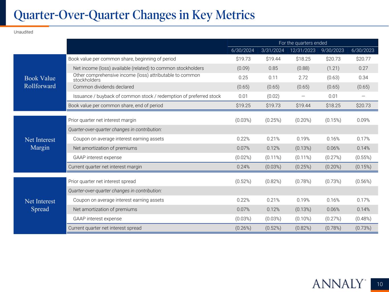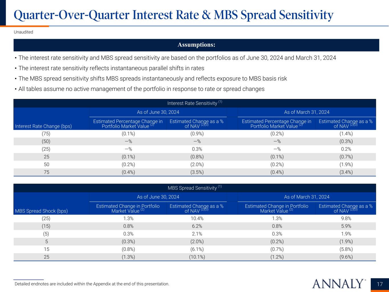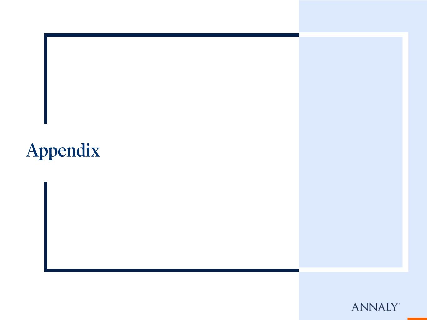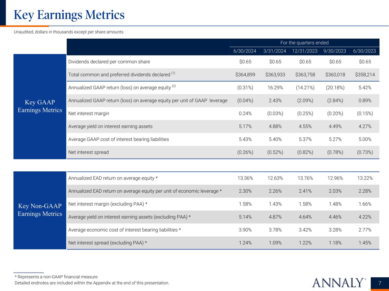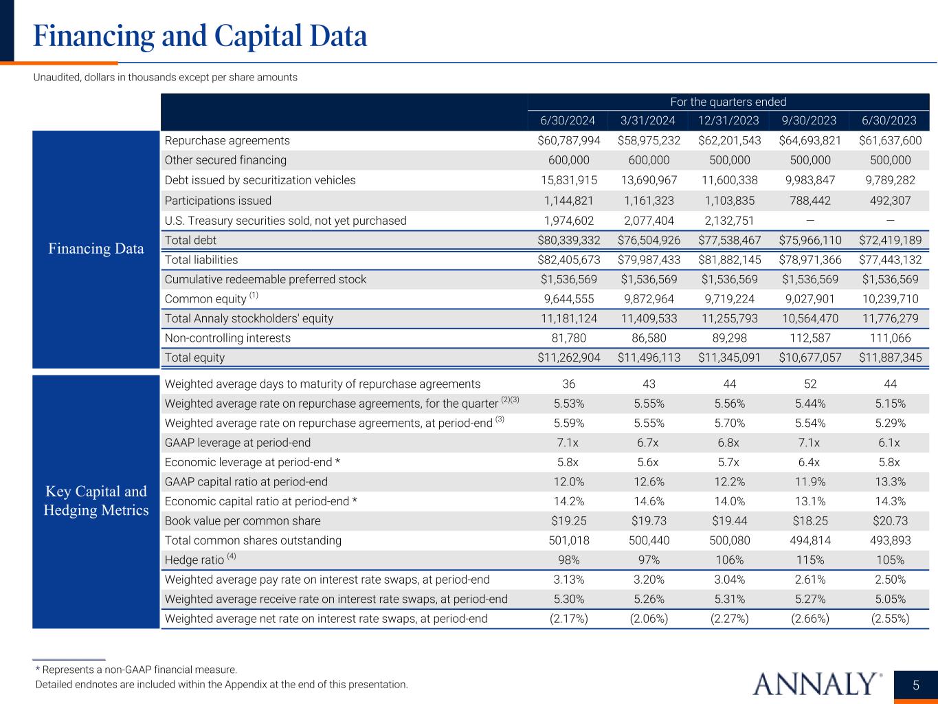 ___________________ * Represents a non-GAAP financial measure. Detailed endnotes are included within the Appendix at the end of this presentation. Financing and Capital Data For the quarters ended 6/30/2024 3/31/2024 12/31/2023 9/30/2023 6/30/2023 Repurchase agreements $60,787,994 $58,975,232 $62,201,543 $64,693,821 $61,637,600 Other secured financing 600,000 600,000 500,000 500,000 500,000 Debt issued by securitization vehicles 15,831,915 13,690,967 11,600,338 9,983,847 9,789,282 Participations issued 1,144,821 1,161,323 1,103,835 788,442 492,307 U.S. Treasury securities sold, not yet purchased 1,974,602 2,077,404 2,132,751 — — Total debt $80,339,332 $76,504,926 $77,538,467 $75,966,110 $72,419,189 Total liabilities $82,405,673 $79,987,433 $81,882,145 $78,971,366 $77,443,132 Cumulative redeemable preferred stock $1,536,569 $1,536,569 $1,536,569 $1,536,569 $1,536,569 Common equity (1) 9,644,555 9,872,964 9,719,224 9,027,901 10,239,710 Total Annaly stockholders' equity 11,181,124 11,409,533 11,255,793 10,564,470 11,776,279 Non-controlling interests 81,780 86,580 89,298 112,587 111,066 Total equity $11,262,904 $11,496,113 $11,345,091 $10,677,057 $11,887,345 Weighted average days to maturity of repurchase agreements 36 43 44 52 44 Weighted average rate on repurchase agreements, for the quarter (2)(3) 5.53% 5.55% 5.56% 5.44% 5.15% Weighted average rate on repurchase agreements, at period-end (3) 5.59% 5.55% 5.70% 5.54% 5.29% GAAP leverage at period-end 7.1x 6.7x 6.8x 7.1x 6.1x Economic leverage at period-end * 5.8x 5.6x 5.7x 6.4x 5.8x GAAP capital ratio at period-end 12.0% 12.6% 12.2% 11.9% 13.3% Economic capital ratio at period-end * 14.2% 14.6% 14.0% 13.1% 14.3% Book value per common share $19.25 $19.73 $19.44 $18.25 $20.73 Total common shares outstanding 501,018 500,440 500,080 494,814 493,893 Hedge ratio (4) 98% 97% 106% 115% 105% Weighted average pay rate on interest rate swaps, at period-end 3.13% 3.20% 3.04% 2.61% 2.50% Weighted average receive rate on interest rate swaps, at period-end 5.30% 5.26% 5.31% 5.27% 5.05% Weighted average net rate on interest rate swaps, at period-end (2.17%) (2.06%) (2.27%) (2.66%) (2.55%) Unaudited, dollars in thousands except per share amounts Financing Data Key Capital and Hedging Metrics 5