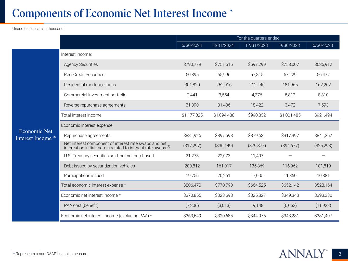 For the quarters ended 6/30/2024 3/31/2024 12/31/2023 9/30/2023 6/30/2023 Interest income: Agency Securities $790,779 $751,516 $697,299 $753,007 $686,912 Resi Credit Securities 50,895 55,996 57,815 57,229 56,477 Residential mortgage loans 301,820 252,016 212,440 181,965 162,202 Commercial investment portfolio 2,441 3,554 4,376 5,812 8,310 Reverse repurchase agreements 31,390 31,406 18,422 3,472 7,593 Total interest income $1,177,325 $1,094,488 $990,352 $1,001,485 $921,494 Economic interest expense: Repurchase agreements $881,926 $897,598 $879,531 $917,997 $841,257 Net interest component of interest rate swaps and net interest on initial margin related to interest rate swaps (1) (317,297) (330,149) (379,377) (394,677) (425,293) U.S. Treasury securities sold, not yet purchased 21,273 22,073 11,497 — — Debt issued by securitization vehicles 200,812 161,017 135,869 116,962 101,819 Participations issued 19,756 20,251 17,005 11,860 10,381 Total economic interest expense * $806,470 $770,790 $664,525 $652,142 $528,164 Economic net interest income * $370,855 $323,698 $325,827 $349,343 $393,330 PAA cost (benefit) (7,306) (3,013) 19,148 (6,062) (11,923) Economic net interest income (excluding PAA) * $363,549 $320,685 $344,975 $343,281 $381,407 Components of Economic Net Interest Income * Unaudited, dollars in thousands ___________________ * Represents a non-GAAP financial measure. Economic Net Interest Income * 8