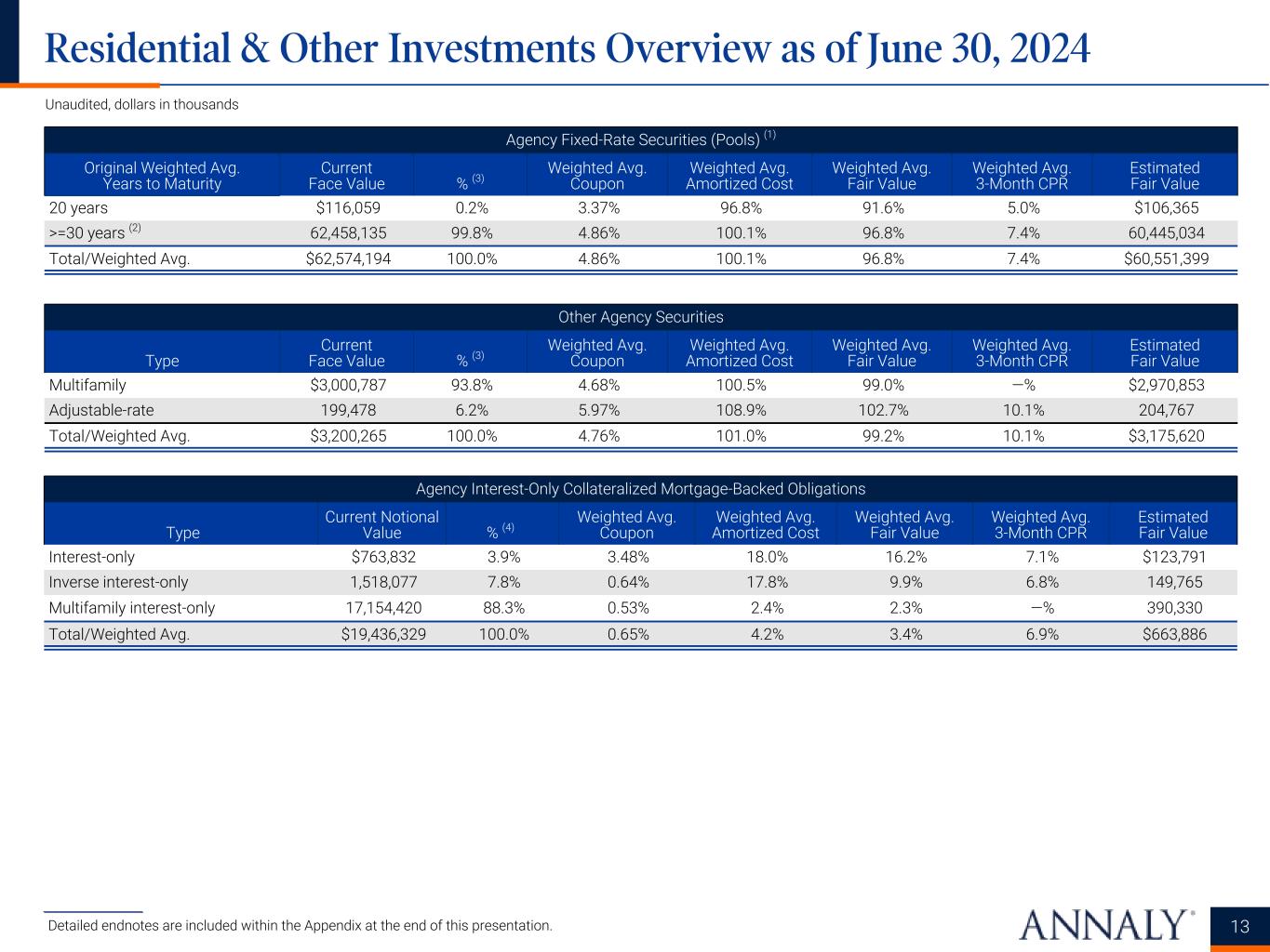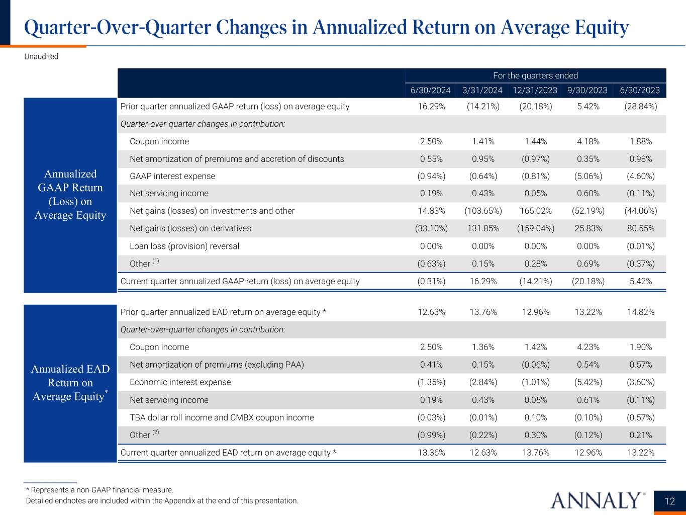 For the quarters ended 6/30/2024 3/31/2024 12/31/2023 9/30/2023 6/30/2023 Prior quarter annualized GAAP return (loss) on average equity 16.29% (14.21%) (20.18%) 5.42% (28.84%) Quarter-over-quarter changes in contribution: Coupon income 2.50% 1.41% 1.44% 4.18% 1.88% Net amortization of premiums and accretion of discounts 0.55% 0.95% (0.97%) 0.35% 0.98% GAAP interest expense (0.94%) (0.64%) (0.81%) (5.06%) (4.60%) Net servicing income 0.19% 0.43% 0.05% 0.60% (0.11%) Net gains (losses) on investments and other 14.83% (103.65%) 165.02% (52.19%) (44.06%) Net gains (losses) on derivatives (33.10%) 131.85% (159.04%) 25.83% 80.55% Loan loss (provision) reversal 0.00% 0.00% 0.00% 0.00% (0.01%) Other (1) (0.63%) 0.15% 0.28% 0.69% (0.37%) Current quarter annualized GAAP return (loss) on average equity (0.31%) 16.29% (14.21%) (20.18%) 5.42% Prior quarter annualized EAD return on average equity * 12.63% 13.76% 12.96% 13.22% 14.82% Quarter-over-quarter changes in contribution: Coupon income 2.50% 1.36% 1.42% 4.23% 1.90% Net amortization of premiums (excluding PAA) 0.41% 0.15% (0.06%) 0.54% 0.57% Economic interest expense (1.35%) (2.84%) (1.01%) (5.42%) (3.60%) Net servicing income 0.19% 0.43% 0.05% 0.61% (0.11%) TBA dollar roll income and CMBX coupon income (0.03%) (0.01%) 0.10% (0.10%) (0.57%) Other (2) (0.99%) (0.22%) 0.30% (0.12%) 0.21% Current quarter annualized EAD return on average equity * 13.36% 12.63% 13.76% 12.96% 13.22% 12 Unaudited Quarter-Over-Quarter Changes in Annualized Return on Average Equity ___________________ * Represents a non-GAAP financial measure. Detailed endnotes are included within the Appendix at the end of this presentation. Annualized GAAP Return (Loss) on Average Equity Annualized EAD Return on Average Equity*