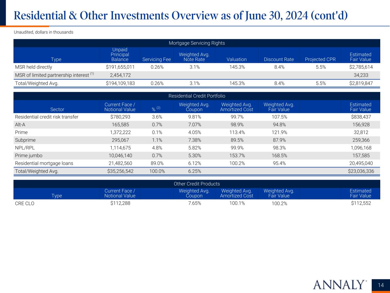 ___________________ Detailed endnotes are included within the Appendix at the end of this presentation. Agency Fixed-Rate Securities (Pools) (1) Original Weighted Avg. Years to Maturity Current Face Value % (3) Weighted Avg. Coupon Weighted Avg. Amortized Cost Weighted Avg. Fair Value Weighted Avg. 3-Month CPR Estimated Fair Value 20 years $116,059 0.2% 3.37% 96.8% 91.6% 5.0% $106,365 >=30 years (2) 62,458,135 99.8% 4.86% 100.1% 96.8% 7.4% 60,445,034 Total/Weighted Avg. $62,574,194 100.0% 4.86% 100.1% 96.8% 7.4% $60,551,399 Other Agency Securities Type Current Face Value % (3) Weighted Avg. Coupon Weighted Avg. Amortized Cost Weighted Avg. Fair Value Weighted Avg. 3-Month CPR Estimated Fair Value Multifamily $3,000,787 93.8% 4.68% 100.5% 99.0% —% $2,970,853 Adjustable-rate 199,478 6.2% 5.97% 108.9% 102.7% 10.1% 204,767 Total/Weighted Avg. $3,200,265 100.0% 4.76% 101.0% 99.2% 10.1% $3,175,620 Agency Interest-Only Collateralized Mortgage-Backed Obligations Type Current Notional Value % (4) Weighted Avg. Coupon Weighted Avg. Amortized Cost Weighted Avg. Fair Value Weighted Avg. 3-Month CPR Estimated Fair Value Interest-only $763,832 3.9% 3.48% 18.0% 16.2% 7.1% $123,791 Inverse interest-only 1,518,077 7.8% 0.64% 17.8% 9.9% 6.8% 149,765 Multifamily interest-only 17,154,420 88.3% 0.53% 2.4% 2.3% —% 390,330 Total/Weighted Avg. $19,436,329 100.0% 0.65% 4.2% 3.4% 6.9% $663,886 13 Residential & Other Investments Overview as of June 30, 2024 Unaudited, dollars in thousands