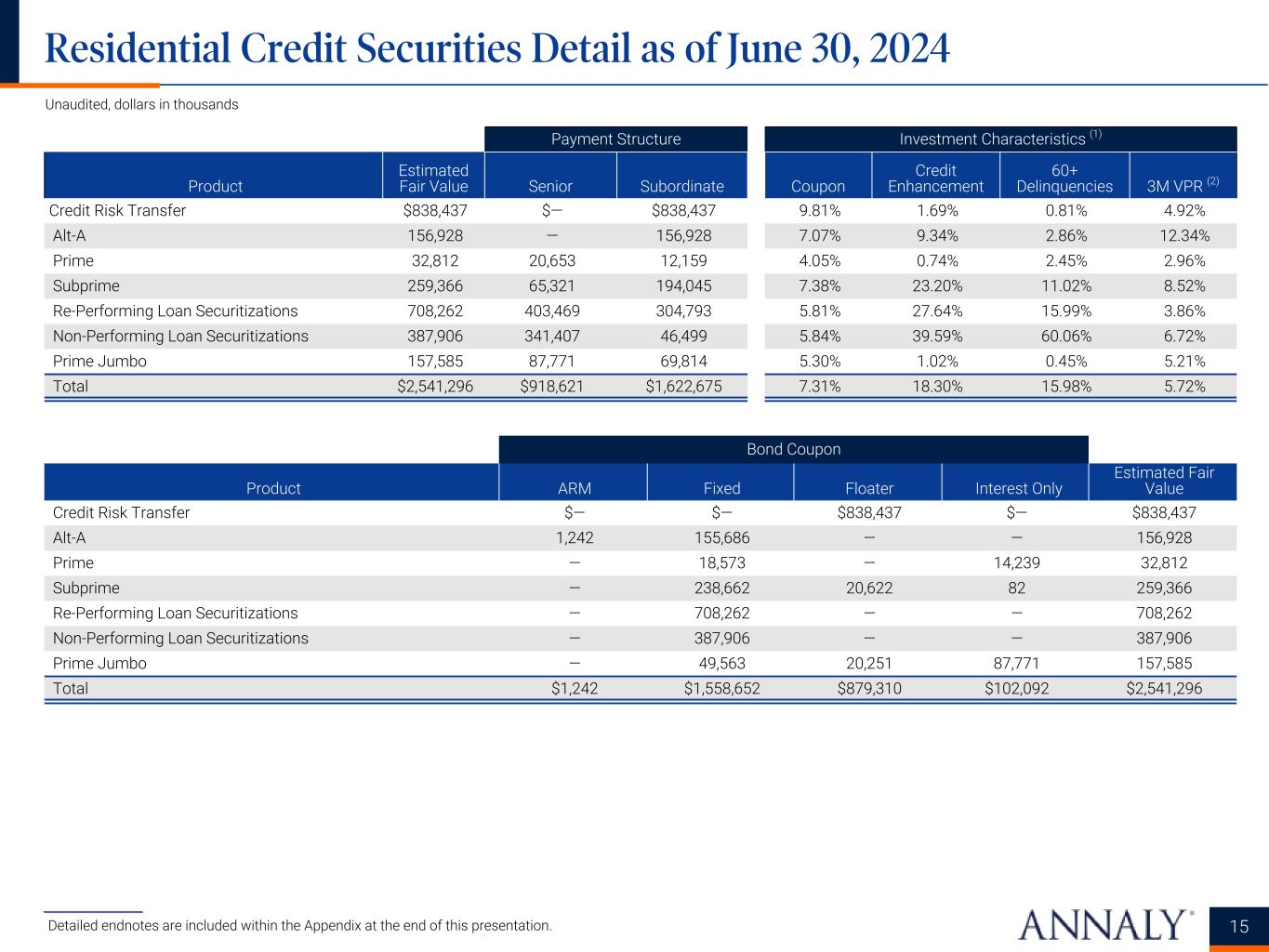 Mortgage Servicing Rights Type Unpaid Principal Balance Servicing Fee Weighted Avg. Note Rate Valuation Discount Rate Projected CPR Estimated Fair Value MSR held directly $191,655,011 0.26% 3.1% 145.3% 8.4% 5.5% $2,785,614 MSR of limited partnership interest (1) 2,454,172 34,233 Total/Weighted Avg. $194,109,183 0.26% 3.1% 145.3% 8.4% 5.5% $2,819,847 Residential Credit Portfolio Sector Current Face / Notional Value % (2) Weighted Avg. Coupon Weighted Avg. Amortized Cost Weighted Avg. Fair Value Estimated Fair Value Residential credit risk transfer $780,293 3.6% 9.81% 99.7% 107.5% $838,437 Alt-A 165,585 0.7% 7.07% 98.9% 94.8% 156,928 Prime 1,372,222 0.1% 4.05% 113.4% 121.9% 32,812 Subprime 295,067 1.1% 7.38% 89.5% 87.9% 259,366 NPL/RPL 1,114,675 4.8% 5.82% 99.9% 98.3% 1,096,168 Prime jumbo 10,046,140 0.7% 5.30% 153.7% 168.5% 157,585 Residential mortgage loans 21,482,560 89.0% 6.12% 100.2% 95.4% 20,495,040 Total/Weighted Avg. $35,256,542 100.0% 6.25% $23,036,336 Other Credit Products Type Current Face / Notional Value Weighted Avg. Coupon Weighted Avg. Amortized Cost Weighted Avg. Fair Value Estimated Fair Value CRE CLO $112,288 7.65% 100.1% 100.2% $112,552 14 Residential & Other Investments Overview as of June 30, 2024 (cont'd) Unaudited, dollars in thousands