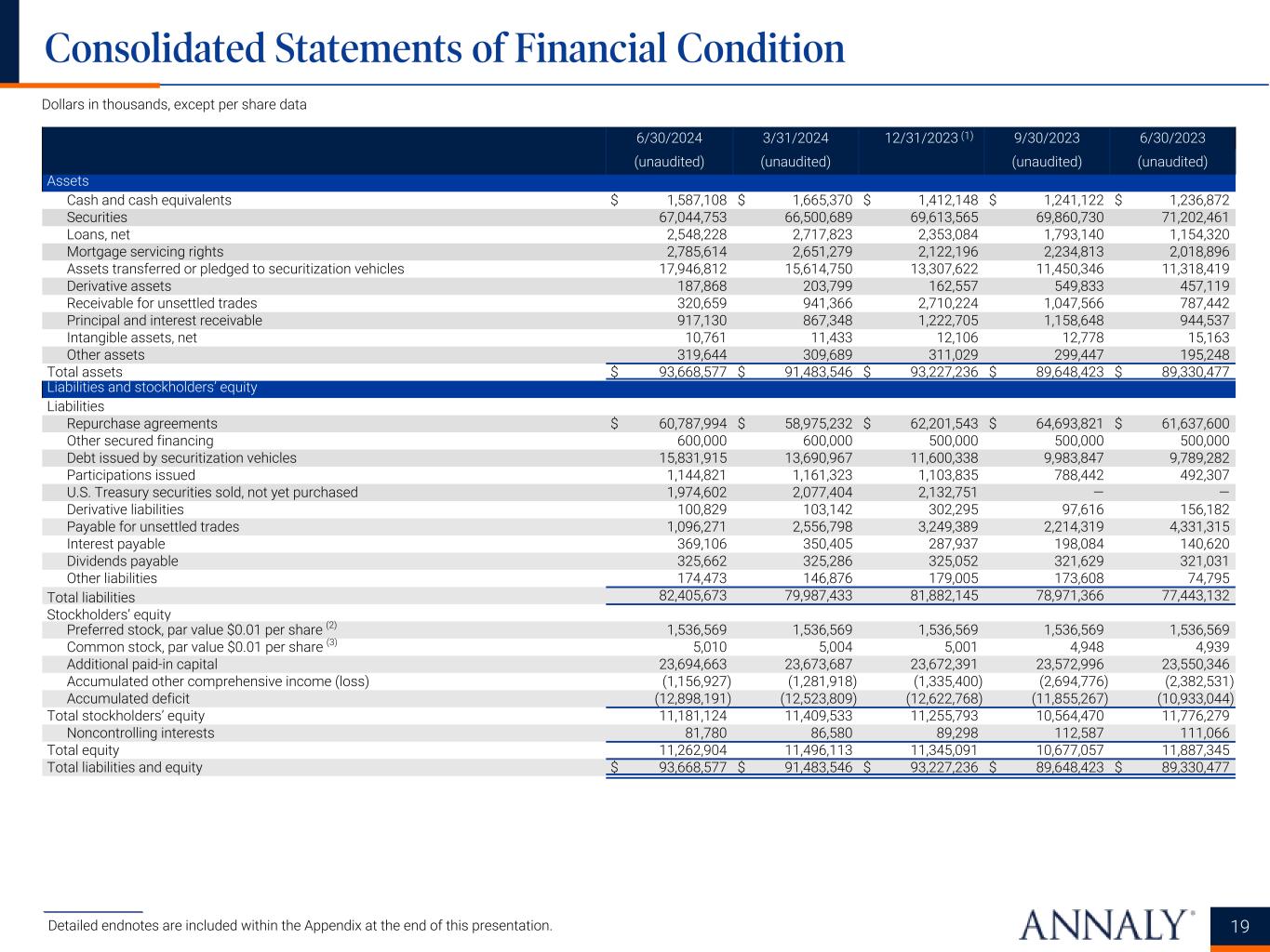 6/30/2024 3/31/2024 12/31/2023 9/30/2023 6/30/2023 (unaudited) (unaudited) (unaudited) (unaudited) Assets Cash and cash equivalents $ 1,587,108 $ 1,665,370 $ 1,412,148 $ 1,241,122 $ 1,236,872 Securities 67,044,753 66,500,689 69,613,565 69,860,730 71,202,461 Loans, net 2,548,228 2,717,823 2,353,084 1,793,140 1,154,320 Mortgage servicing rights 2,785,614 2,651,279 2,122,196 2,234,813 2,018,896 Assets transferred or pledged to securitization vehicles 17,946,812 15,614,750 13,307,622 11,450,346 11,318,419 Derivative assets 187,868 203,799 162,557 549,833 457,119 Receivable for unsettled trades 320,659 941,366 2,710,224 1,047,566 787,442 Principal and interest receivable 917,130 867,348 1,222,705 1,158,648 944,537 Intangible assets, net 10,761 11,433 12,106 12,778 15,163 Other assets 319,644 309,689 311,029 299,447 195,248 Total assets $ 93,668,577 $ 91,483,546 $ 93,227,236 $ 89,648,423 $ 89,330,477 Liabilities and stockholders’ equity Liabilities Repurchase agreements $ 60,787,994 $ 58,975,232 $ 62,201,543 $ 64,693,821 $ 61,637,600 Other secured financing 600,000 600,000 500,000 500,000 500,000 Debt issued by securitization vehicles 15,831,915 13,690,967 11,600,338 9,983,847 9,789,282 Participations issued 1,144,821 1,161,323 1,103,835 788,442 492,307 U.S. Treasury securities sold, not yet purchased 1,974,602 2,077,404 2,132,751 — — Derivative liabilities 100,829 103,142 302,295 97,616 156,182 Payable for unsettled trades 1,096,271 2,556,798 3,249,389 2,214,319 4,331,315 Interest payable 369,106 350,405 287,937 198,084 140,620 Dividends payable 325,662 325,286 325,052 321,629 321,031 Other liabilities 174,473 146,876 179,005 173,608 74,795 Total liabilities 82,405,673 79,987,433 81,882,145 78,971,366 77,443,132 Stockholders’ equity Preferred stock, par value $0.01 per share (2) 1,536,569 1,536,569 1,536,569 1,536,569 1,536,569 Common stock, par value $0.01 per share (3) 5,010 5,004 5,001 4,948 4,939 Additional paid-in capital 23,694,663 23,673,687 23,672,391 23,572,996 23,550,346 Accumulated other comprehensive income (loss) (1,156,927) (1,281,918) (1,335,400) (2,694,776) (2,382,531) Accumulated deficit (12,898,191) (12,523,809) (12,622,768) (11,855,267) (10,933,044) Total stockholders’ equity 11,181,124 11,409,533 11,255,793 10,564,470 11,776,279 Noncontrolling interests 81,780 86,580 89,298 112,587 111,066 Total equity 11,262,904 11,496,113 11,345,091 10,677,057 11,887,345 Total liabilities and equity $ 93,668,577 $ 91,483,546 $ 93,227,236 $ 89,648,423 $ 89,330,477 (1) 19 Dollars in thousands, except per share data Consolidated Statements of Financial Condition ___________________ Detailed endnotes are included within the Appendix at the end of this presentation.