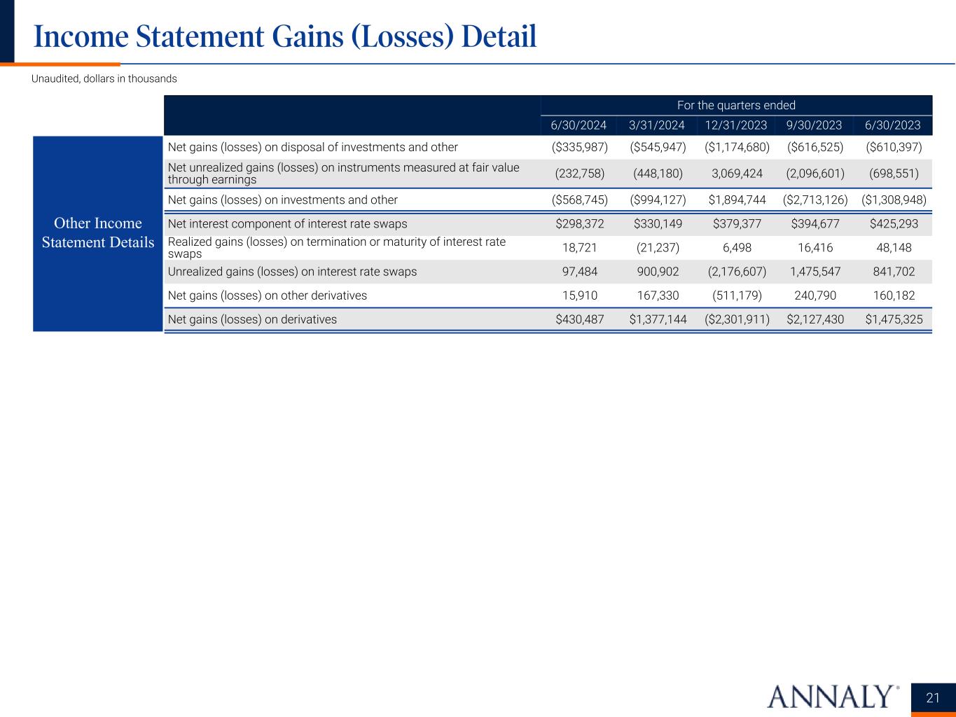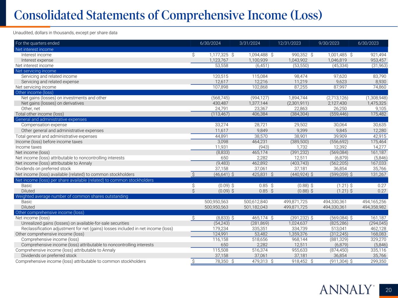 For the quarters ended 6/30/2024 3/31/2024 12/31/2023 9/30/2023 6/30/2023 Net interest income Interest income $ 1,177,325 $ 1,094,488 $ 990,352 $ 1,001,485 $ 921,494 Interest expense 1,123,767 1,100,939 1,043,902 1,046,819 953,457 Net interest income 53,558 (6,451) (53,550) (45,334) (31,963) Net servicing income Servicing and related income 120,515 115,084 98,474 97,620 83,790 Servicing and related expense 12,617 12,216 11,219 9,623 8,930 Net servicing income 107,898 102,868 87,255 87,997 74,860 Other income (loss) Net gains (losses) on investments and other (568,745) (994,127) 1,894,744 (2,713,126) (1,308,948) Net gains (losses) on derivatives 430,487 1,377,144 (2,301,911) 2,127,430 1,475,325 Other, net 24,791 23,367 22,863 26,250 9,105 Total other income (loss) (113,467) 406,384 (384,304) (559,446) 175,482 General and administrative expenses Compensation expense 33,274 28,721 29,502 30,064 30,635 Other general and administrative expenses 11,617 9,849 9,399 9,845 12,280 Total general and administrative expenses 44,891 38,570 38,901 39,909 42,915 Income (loss) before income taxes 3,098 464,231 (389,500) (556,692) 175,464 Income taxes 11,931 (943) 1,732 12,392 14,277 Net income (loss) (8,833) 465,174 (391,232) (569,084) 161,187 Net income (loss) attributable to noncontrolling interests 650 2,282 12,511 (6,879) (5,846) Net income (loss) attributable to Annaly (9,483) 462,892 (403,743) (562,205) 167,033 Dividends on preferred stock 37,158 37,061 37,181 36,854 35,766 Net income (loss) available (related) to common stockholders $ (46,641) $ 425,831 $ (440,924) $ (599,059) $ 131,267 Net income (loss) per share available (related) to common stockholders Basic $ (0.09) $ 0.85 $ (0.88) $ (1.21) $ 0.27 Diluted $ (0.09) $ 0.85 $ (0.88) $ (1.21) $ 0.27 Weighted average number of common shares outstanding Basic 500,950,563 500,612,840 499,871,725 494,330,361 494,165,256 Diluted 500,950,563 501,182,043 499,871,725 494,330,361 494,358,982 Other comprehensive income (loss) Net income (loss) $ (8,833) $ 465,174 $ (391,232) $ (569,084) $ 161,187 Unrealized gains (losses) on available-for-sale securities (54,243) (281,869) 1,024,637 (825,286) (294,045) Reclassification adjustment for net (gains) losses included in net income (loss) 179,234 335,351 334,739 513,041 462,128 Other comprehensive income (loss) 124,991 53,482 1,359,376 (312,245) 168,083 Comprehensive income (loss) 116,158 518,656 968,144 (881,329) 329,270 Comprehensive income (loss) attributable to noncontrolling interests 650 2,282 12,511 (6,879) (5,846) Comprehensive income (loss) attributable to Annaly 115,508 516,374 955,633 (874,450) 335,116 Dividends on preferred stock 37,158 37,061 37,181 36,854 35,766 Comprehensive income (loss) attributable to common stockholders $ 78,350 $ 479,313 $ 918,452 $ (911,304) $ 299,350 20 Unaudited, dollars in thousands, except per share data Consolidated Statements of Comprehensive Income (Loss)