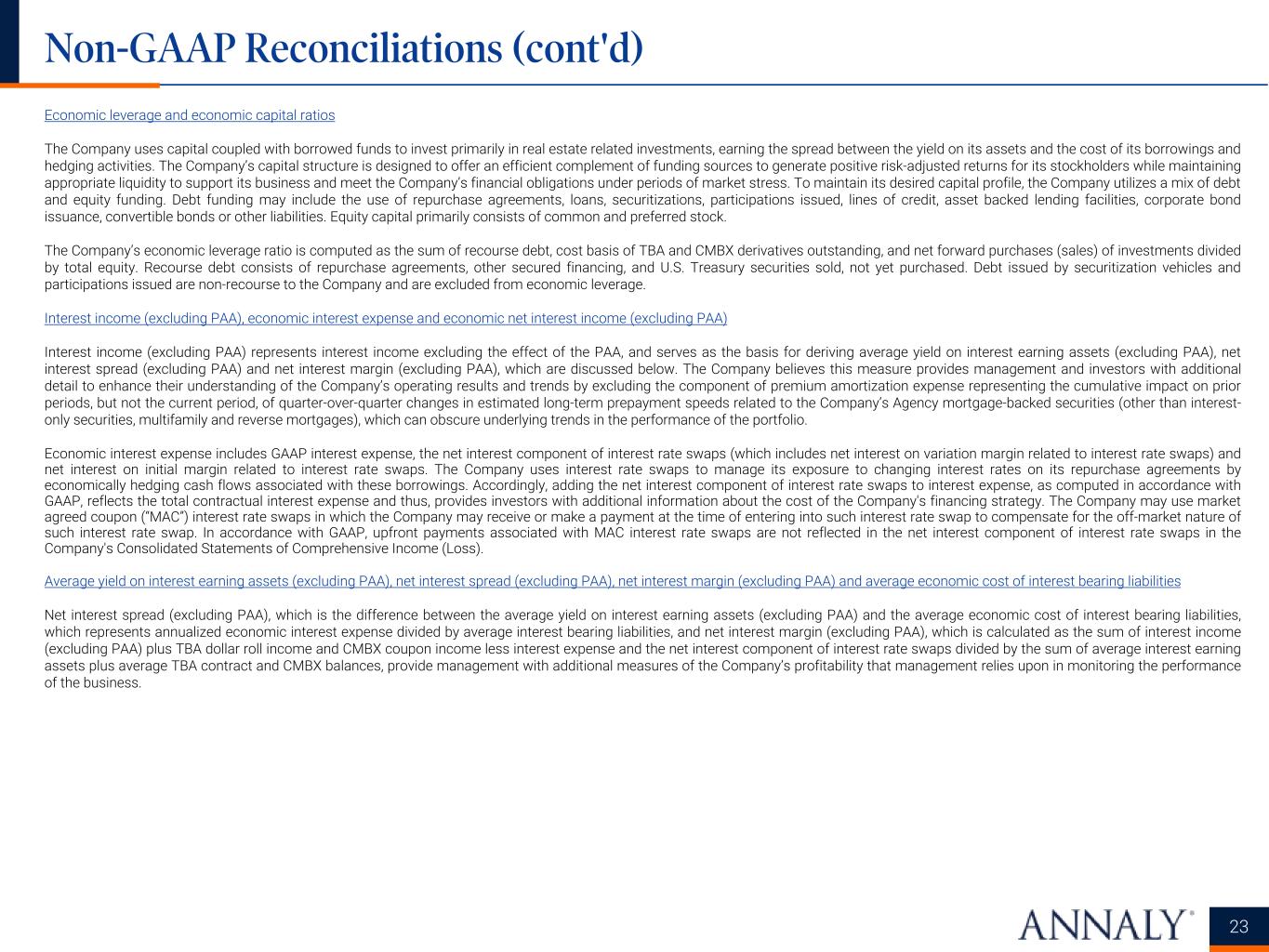 Economic leverage and economic capital ratios The Company uses capital coupled with borrowed funds to invest primarily in real estate related investments, earning the spread between the yield on its assets and the cost of its borrowings and hedging activities. The Company’s capital structure is designed to offer an efficient complement of funding sources to generate positive risk-adjusted returns for its stockholders while maintaining appropriate liquidity to support its business and meet the Company’s financial obligations under periods of market stress. To maintain its desired capital profile, the Company utilizes a mix of debt and equity funding. Debt funding may include the use of repurchase agreements, loans, securitizations, participations issued, lines of credit, asset backed lending facilities, corporate bond issuance, convertible bonds or other liabilities. Equity capital primarily consists of common and preferred stock. The Company’s economic leverage ratio is computed as the sum of recourse debt, cost basis of TBA and CMBX derivatives outstanding, and net forward purchases (sales) of investments divided by total equity. Recourse debt consists of repurchase agreements, other secured financing, and U.S. Treasury securities sold, not yet purchased. Debt issued by securitization vehicles and participations issued are non-recourse to the Company and are excluded from economic leverage. Interest income (excluding PAA), economic interest expense and economic net interest income (excluding PAA) Interest income (excluding PAA) represents interest income excluding the effect of the PAA, and serves as the basis for deriving average yield on interest earning assets (excluding PAA), net interest spread (excluding PAA) and net interest margin (excluding PAA), which are discussed below. The Company believes this measure provides management and investors with additional detail to enhance their understanding of the Company’s operating results and trends by excluding the component of premium amortization expense representing the cumulative impact on prior periods, but not the current period, of quarter-over-quarter changes in estimated long-term prepayment speeds related to the Company’s Agency mortgage-backed securities (other than interest- only securities, multifamily and reverse mortgages), which can obscure underlying trends in the performance of the portfolio. Economic interest expense includes GAAP interest expense, the net interest component of interest rate swaps (which includes net interest on variation margin related to interest rate swaps) and net interest on initial margin related to interest rate swaps. The Company uses interest rate swaps to manage its exposure to changing interest rates on its repurchase agreements by economically hedging cash flows associated with these borrowings. Accordingly, adding the net interest component of interest rate swaps to interest expense, as computed in accordance with GAAP, reflects the total contractual interest expense and thus, provides investors with additional information about the cost of the Company's financing strategy. The Company may use market agreed coupon (“MAC”) interest rate swaps in which the Company may receive or make a payment at the time of entering into such interest rate swap to compensate for the off-market nature of such interest rate swap. In accordance with GAAP, upfront payments associated with MAC interest rate swaps are not reflected in the net interest component of interest rate swaps in the Company's Consolidated Statements of Comprehensive Income (Loss). Average yield on interest earning assets (excluding PAA), net interest spread (excluding PAA), net interest margin (excluding PAA) and average economic cost of interest bearing liabilities Net interest spread (excluding PAA), which is the difference between the average yield on interest earning assets (excluding PAA) and the average economic cost of interest bearing liabilities, which represents annualized economic interest expense divided by average interest bearing liabilities, and net interest margin (excluding PAA), which is calculated as the sum of interest income (excluding PAA) plus TBA dollar roll income and CMBX coupon income less interest expense and the net interest component of interest rate swaps divided by the sum of average interest earning assets plus average TBA contract and CMBX balances, provide management with additional measures of the Company’s profitability that management relies upon in monitoring the performance of the business. 23 Non-GAAP Reconciliations (cont'd)