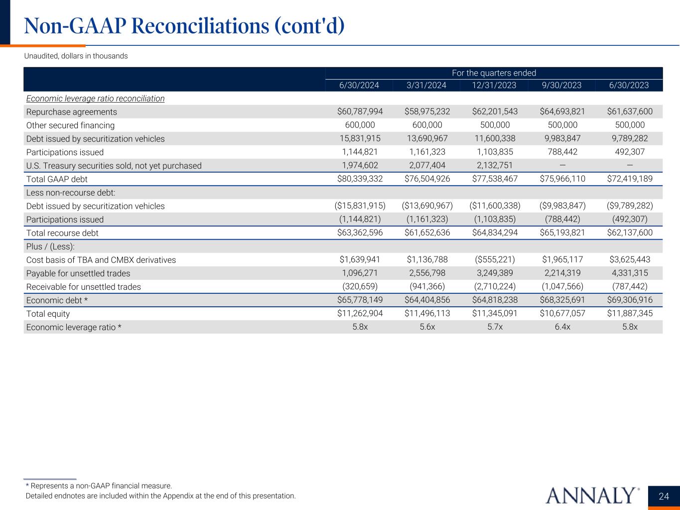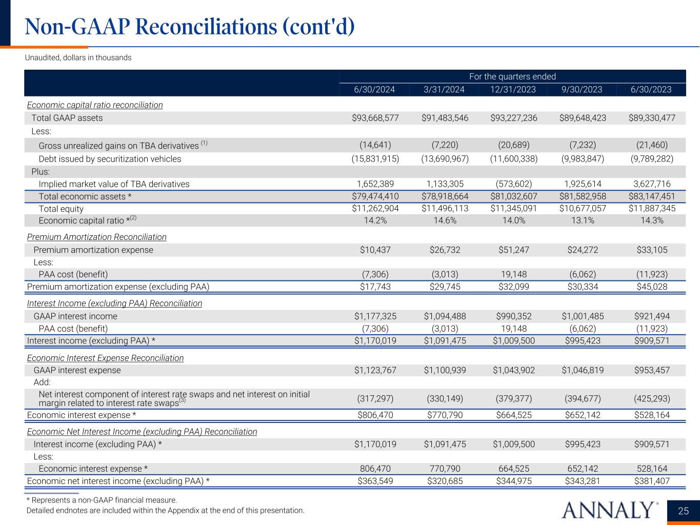 For the quarters ended 6/30/2024 3/31/2024 12/31/2023 9/30/2023 6/30/2023 Economic leverage ratio reconciliation Repurchase agreements $60,787,994 $58,975,232 $62,201,543 $64,693,821 $61,637,600 Other secured financing 600,000 600,000 500,000 500,000 500,000 Debt issued by securitization vehicles 15,831,915 13,690,967 11,600,338 9,983,847 9,789,282 Participations issued 1,144,821 1,161,323 1,103,835 788,442 492,307 U.S. Treasury securities sold, not yet purchased 1,974,602 2,077,404 2,132,751 — — Total GAAP debt $80,339,332 $76,504,926 $77,538,467 $75,966,110 $72,419,189 Less non-recourse debt: Debt issued by securitization vehicles ($15,831,915) ($13,690,967) ($11,600,338) ($9,983,847) ($9,789,282) Participations issued (1,144,821) (1,161,323) (1,103,835) (788,442) (492,307) Total recourse debt $63,362,596 $61,652,636 $64,834,294 $65,193,821 $62,137,600 Plus / (Less): Cost basis of TBA and CMBX derivatives $1,639,941 $1,136,788 ($555,221) $1,965,117 $3,625,443 Payable for unsettled trades 1,096,271 2,556,798 3,249,389 2,214,319 4,331,315 Receivable for unsettled trades (320,659) (941,366) (2,710,224) (1,047,566) (787,442) Economic debt * $65,778,149 $64,404,856 $64,818,238 $68,325,691 $69,306,916 Total equity $11,262,904 $11,496,113 $11,345,091 $10,677,057 $11,887,345 Economic leverage ratio * 5.8x 5.6x 5.7x 6.4x 5.8x 24 Non-GAAP Reconciliations (cont'd) ___________________ * Represents a non-GAAP financial measure. Detailed endnotes are included within the Appendix at the end of this presentation. Unaudited, dollars in thousands