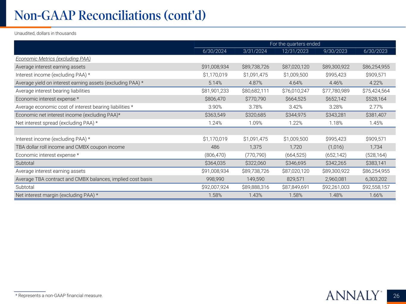 For the quarters ended 6/30/2024 3/31/2024 12/31/2023 9/30/2023 6/30/2023 Economic capital ratio reconciliation Total GAAP assets $93,668,577 $91,483,546 $93,227,236 $89,648,423 $89,330,477 Less: Gross unrealized gains on TBA derivatives (1) (14,641) (7,220) (20,689) (7,232) (21,460) Debt issued by securitization vehicles (15,831,915) (13,690,967) (11,600,338) (9,983,847) (9,789,282) Plus: Implied market value of TBA derivatives 1,652,389 1,133,305 (573,602) 1,925,614 3,627,716 Total economic assets * $79,474,410 $78,918,664 $81,032,607 $81,582,958 $83,147,451 Total equity $11,262,904 $11,496,113 $11,345,091 $10,677,057 $11,887,345 Economic capital ratio *(2) 14.2% 14.6% 14.0% 13.1% 14.3% Premium Amortization Reconciliation Premium amortization expense $10,437 $26,732 $51,247 $24,272 $33,105 Less: PAA cost (benefit) (7,306) (3,013) 19,148 (6,062) (11,923) Premium amortization expense (excluding PAA) $17,743 $29,745 $32,099 $30,334 $45,028 Interest Income (excluding PAA) Reconciliation GAAP interest income $1,177,325 $1,094,488 $990,352 $1,001,485 $921,494 PAA cost (benefit) (7,306) (3,013) 19,148 (6,062) (11,923) Interest income (excluding PAA) * $1,170,019 $1,091,475 $1,009,500 $995,423 $909,571 Economic Interest Expense Reconciliation GAAP interest expense $1,123,767 $1,100,939 $1,043,902 $1,046,819 $953,457 Add: Net interest component of interest rate swaps and net interest on initial margin related to interest rate swaps(3) (317,297) (330,149) (379,377) (394,677) (425,293) Economic interest expense * $806,470 $770,790 $664,525 $652,142 $528,164 Economic Net Interest Income (excluding PAA) Reconciliation Interest income (excluding PAA) * $1,170,019 $1,091,475 $1,009,500 $995,423 $909,571 Less: Economic interest expense * 806,470 770,790 664,525 652,142 528,164 Economic net interest income (excluding PAA) * $363,549 $320,685 $344,975 $343,281 $381,407 25 Non-GAAP Reconciliations (cont'd) ___________________ * Represents a non-GAAP financial measure. Detailed endnotes are included within the Appendix at the end of this presentation. Unaudited, dollars in thousands