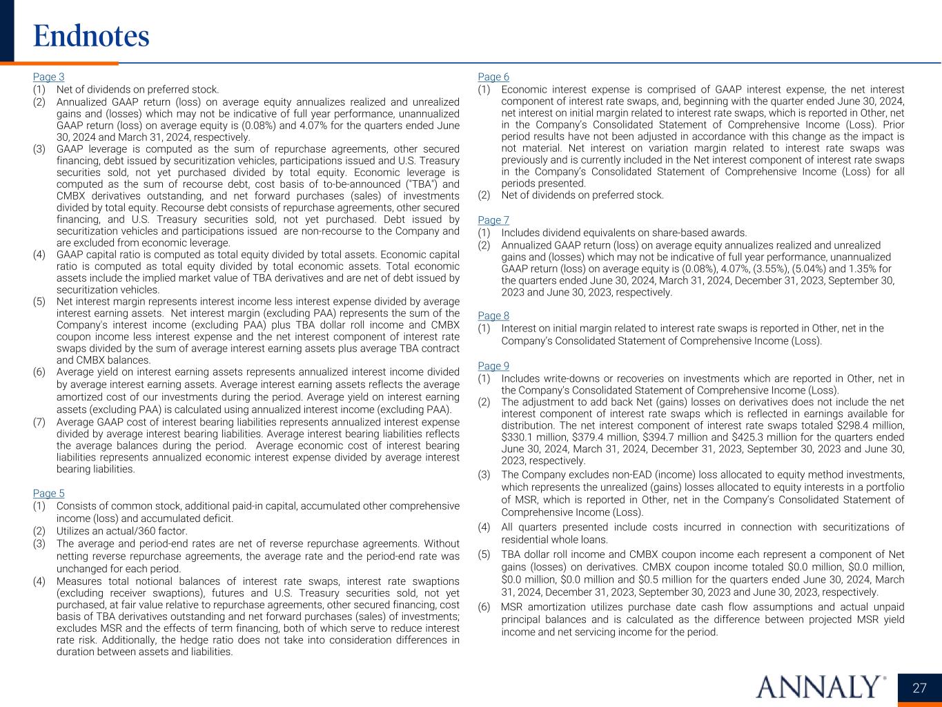 Page 3 (1) Net of dividends on preferred stock. (2) Annualized GAAP return (loss) on average equity annualizes realized and unrealized gains and (losses) which may not be indicative of full year performance, unannualized GAAP return (loss) on average equity is (0.08%) and 4.07% for the quarters ended June 30, 2024 and March 31, 2024, respectively. (3) GAAP leverage is computed as the sum of repurchase agreements, other secured financing, debt issued by securitization vehicles, participations issued and U.S. Treasury securities sold, not yet purchased divided by total equity. Economic leverage is computed as the sum of recourse debt, cost basis of to-be-announced ("TBA") and CMBX derivatives outstanding, and net forward purchases (sales) of investments divided by total equity. Recourse debt consists of repurchase agreements, other secured financing, and U.S. Treasury securities sold, not yet purchased. Debt issued by securitization vehicles and participations issued are non-recourse to the Company and are excluded from economic leverage. (4) GAAP capital ratio is computed as total equity divided by total assets. Economic capital ratio is computed as total equity divided by total economic assets. Total economic assets include the implied market value of TBA derivatives and are net of debt issued by securitization vehicles. (5) Net interest margin represents interest income less interest expense divided by average interest earning assets. Net interest margin (excluding PAA) represents the sum of the Company's interest income (excluding PAA) plus TBA dollar roll income and CMBX coupon income less interest expense and the net interest component of interest rate swaps divided by the sum of average interest earning assets plus average TBA contract and CMBX balances. (6) Average yield on interest earning assets represents annualized interest income divided by average interest earning assets. Average interest earning assets reflects the average amortized cost of our investments during the period. Average yield on interest earning assets (excluding PAA) is calculated using annualized interest income (excluding PAA). (7) Average GAAP cost of interest bearing liabilities represents annualized interest expense divided by average interest bearing liabilities. Average interest bearing liabilities reflects the average balances during the period. Average economic cost of interest bearing liabilities represents annualized economic interest expense divided by average interest bearing liabilities. Page 5 (1) Consists of common stock, additional paid-in capital, accumulated other comprehensive income (loss) and accumulated deficit. (2) Utilizes an actual/360 factor. (3) The average and period-end rates are net of reverse repurchase agreements. Without netting reverse repurchase agreements, the average rate and the period-end rate was unchanged for each period. (4) Measures total notional balances of interest rate swaps, interest rate swaptions (excluding receiver swaptions), futures and U.S. Treasury securities sold, not yet purchased, at fair value relative to repurchase agreements, other secured financing, cost basis of TBA derivatives outstanding and net forward purchases (sales) of investments; excludes MSR and the effects of term financing, both of which serve to reduce interest rate risk. Additionally, the hedge ratio does not take into consideration differences in duration between assets and liabilities. 27 Endnotes Page 6 (1) Economic interest expense is comprised of GAAP interest expense, the net interest component of interest rate swaps, and, beginning with the quarter ended June 30, 2024, net interest on initial margin related to interest rate swaps, which is reported in Other, net in the Company’s Consolidated Statement of Comprehensive Income (Loss). Prior period results have not been adjusted in accordance with this change as the impact is not material. Net interest on variation margin related to interest rate swaps was previously and is currently included in the Net interest component of interest rate swaps in the Company’s Consolidated Statement of Comprehensive Income (Loss) for all periods presented. (2) Net of dividends on preferred stock. Page 7 (1) Includes dividend equivalents on share-based awards. (2) Annualized GAAP return (loss) on average equity annualizes realized and unrealized gains and (losses) which may not be indicative of full year performance, unannualized GAAP return (loss) on average equity is (0.08%), 4.07%, (3.55%), (5.04%) and 1.35% for the quarters ended June 30, 2024, March 31, 2024, December 31, 2023, September 30, 2023 and June 30, 2023, respectively. Page 8 (1) Interest on initial margin related to interest rate swaps is reported in Other, net in the Company’s Consolidated Statement of Comprehensive Income (Loss). Page 9 (1) Includes write-downs or recoveries on investments which are reported in Other, net in the Company's Consolidated Statement of Comprehensive Income (Loss). (2) The adjustment to add back Net (gains) losses on derivatives does not include the net interest component of interest rate swaps which is reflected in earnings available for distribution. The net interest component of interest rate swaps totaled $298.4 million, $330.1 million, $379.4 million, $394.7 million and $425.3 million for the quarters ended June 30, 2024, March 31, 2024, December 31, 2023, September 30, 2023 and June 30, 2023, respectively. (3) The Company excludes non-EAD (income) loss allocated to equity method investments, which represents the unrealized (gains) losses allocated to equity interests in a portfolio of MSR, which is reported in Other, net in the Company’s Consolidated Statement of Comprehensive Income (Loss). (4) All quarters presented include costs incurred in connection with securitizations of residential whole loans. (5) TBA dollar roll income and CMBX coupon income each represent a component of Net gains (losses) on derivatives. CMBX coupon income tota