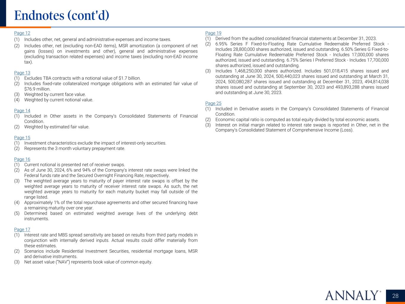 Page 12 (1) Includes other, net, general and administrative expenses and income taxes. (2) Includes other, net (excluding non-EAD items), MSR amortization (a component of net gains (losses) on investments and other), general and administrative expenses (excluding transaction related expenses) and income taxes (excluding non-EAD income tax). Page 13 (1) Excludes TBA contracts with a notional value of $1.7 billion. (2) Includes fixed-rate collateralized mortgage obligations with an estimated fair value of $76.9 million. (3) Weighted by current face value. (4) Weighted by current notional value. Page 14 (1) Included in Other assets in the Company’s Consolidated Statements of Financial Condition. (2) Weighted by estimated fair value. Page 15 (1) Investment characteristics exclude the impact of interest-only securities. (2) Represents the 3 month voluntary prepayment rate. Page 16 (1) Current notional is presented net of receiver swaps. (2) As of June 30, 2024, 6% and 94% of the Company's interest rate swaps were linked the Federal funds rate and the Secured Overnight Financing Rate, respectively. (3) The weighted average years to maturity of payer interest rate swaps is offset by the weighted average years to maturity of receiver interest rate swaps. As such, the net weighted average years to maturity for each maturity bucket may fall outside of the range listed. (4) Approximately 1% of the total repurchase agreements and other secured financing have a remaining maturity over one year. (5) Determined based on estimated weighted average lives of the underlying debt instruments. Page 17 (1) Interest rate and MBS spread sensitivity are based on results from third party models in conjunction with internally derived inputs. Actual results could differ materially from these estimates. (2) Scenarios include Residential Investment Securities, residential mortgage loans, MSR and derivative instruments. (3) Net asset value (“NAV”) represents book value of common equity. Page 19 (1) Derived from the audited consolidated financial statements at December 31, 2023. (2) 6.95% Series F Fixed-to-Floating Rate Cumulative Redeemable Preferred Stock - Includes 28,800,000 shares authorized, issued and outstanding. 6.50% Series G Fixed-to- Floating Rate Cumulative Redeemable Preferred Stock - Includes 17,000,000 shares authorized, issued and outstanding. 6.75% Series I Preferred Stock - Includes 17,700,000 shares authorized, issued and outstanding. (3) Includes 1,468,250,000 shares authorized. Includes 501,018,415 shares issued and outstanding at June 30, 2024, 500,440,023 shares issued and outstanding at March 31, 2024, 500,080,287 shares issued and outstanding at December 31, 2023, 494,814,038 shares issued and outstanding at September 30, 2023 and 493,893,288 shares issued and outstanding at June 30, 2023. Page 25 (1) Included in Derivative assets in the Company’s Consolidated Statements of Financial Condition. (2) Economic capital ratio is computed as total equity divided by total economic assets. (3) Interest on initial margin related to interest rate swaps is reported in Other, net in the Company’s Consolidated Statement of Comprehensive Income (Loss). 28 Endnotes (cont'd)