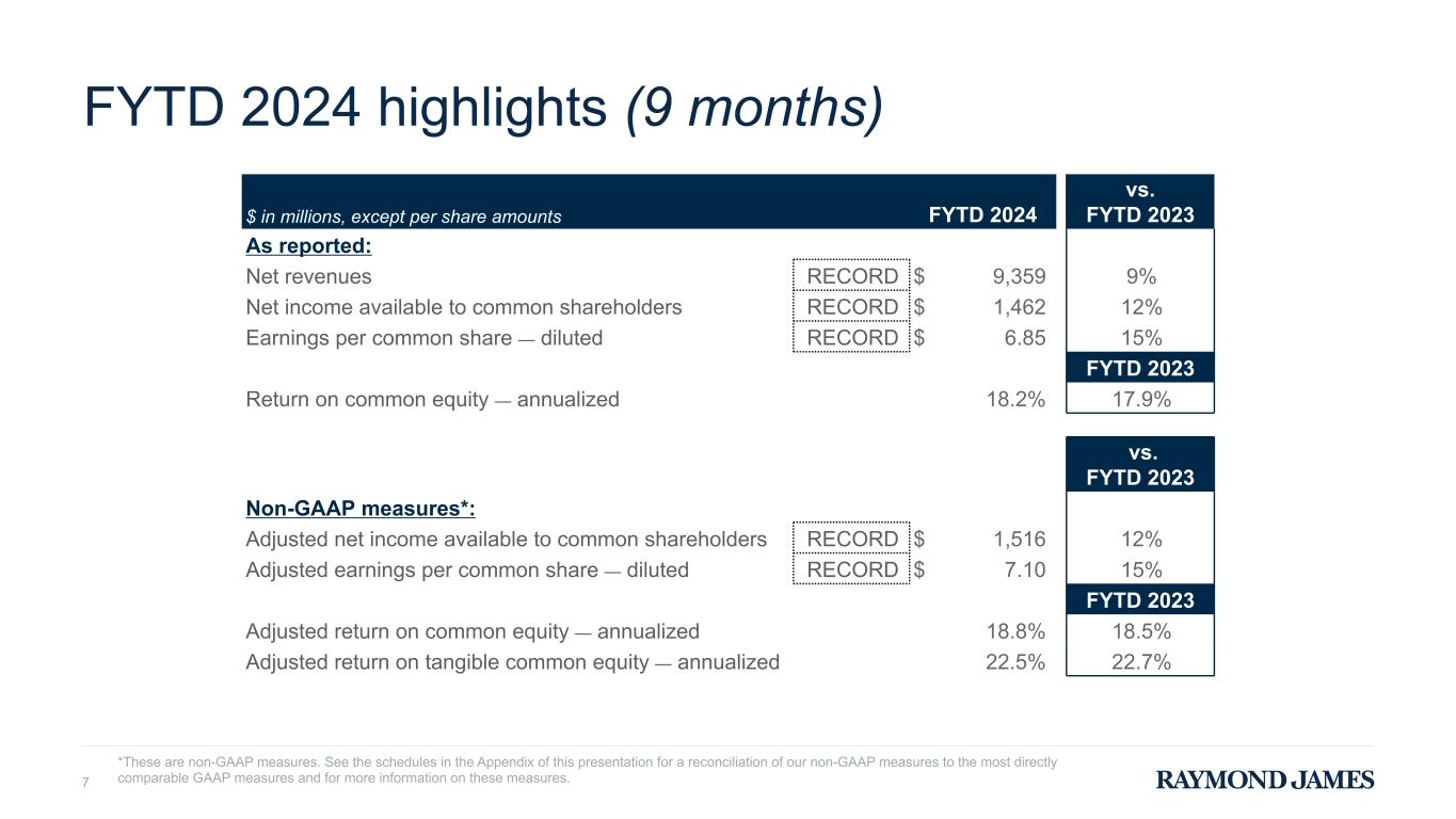 For the first nine months of the fiscal year, record net revenues of $9.36 billion increased 9%, record earnings per diluted share of $6.85 increased 15%, and record adjusted earnings per diluted share of $7.10(2) increased 15% over the first nine months of fiscal 2023. The Private Client Group and Asset Management segments generated record net revenues and pre-tax income during the first nine months of the fiscal year. For this period, annualized return on common equity was 18.2% and annualized adjusted return on tangible common equity was 22.5%(2).