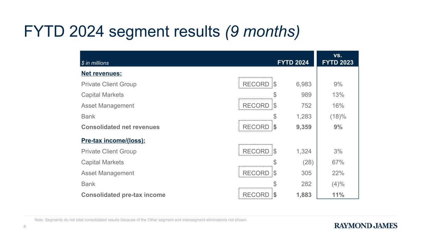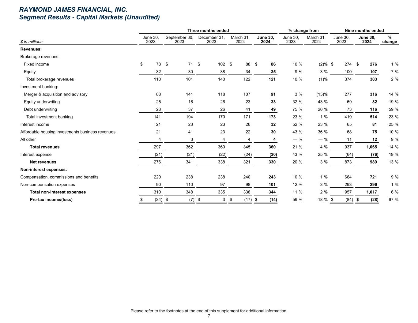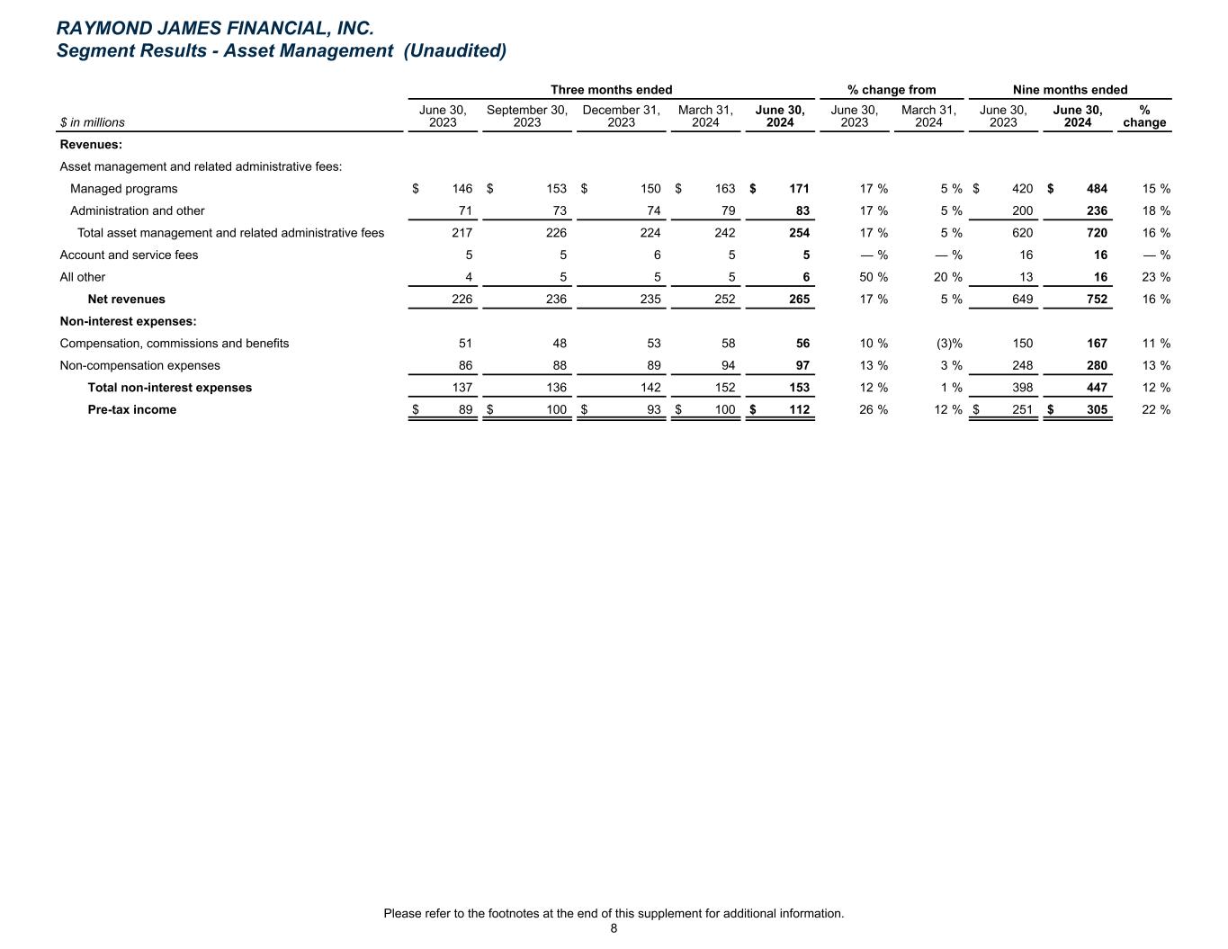 Three months ended % change from Nine months ended $ in millions June 30, 2023 September 30, 2023 December 31, 2023 March 31, 2024 June 30, 2024 June 30, 2023 March 31, 2024 June 30, 2023 June 30, 2024 % change Revenues: Brokerage revenues: Fixed income $ 78 $ 71 $ 102 $ 88 $ 86 10 % (2) % $ 274 $ 276 1 % Equity 32 30 38 34 35 9 % 3 % 100 107 7 % Total brokerage revenues 110 101 140 122 121 10 % (1) % 374 383 2 % Investment banking: Merger & acquisition and advisory 88 141 118 107 91 3 % (15) % 277 316 14 % Equity underwriting 25 16 26 23 33 32 % 43 % 69 82 19 % Debt underwriting 28 37 26 41 49 75 % 20 % 73 116 59 % Total investment banking 141 194 170 171 173 23 % 1 % 419 514 23 % Interest income 21 23 23 26 32 52 % 23 % 65 81 25 % Affordable housing investments business revenues 21 41 23 22 30 43 % 36 % 68 75 10 % All other 4 3 4 4 4 — % — % 11 12 9 % Total revenues 297 362 360 345 360 21 % 4 % 937 1,065 14 % Interest expense (21) (21) (22) (24) (30) 43 % 25 % (64) (76) 19 % Net revenues 276 341 338 321 330 20 % 3 % 873 989 13 % Non-interest expenses: Compensation, commissions and benefits 220 238 238 240 243 10 % 1 % 664 721 9 % Non-compensation expenses 90 110 97 98 101 12 % 3 % 293 296 1 % Total non-interest expenses 310 348 335 338 344 11 % 2 % 957 1,017 6 % Pre-tax income/(loss) $ (34) $ (7) $ 3 $ (17) $ (14) 59 % 18 % $ (84) $ (28) 67 % RAYMOND JAMES FINANCIAL, INC. Segment Results - Capital Markets (Unaudited) Please refer to the footnotes at the end of this supplement for additional information. 7