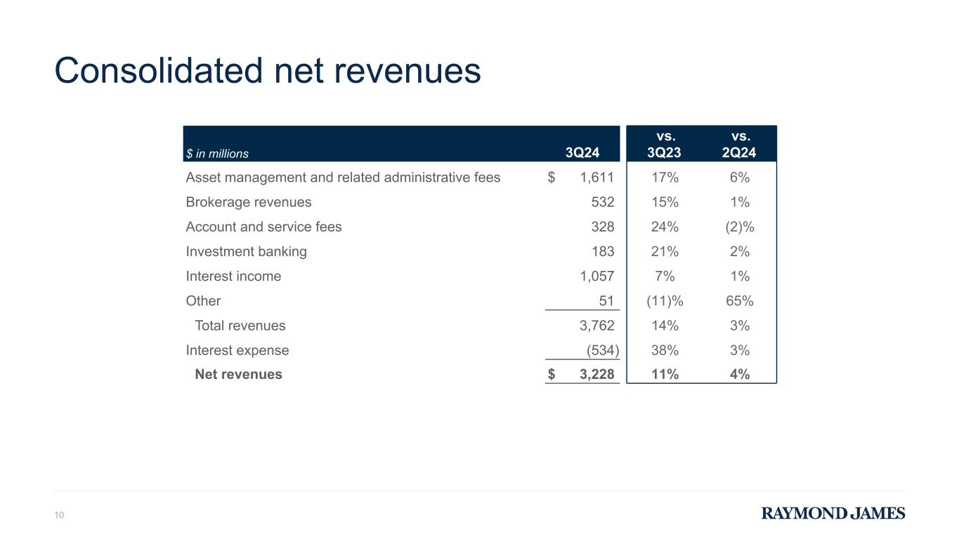 Three months ended % change from Nine months ended $ in millions, except per share amounts June 30, 2023 September 30, 2023 December 31, 2023 March 31, 2024 June 30, 2024 June 30, 2023 March 31, 2024 June 30, 2023 June 30, 2024 % change Revenues: Asset management and related administrative fees $ 1,373 $ 1,446 $ 1,407 $ 1,516 $ 1,611 17 % 6 % $ 3,917 $ 4,534 16 % Brokerage revenues: Securities commissions 356 382 383 414 416 17 % — % 1,077 1,213 13 % Principal transactions 105 98 139 114 116 10 % 2 % 364 369 1 % Total brokerage revenues 461 480 522 528 532 15 % 1 % 1,441 1,582 10 % Account and service fees 264 314 319 335 328 24 % (2) % 811 982 21 % Investment banking 151 202 181 179 183 21 % 2 % 446 543 22 % Interest income 987 1,019 1,053 1,049 1,057 7 % 1 % 2,729 3,159 16 % Other 57 54 38 31 51 (11) % 65 % 133 120 (10) % Total revenues 3,293 3,515 3,520 3,638 3,762 14 % 3 % 9,477 10,920 15 % Interest expense (386) (462) (507) (520) (534) 38 % 3 % (911) (1,561) 71 % Net revenues 2,907 3,053 3,013 3,118 3,228 11 % 4 % 8,566 9,359 9 % Non-interest expenses: Compensation, commissions and benefits 1,851 1,892 1,921 2,043 2,090 13 % 2 % 5,407 6,054 12 % Non-compensation expenses: Communications and information processing 149 158 150 165 166 11 % 1 % 441 481 9 % Occupancy and equipment 68 69 72 73 75 10 % 3 % 202 220 9 % Business development 66 66 61 60 72 9 % 20 % 176 193 10 % Investment sub-advisory fees 40 41 40 44 48 20 % 9 % 110 132 20 % Professional fees 35 40 32 33 38 9 % 15 % 105 103 (2) % Bank loan provision/(benefit) for credit losses 54 36 12 21 (10) NM NM 96 23 (76) % Other (1) 158 166 95 70 105 (34) % 50 % 334 270 (19) % Total non-compensation expenses 570 576 462 466 494 (13) % 6 % 1,464 1,422 (3) % Total non-interest expenses 2,421 2,468 2,383 2,509 2,584 7 % 3 % 6,871 7,476 9 % Pre-tax income 486 585 630 609 644 33 % 6 % 1,695 1,883 11 % Provision for income taxes 117 151 132 133 152 30 % 14 % 390 417 7 % Net income 369 434 498 476 492 33 % 3 % 1,305 1,466 12 % Preferred stock dividends — 2 1 2 1 NM (50) % 4 4 — % Net income available to common shareholders $ 369 $ 432 $ 497 $ 474 $ 491 33 % 4 % $ 1,301 $ 1,462 12 % Earnings per common share – basic (2) $ 1.75 $ 2.07 $ 2.38 $ 2.27 $ 2.37 35 % 4 % $ 6.09 $ 7.02 15 % Earnings per common share – diluted (2) $ 1.71 $ 2.02 $ 2.32 $ 2.22 $ 2.31 35 % 4 % $ 5.95 $ 6.85 15 % Weighted-average common shares outstanding – basic 210.1 208.3 208.6 208.3 206.8 (2) % (1) % 213.0 207.9 (2) % Weighted-average common and common equivalent shares outstanding – diluted 214.8 213.8 213.8 213.4 212.3 (1) % (1) % 218.0 213.1 (2) % RAYMOND JAMES FINANCIAL, INC. Consolidated Statements of Income (Unaudited) Please refer to the footnotes at the end of this supplement for additional information. 3
