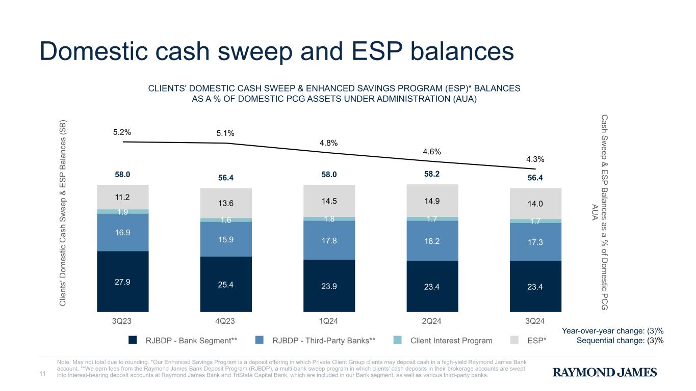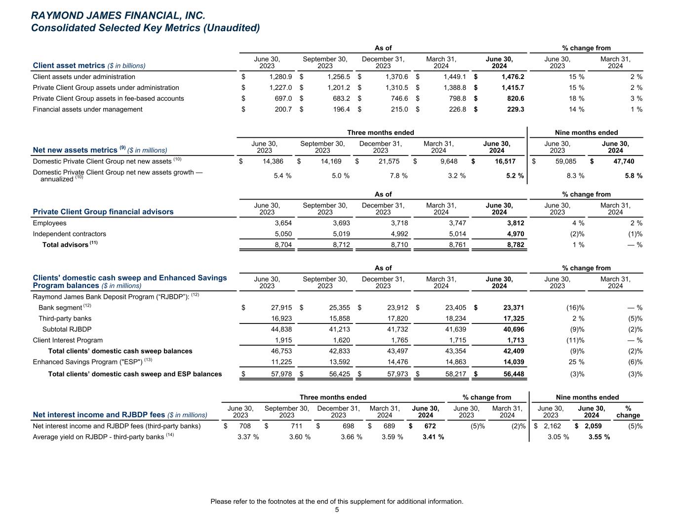 As of % change from Client asset metrics ($ in billions) June 30, 2023 September 30, 2023 December 31, 2023 March 31, 2024 June 30, 2024 June 30, 2023 March 31, 2024 Client assets under administration $ 1,280.9 $ 1,256.5 $ 1,370.6 $ 1,449.1 $ 1,476.2 15 % 2 % Private Client Group assets under administration $ 1,227.0 $ 1,201.2 $ 1,310.5 $ 1,388.8 $ 1,415.7 15 % 2 % Private Client Group assets in fee-based accounts $ 697.0 $ 683.2 $ 746.6 $ 798.8 $ 820.6 18 % 3 % Financial assets under management $ 200.7 $ 196.4 $ 215.0 $ 226.8 $ 229.3 14 % 1 % Three months ended Nine months ended Net new assets metrics (9) ($ in millions) June 30, 2023 September 30, 2023 December 31, 2023 March 31, 2024 June 30, 2024 June 30, 2023 June 30, 2024 Domestic Private Client Group net new assets (10) $ 14,386 $ 14,169 $ 21,575 $ 9,648 $ 16,517 $ 59,085 $ 47,740 Domestic Private Client Group net new assets growth — annualized (10) 5.4 % 5.0 % 7.8 % 3.2 % 5.2 % 8.3 % 5.8 % As of % change from Private Client Group financial advisors June 30, 2023 September 30, 2023 December 31, 2023 March 31, 2024 June 30, 2024 June 30, 2023 March 31, 2024 Employees 3,654 3,693 3,718 3,747 3,812 4 % 2 % Independent contractors 5,050 5,019 4,992 5,014 4,970 (2) % (1) % Total advisors (11) 8,704 8,712 8,710 8,761 8,782 1 % — % As of % change from Clients' domestic cash sweep and Enhanced Savings Program balances ($ in millions) June 30, 2023 September 30, 2023 December 31, 2023 March 31, 2024 June 30, 2024 June 30, 2023 March 31, 2024 Raymond James Bank Deposit Program (“RJBDP”): (12) Bank segment (12) $ 27,915 $ 25,355 $ 23,912 $ 23,405 $ 23,371 (16) % — % Third-party banks 16,923 15,858 17,820 18,234 17,325 2 % (5) % Subtotal RJBDP 44,838 41,213 41,732 41,639 40,696 (9) % (2) % Client Interest Program 1,915 1,620 1,765 1,715 1,713 (11) % — % Total clients’ domestic cash sweep balances 46,753 42,833 43,497 43,354 42,409 (9) % (2) % Enhanced Savings Program ("ESP") (13) 11,225 13,592 14,476 14,863 14,039 25 % (6) % Total clients’ domestic cash sweep and ESP balances $ 57,978 $ 56,425 $ 57,973 $ 58,217 $ 56,448 (3) % (3) % Three months ended % change from Nine months ended Net interest income and RJBDP fees ($ in millions) June 30, 2023 September 30, 2023 December 31, 2023 March 31, 2024 June 30, 2024 June 30, 2023 March 31, 2024 June 30, 2023 June 30, 2024 % change Net interest income and RJBDP fees (third-party banks) $ 708 $ 711 $ 698 $ 689 $ 672 (5) % (2) % $ 2,162 $ 2,059 (5) % Average yield on RJBDP - third-party banks (14) 3.37 % 3.60 % 3.66 % 3.59 % 3.41 % 3.05 % 3.55 % RAYMOND JAMES FINANCIAL, INC. Consolidated Selected Key Metrics (Unaudited) Please refer to the footnotes at the end of this supplement for additional information. 5