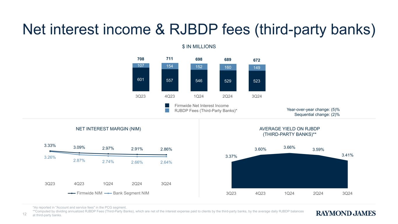Domestic cash sweep and ESP balances 11 C lie nt s' D om es tic C as h S w ee p & E S P B al an ce s ($ B ) C ash S w eep & E S P B alances as a % of D om estic P C G A U A CLIENTS' DOMESTIC CASH SWEEP & ENHANCED SAVINGS PROGRAM (ESP)* BALANCES AS A % OF DOMESTIC PCG ASSETS UNDER ADMINISTRATION (AUA) 27.9 25.4 23.9 23.4 23.4 16.9 15.9 17.8 18.2 17.3 1.9 1.6 1.8 1.7 1.7 11.2 13.6 14.5 14.9 14.0 58.0 56.4 58.0 58.2 56.4 5.2% 5.1% 4.8% 4.6% 4.3% RJBDP - Bank Segment** RJBDP - Third-Party Banks** Client Interest Program ESP* 3Q23 4Q23 1Q24 2Q24 3Q24 Note: May not total due to rounding. *Our Enhanced Savings Program is a deposit offering in which Private Client Group clients may deposit cash in a high-yield Raymond James Bank account. **We earn fees from the Raymond James Bank Deposit Program (RJBDP), a multi-bank sweep program in which clients’ cash deposits in their brokerage accounts are swept into interest-bearing deposit accounts at Raymond James Bank and TriState Capital Bank, which are included in our Bank segment, as well as various third-party banks. Year-over-year change: (3)% Sequential change: (3)%