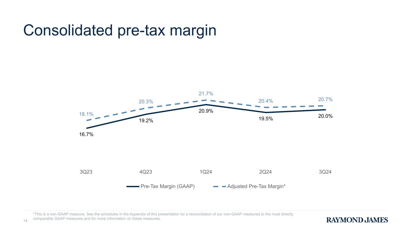 Reconciliation of non-GAAP financial measures to GAAP financial measures (Unaudited) (Continued from previous page) Three months ended Nine months ended June 30, 2023 September 30, 2023 December 31, 2023 March 31, 2024 June 30, 2024 June 30, 2023 June 30, 2024 Pre-tax margin (7) 16.7 % 19.2 % 20.9 % 19.5 % 20.0 % 19.8 % 20.1 % Impact of non-GAAP adjustments on pre-tax margin: Expenses related to acquisitions: Compensation, commissions and benefits: Acquisition-related retention (18) 0.7 % 0.6 % 0.4 % 0.3 % 0.3 % 0.6 % 0.4 % Other acquisition-related compensation 0.3 % — % — % — % — % 0.1 % — % Total “Compensation, commissions and benefits” expense 1.0 % 0.6 % 0.4 % 0.3 % 0.3 % 0.7 % 0.4 % Communications and information processing — % — % — % — % — % — % — % Professional fees — % 0.1 % — % 0.1 % — % — % — % Other: Amortization of identifiable intangible assets (19) 0.4 % 0.4 % 0.4 % 0.4 % 0.4 % 0.4 % 0.4 % All other acquisition-related expenses — % — % — % 0.1 % — % — % — % Total “Other” expense 0.4 % 0.4 % 0.4 % 0.5 % 0.4 % 0.4 % 0.4 % Total expenses related to acquisitions 1.4 % 1.1 % 0.8 % 0.9 % 0.7 % 1.1 % 0.8 % Other — Insurance settlement received (1) — % — % — % — % — % (0.4) % — % Total non-GAAP adjustments 1.4 % 1.1 % 0.8 % 0.9 % 0.7 % 0.7 % 0.8 % Adjusted pre-tax margin (4) (7) 18.1 % 20.3 % 21.7 % 20.4 % 20.7 % 20.5 % 20.9 % Total compensation ratio (8) 63.7 % 62.0 % 63.8 % 65.5 % 64.7 % 63.1 % 64.7 % Less the impact of non-GAAP adjustments on compensation ratio: Acquisition-related retention (18) 0.7 % 0.6 % 0.4 % 0.3 % 0.3 % 0.6 % 0.4 % Other acquisition-related compensation 0.3 % — % — % — % — % 0.1 % — % Total “Compensation, commissions and benefits” expenses related to acquisitions 1.0 % 0.6 % 0.4 % 0.3 % 0.3 % 0.7 % 0.4 % Adjusted total compensation ratio (4) (8) 62.7 % 61.4 % 63.4 % 65.2 % 64.4 % 62.4 % 64.3 % RAYMOND JAMES FINANCIAL, INC. Please refer to the footnotes at the end of this supplement for additional information. 13