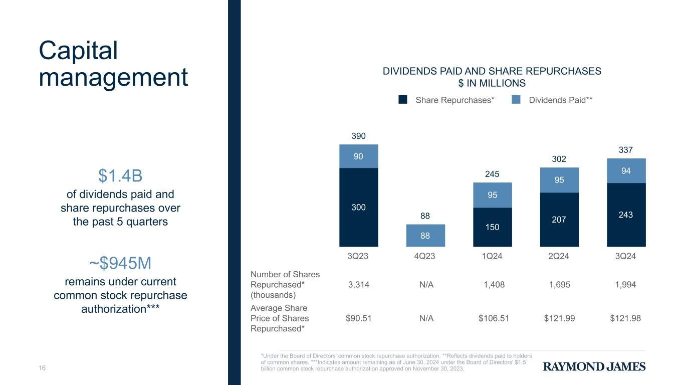 Other financial information 15 *This amount includes cash on hand at the parent, as well as parent cash loaned to Raymond James & Associates ("RJ&A"), which RJ&A has invested on behalf of RJF in cash and cash equivalents or otherwise deployed in its normal business activities. **This is a non-GAAP measure. See the schedules in the Appendix of this presentation for a reconciliation of our non- GAAP measures to the most directly comparable GAAP measures and for more information on these measures. ***Estimated. $ in millions, except per share amounts 3Q24 vs. 3Q23 vs. 2Q24 Total assets $ 80,628 4% (1)% RJF corporate cash* $ 2,109 23% 4% Total common equity attributable to RJF $ 11,118 13% 2% Book value per share $ 54.08 14% 3% Tangible book value per share** $ 45.57 18% 3% Weighted-average common and common equivalent shares outstanding — diluted 212.3 (1)% (1)% 3Q23 2Q24 Tier 1 leverage ratio*** 12.7 % 11.4% 12.3% Tier 1 capital ratio*** 22.2 % 20.6% 21.9% Common equity tier 1 ratio*** 22.0 % 20.4% 21.8% Total capital ratio*** 23.6 % 22.0% 23.3% Effective tax rate 23.6 % 24.1% 21.8%