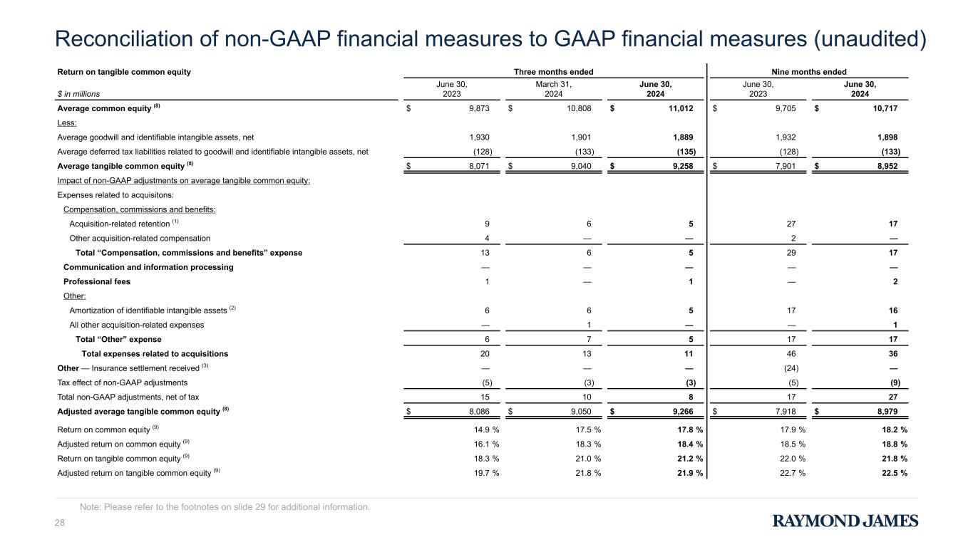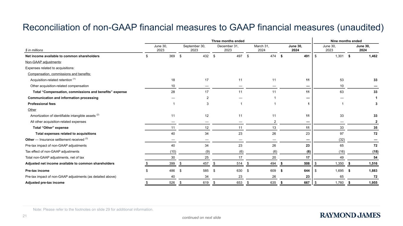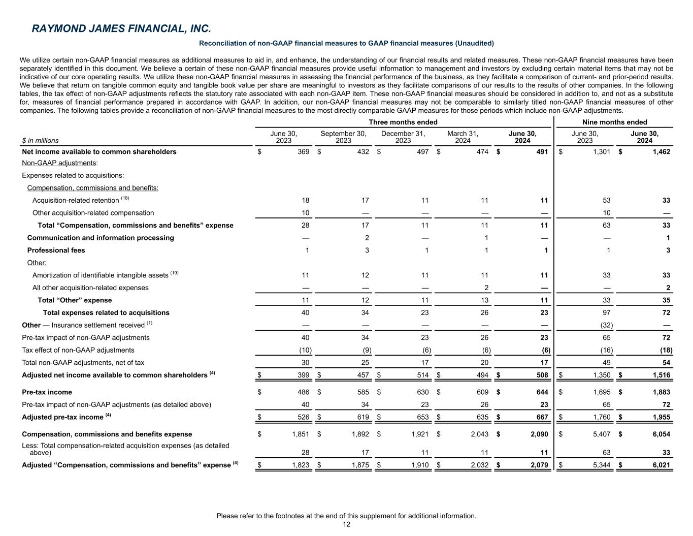 Reconciliation of non-GAAP financial measures to GAAP financial measures (Unaudited) We utilize certain non-GAAP financial measures as additional measures to aid in, and enhance, the understanding of our financial results and related measures. These non-GAAP financial measures have been separately identified in this document. We believe a certain of these non-GAAP financial measures provide useful information to management and investors by excluding certain material items that may not be indicative of our core operating results. We utilize these non-GAAP financial measures in assessing the financial performance of the business, as they facilitate a comparison of current- and prior-period results. We believe that return on tangible common equity and tangible book value per share are meaningful to investors as they facilitate comparisons of our results to the results of other companies. In the following tables, the tax effect of non-GAAP adjustments reflects the statutory rate associated with each non-GAAP item. These non-GAAP financial measures should be considered in addition to, and not as a substitute for, measures of financial performance prepared in accordance with GAAP. In addition, our non-GAAP financial measures may not be comparable to similarly titled non-GAAP financial measures of other companies. The following tables provide a reconciliation of non-GAAP financial measures to the most directly comparable GAAP measures for those periods which include non-GAAP adjustments. Three months ended Nine months ended $ in millions June 30, 2023 September 30, 2023 December 31, 2023 March 31, 2024 June 30, 2024 June 30, 2023 June 30, 2024 Net income available to common shareholders $ 369 $ 432 $ 497 $ 474 $ 491 $ 1,301 $ 1,462 Non-GAAP adjustments: Expenses related to acquisitions: Compensation, commissions and benefits: Acquisition-related retention (18) 18 17 11 11 11 53 33 Other acquisition-related compensation 10 — — — — 10 — Total “Compensation, commissions and benefits” expense 28 17 11 11 11 63 33 Communication and information processing — 2 — 1 — — 1 Professional fees 1 3 1 1 1 1 3 Other: Amortization of identifiable intangible assets (19) 11 12 11 11 11 33 33 All other acquisition-related expenses — — — 2 — — 2 Total “Other” expense 11 12 11 13 11 33 35 Total expenses related to acquisitions 40 34 23 26 23 97 72 Other — Insurance settlement received (1) — — — — — (32) — Pre-tax impact of non-GAAP adjustments 40 34 23 26 23 65 72 Tax effect of non-GAAP adjustments (10) (9) (6) (6) (6) (16) (18) Total non-GAAP adjustments, net of tax 30 25 17 20 17 49 54 Adjusted net income available to common shareholders (4) $ 399 $ 457 $ 514 $ 494 $ 508 $ 1,350 $ 1,516 Pre-tax income $ 486 $ 585 $ 630 $ 609 $ 644 $ 1,695 $ 1,883 Pre-tax impact of non-GAAP adjustments (as detailed above) 40 34 23 26 23 65 72 Adjusted pre-tax income (4) $ 526 $ 619 $ 653 $ 635 $ 667 $ 1,760 $ 1,955 Compensation, commissions and benefits expense $ 1,851 $ 1,892 $ 1,921 $ 2,043 $ 2,090 $ 5,407 $ 6,054 Less: Total compensation-related acquisition expenses (as detailed above) 28 17 11 11 11 63 33 Adjusted “Compensation, commissions and benefits” expense (4) $ 1,823 $ 1,875 $ 1,910 $ 2,032 $ 2,079 $ 5,344 $ 6,021 RAYMOND JAMES FINANCIAL, INC. Please refer to the footnotes at the end of this supplement for additional information. 12