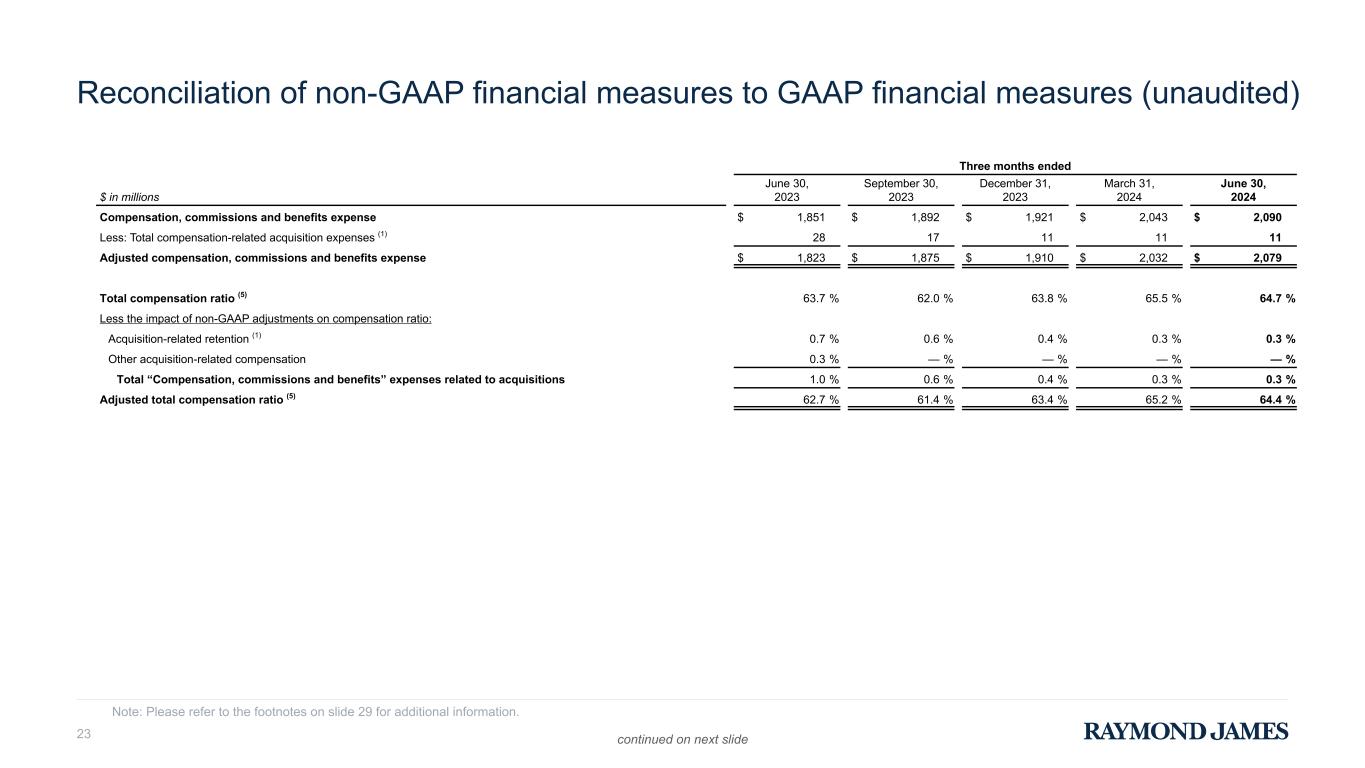 Reconciliation of non-GAAP financial measures to GAAP financial measures (unaudited) Three months ended June 30, 2023 September 30, 2023 December 31, 2023 March 31, 2024 June 30, 2024 Pre-tax margin (4) 16.7 % 19.2 % 20.9 % 19.5 % 20.0 % Impact of non-GAAP adjustments on pre-tax margin: Expenses related to acquisitions: Compensation, commissions and benefits: Acquisition-related retention (1) 0.7 % 0.6 % 0.4 % 0.3 % 0.3 % Other acquisition-related compensation 0.3 % — % — % — % — % Total “Compensation, commissions and benefits” expense 1.0 % 0.6 % 0.4 % 0.3 % 0.3 % Communication and information processing — % — % — % — % — % Professional fees — % 0.1 % — % 0.1 % — % Other: Amortization of identifiable intangible assets (2) 0.4 % 0.4 % 0.4 % 0.4 % 0.4 % All other acquisition-related expenses — % — % — % 0.1 % — % Total “Other” expense 0.4 % 0.4 % 0.4 % 0.5 % 0.4 % Total expenses related to acquisitions 1.4 % 1.1 % 0.8 % 0.9 % 0.7 % Other — Insurance settlement received (3) — % — % — % — % — % Total non-GAAP adjustments 1.4 % 1.1 % 0.8 % 0.9 % 0.7 % Adjusted pre-tax margin (4) 18.1 % 20.3 % 21.7 % 20.4 % 20.7 % Note: Please refer to the footnotes on slide 29 for additional information. continued on next slide22