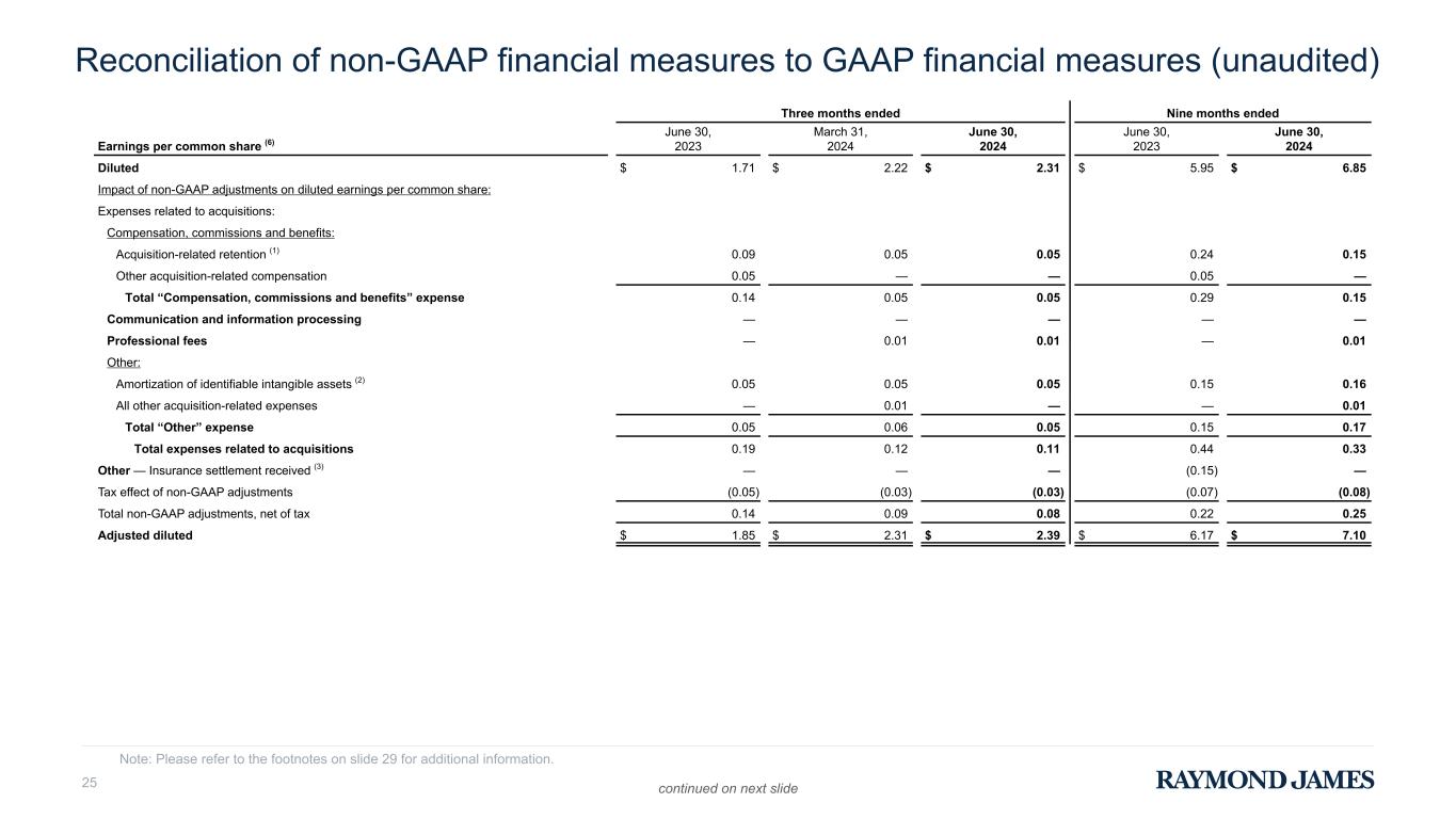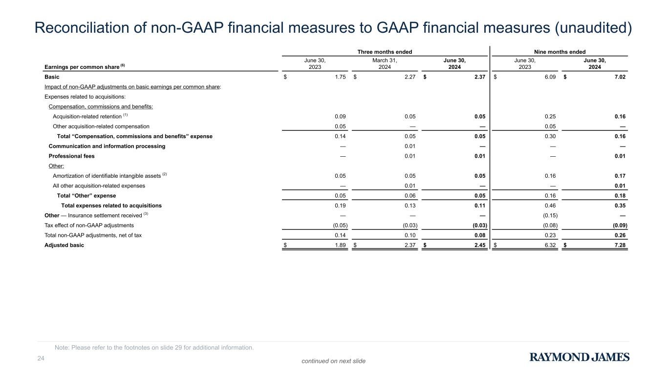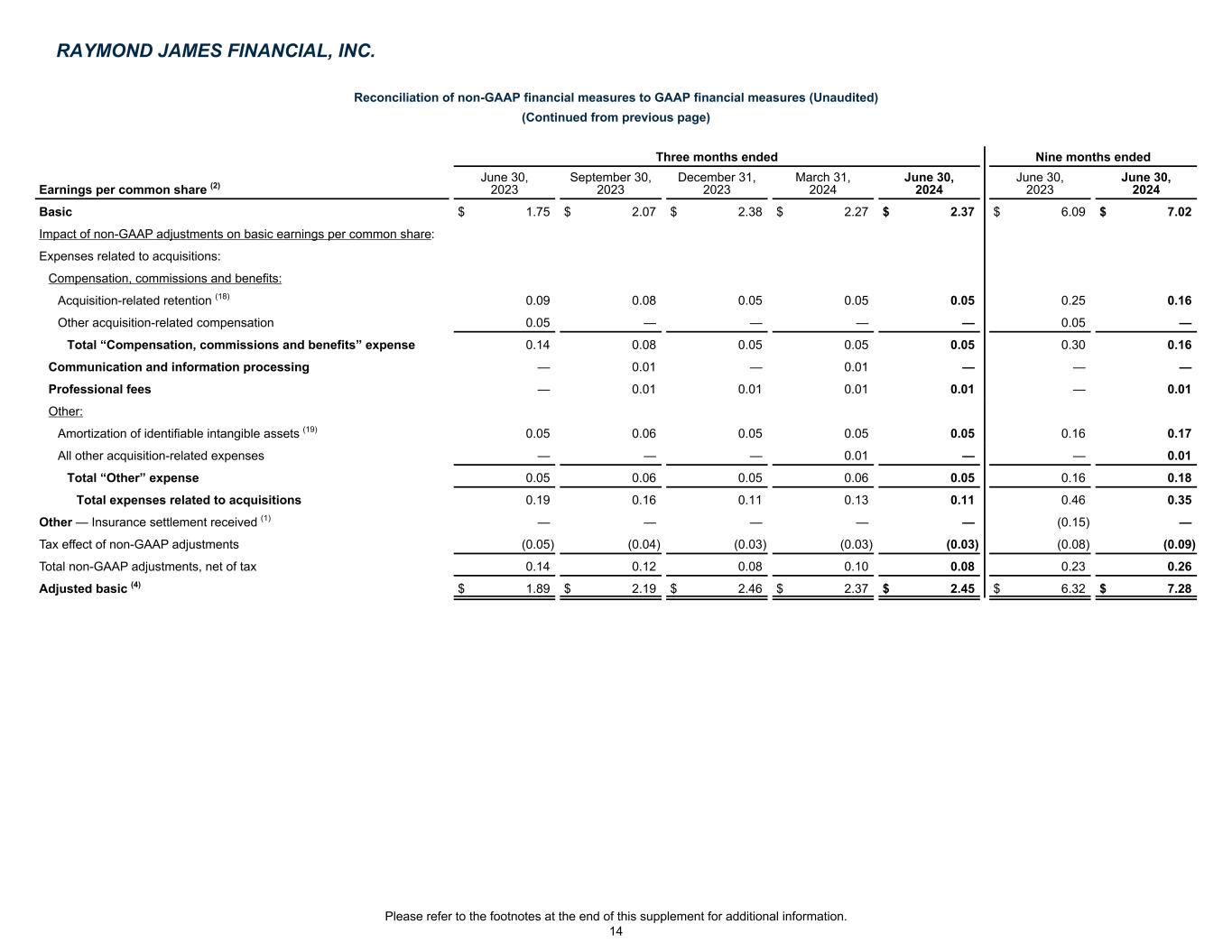 Reconciliation of non-GAAP financial measures to GAAP financial measures (Unaudited) (Continued from previous page) Three months ended Nine months ended Earnings per common share (2) June 30, 2023 September 30, 2023 December 31, 2023 March 31, 2024 June 30, 2024 June 30, 2023 June 30, 2024 Basic $ 1.75 $ 2.07 $ 2.38 $ 2.27 $ 2.37 $ 6.09 $ 7.02 Impact of non-GAAP adjustments on basic earnings per common share: Expenses related to acquisitions: Compensation, commissions and benefits: Acquisition-related retention (18) 0.09 0.08 0.05 0.05 0.05 0.25 0.16 Other acquisition-related compensation 0.05 — — — — 0.05 — Total “Compensation, commissions and benefits” expense 0.14 0.08 0.05 0.05 0.05 0.30 0.16 Communication and information processing — 0.01 — 0.01 — — — Professional fees — 0.01 0.01 0.01 0.01 — 0.01 Other: Amortization of identifiable intangible assets (19) 0.05 0.06 0.05 0.05 0.05 0.16 0.17 All other acquisition-related expenses — — — 0.01 — — 0.01 Total “Other” expense 0.05 0.06 0.05 0.06 0.05 0.16 0.18 Total expenses related to acquisitions 0.19 0.16 0.11 0.13 0.11 0.46 0.35 Other — Insurance settlement received (1) — — — — — (0.15) — Tax effect of non-GAAP adjustments (0.05) (0.04) (0.03) (0.03) (0.03) (0.08) (0.09) Total non-GAAP adjustments, net of tax 0.14 0.12 0.08 0.10 0.08 0.23 0.26 Adjusted basic (4) $ 1.89 $ 2.19 $ 2.46 $ 2.37 $ 2.45 $ 6.32 $ 7.28 RAYMOND JAMES FINANCIAL, INC. Please refer to the footnotes at the end of this supplement for additional information. 14