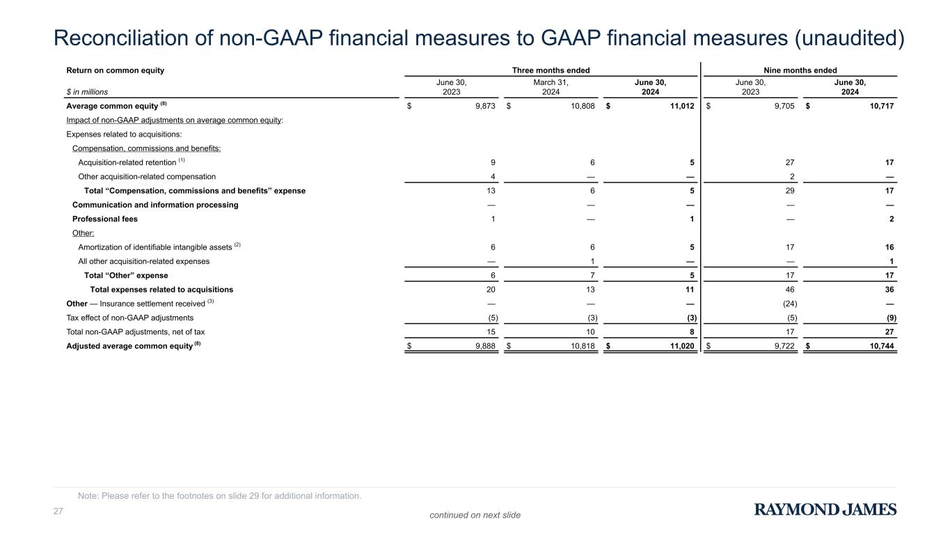 Reconciliation of non-GAAP financial measures to GAAP financial measures (Unaudited) (Continued from previous page) Return on common equity Three months ended Nine months ended $ in millions June 30, 2023 September 30, 2023 December 31, 2023 March 31, 2024 June 30, 2024 June 30, 2023 June 30, 2024 Average common equity (20) $ 9,873 $ 10,003 $ 10,423 $ 10,808 $ 11,012 $ 9,705 $ 10,717 Impact of non-GAAP adjustments on average common equity: Expenses related to acquisitions: Compensation, commissions and benefits: Acquisition-related retention (18) 9 9 6 6 5 27 17 Other acquisition-related compensation 4 — — — — 2 — Total “Compensation, commissions and benefits” expense 13 9 6 6 5 29 17 Communications and information processing — 1 — — — — — Professional fees 1 2 — — 1 — 2 Other: Amortization of identifiable intangible assets (19) 6 6 6 6 5 17 16 All other acquisition-related expenses — — — 1 — — 1 Total “Other” expense 6 6 6 7 5 17 17 Total expenses related to acquisitions 20 18 12 13 11 46 36 Other — Insurance settlement received (1) — — — — — (24) — Tax effect of non-GAAP adjustments (5) (5) (3) (3) (3) (5) (9) Total non-GAAP adjustments, net of tax 15 13 9 10 8 17 27 Adjusted average common equity (4) (20) $ 9,888 $ 10,016 $ 10,432 $ 10,818 $ 11,020 $ 9,722 $ 10,744 RAYMOND JAMES FINANCIAL, INC. Please refer to the footnotes at the end of this supplement for additional information. 16