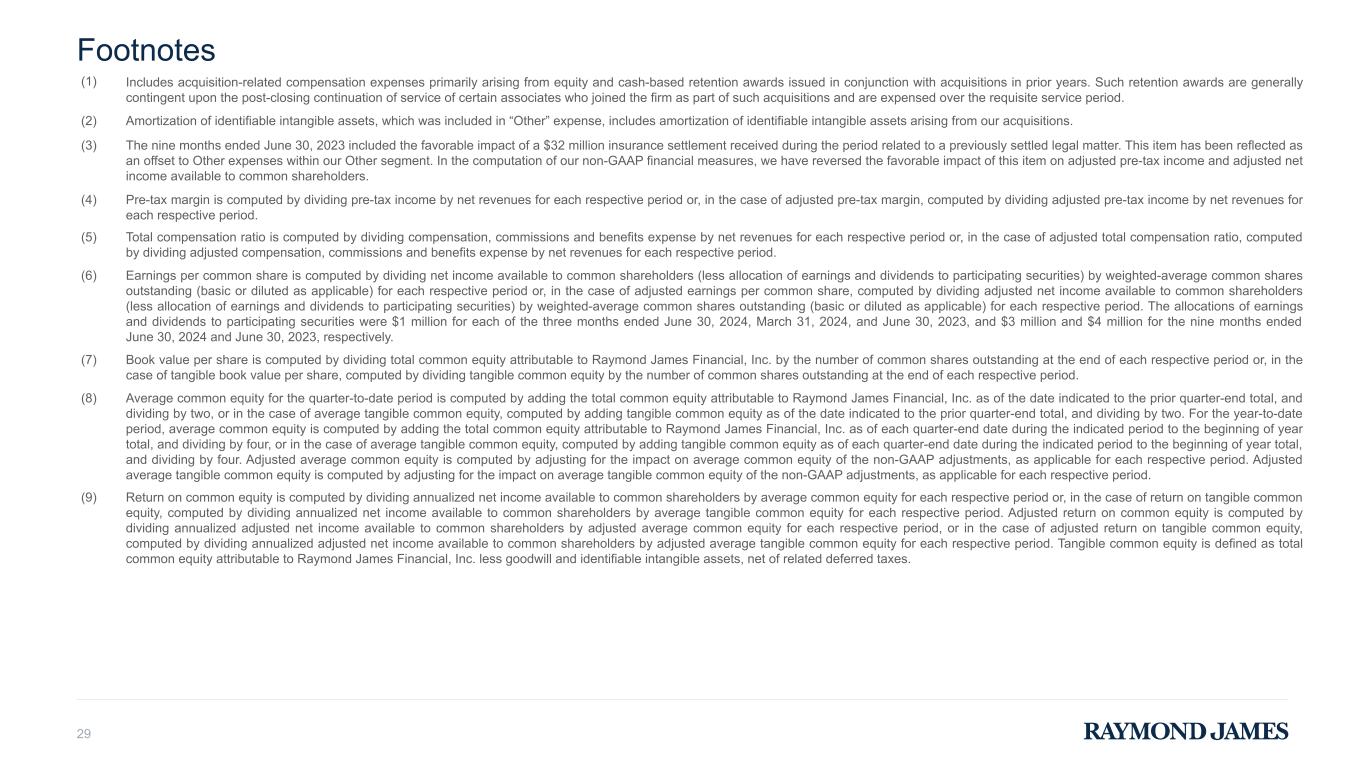 Footnotes 29 (1) Includes acquisition-related compensation expenses primarily arising from equity and cash-based retention awards issued in conjunction with acquisitions in prior years. Such retention awards are generally contingent upon the post-closing continuation of service of certain associates who joined the firm as part of such acquisitions and are expensed over the requisite service period. (2) Amortization of identifiable intangible assets, which was included in “Other” expense, includes amortization of identifiable intangible assets arising from our acquisitions. (3) The nine months ended June 30, 2023 included the favorable impact of a $32 million insurance settlement received during the period related to a previously settled legal matter. This item has been reflected as an offset to Other expenses within our Other segment. In the computation of our non-GAAP financial measures, we have reversed the favorable impact of this item on adjusted pre-tax income and adjusted net income available to common shareholders. (4) Pre-tax margin is computed by dividing pre-tax income by net revenues for each respective period or, in the case of adjusted pre-tax margin, computed by dividing adjusted pre-tax income by net revenues for each respective period. (5) Total compensation ratio is computed by dividing compensation, commissions and benefits expense by net revenues for each respective period or, in the case of adjusted total compensation ratio, computed by dividing adjusted compensation, commissions and benefits expense by net revenues for each respective period. (6) Earnings per common share is computed by dividing net income available to common shareholders (less allocation of earnings and dividends to participating securities) by weighted-average common shares outstanding (basic or diluted as applicable) for each respective period or, in the case of adjusted earnings per common share, computed by dividing adjusted net income available to common shareholders (less allocation of earnings and dividends to participating securities) by weighted-average common shares outstanding (basic or diluted as applicable) for each respective period. The allocations of earnings and dividends to participating securities were $1 million for each of the three months ended June 30, 2024, March 31, 2024, and June 30, 2023, and $3 million and $4 million for the nine months ended June 30, 2024 and June 30, 2023, respectively. (7) Book value per share is computed by dividing total common equity attributable to Raymond James Financial, Inc. by the number of common shares outstanding at the end of each respective period or, in the case of tangible book value per share, computed by dividing tangible common equity by the number of common shares outstanding at the end of each respective period. (8) Average common equity for the quarter-to-date period is computed by adding the total common equity attributable to Raymond James Financial, Inc. as of the date indicated to the prior quarter-end total, and dividing by two, or in the case of average tangible common equity, computed by adding tangible common equity as of the date indicated to the prior quarter-end total, and dividing by two. For the year-to-date period, average common equity is computed by adding the total common equity attributable to Raymond James Financial, Inc. as of each quarter-end date during the indicated period to the beginning of year total, and dividing by four, or in the case of average tangible common equity, computed by adding tangible common equity as of each quarter-end date during the indicated period to the beginning of year total, and dividing by four. Adjusted average common equity is computed by adjusting for the impact on average common equity of the non-GAAP adjustments, as applicable for each respective period. Adjusted average tangible common equity is computed by adjusting for the impact on average tangible common equity of the non-GAAP adjustments, as applicable for each respective period. (9) Return on common equity is computed by dividing annualized net income available to common shareholders by average common equity for each respective period or, in the case of return on tangible common equity, computed by dividing annualized net income available to common shareholders by average tangible common equity for each respective period. Adjusted return on common equity is computed by dividing annualized adjusted net income available to common shareholders by adjusted average common equity for each respective period, or in the case of adjusted return on tangible common equity, computed by dividing annualized adjusted net income available to common shareholders by adjusted average tangible common equity for each respective period. Tangible common equity is defined as total common equity attributable to Raymond James Financial, Inc. less goodwill and identifiable intangible assets, net of related deferred taxes.