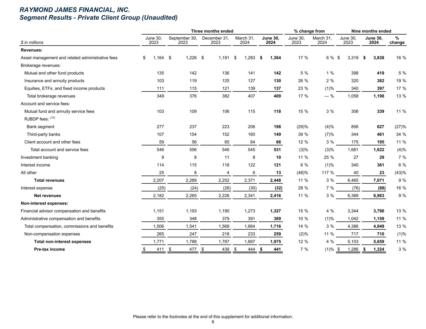 Three months ended % change from Nine months ended $ in millions June 30, 2023 September 30, 2023 December 31, 2023 March 31, 2024 June 30, 2024 June 30, 2023 March 31, 2024 June 30, 2023 June 30, 2024 % change Revenues: Asset management and related administrative fees $ 1,164 $ 1,226 $ 1,191 $ 1,283 $ 1,364 17 % 6 % $ 3,319 $ 3,838 16 % Brokerage revenues: Mutual and other fund products 135 142 136 141 142 5 % 1 % 398 419 5 % Insurance and annuity products 103 119 125 127 130 26 % 2 % 320 382 19 % Equities, ETFs, and fixed income products 111 115 121 139 137 23 % (1) % 340 397 17 % Total brokerage revenues 349 376 382 407 409 17 % — % 1,058 1,198 13 % Account and service fees: Mutual fund and annuity service fees 103 109 106 115 118 15 % 3 % 306 339 11 % RJBDP fees: (12) Bank segment 277 237 223 206 198 (29) % (4) % 856 627 (27) % Third-party banks 107 154 152 160 149 39 % (7) % 344 461 34 % Client account and other fees 59 56 65 64 66 12 % 3 % 175 195 11 % Total account and service fees 546 556 546 545 531 (3) % (3) % 1,681 1,622 (4) % Investment banking 9 8 11 8 10 11 % 25 % 27 29 7 % Interest income 114 115 118 122 121 6 % (1) % 340 361 6 % All other 25 8 4 6 13 (48) % 117 % 40 23 (43) % Total revenues 2,207 2,289 2,252 2,371 2,448 11 % 3 % 6,465 7,071 9 % Interest expense (25) (24) (26) (30) (32) 28 % 7 % (76) (88) 16 % Net revenues 2,182 2,265 2,226 2,341 2,416 11 % 3 % 6,389 6,983 9 % Non-interest expenses: Financial advisor compensation and benefits 1,151 1,193 1,190 1,273 1,327 15 % 4 % 3,344 3,790 13 % Administrative compensation and benefits 355 348 379 391 389 10 % (1) % 1,042 1,159 11 % Total compensation, commissions and benefits 1,506 1,541 1,569 1,664 1,716 14 % 3 % 4,386 4,949 13 % Non-compensation expenses 265 247 218 233 259 (2) % 11 % 717 710 (1) % Total non-interest expenses 1,771 1,788 1,787 1,897 1,975 12 % 4 % 5,103 5,659 11 % Pre-tax income $ 411 $ 477 $ 439 $ 444 $ 441 7 % (1) % $ 1,286 $ 1,324 3 % RAYMOND JAMES FINANCIAL, INC. Segment Results - Private Client Group (Unaudited) Please refer to the footnotes at the end of this supplement for additional information. 6