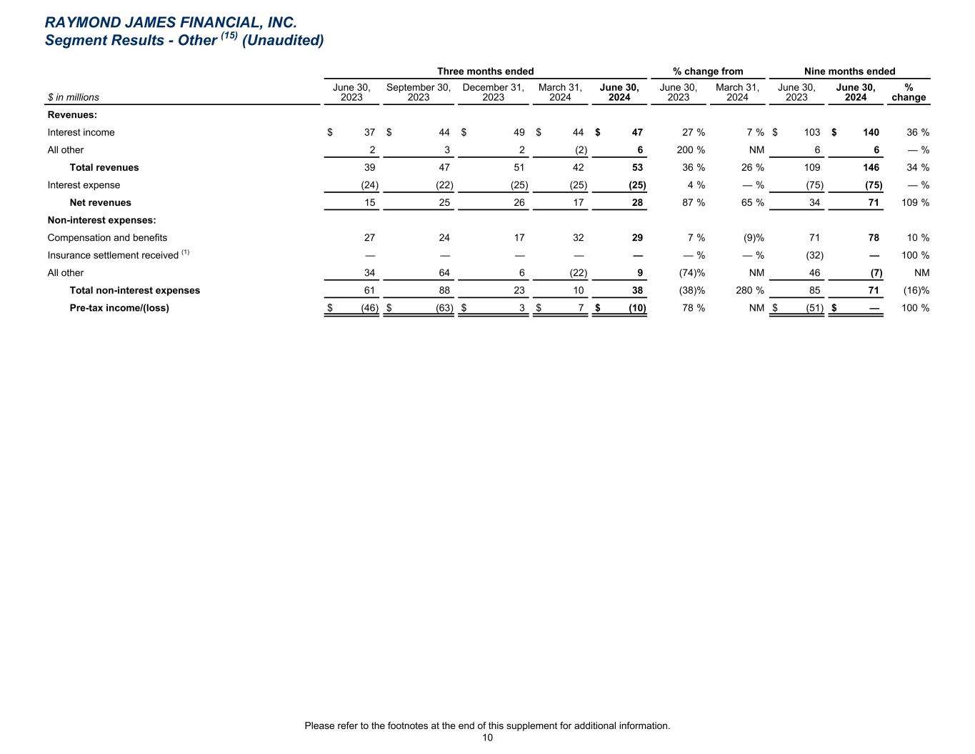 Three months ended % change from Nine months ended $ in millions June 30, 2023 September 30, 2023 December 31, 2023 March 31, 2024 June 30, 2024 June 30, 2023 March 31, 2024 June 30, 2023 June 30, 2024 % change Revenues: Interest income $ 826 $ 847 $ 872 $ 868 $ 867 5 % — % $ 2,251 $ 2,607 16 % Interest expense (329) (408) (446) (455) (461) 40 % 1 % (733) (1,362) 86 % Net interest income 497 439 426 413 406 (18) % (2) % 1,518 1,245 (18) % All other 17 12 15 11 12 (29) % 9 % 44 38 (14) % Net revenues 514 451 441 424 418 (19) % (1) % 1,562 1,283 (18) % Non-interest expenses: Compensation and benefits 48 41 43 48 45 (6) % (6) % 136 136 — % Non-compensation expenses: Bank loan provision/(benefit) for credit losses 54 36 12 21 (10) NM NM 96 23 (76) % RJBDP fees to Private Client Group (12) 277 237 223 206 198 (29) % (4) % 856 627 (27) % All other 69 59 71 74 70 1 % (5) % 181 215 19 % Total non-compensation expenses 400 332 306 301 258 (36) % (14) % 1,133 865 (24) % Total non-interest expenses 448 373 349 349 303 (32) % (13) % 1,269 1,001 (21) % Pre-tax income $ 66 $ 78 $ 92 $ 75 $ 115 74 % 53 % $ 293 $ 282 (4) % RAYMOND JAMES FINANCIAL, INC. Segment Results - Bank (Unaudited) Please refer to the footnotes at the end of this supplement for additional information. 9