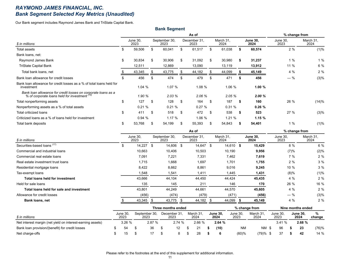 Our Bank segment includes Raymond James Bank and TriState Capital Bank. Bank Segment As of % change from $ in millions June 30, 2023 September 30, 2023 December 31, 2023 March 31, 2024 June 30, 2024 June 30, 2023 March 31, 2024 Total assets $ 59,506 $ 60,041 $ 61,517 $ 61,038 $ 60,574 2 % (1) % Bank loans, net: Raymond James Bank $ 30,834 $ 30,906 $ 31,092 $ 30,980 $ 31,237 1 % 1 % TriState Capital Bank 12,511 12,869 13,090 13,119 13,912 11 % 6 % Total bank loans, net $ 43,345 $ 43,775 $ 44,182 $ 44,099 $ 45,149 4 % 2 % Bank loan allowance for credit losses $ 456 $ 474 $ 479 $ 471 $ 456 — % (3) % Bank loan allowance for credit losses as a % of total loans held for investment 1.04 % 1.07 % 1.08 % 1.06 % 1.00 % Bank loan allowance for credit losses on corporate loans as a % of corporate loans held for investment (16) 1.90 % 2.03 % 2.06 % 2.05 % 2.00 % Total nonperforming assets $ 127 $ 128 $ 164 $ 187 $ 160 26 % (14) % Nonperforming assets as a % of total assets 0.21 % 0.21 % 0.27 % 0.31 % 0.26 % Total criticized loans $ 411 $ 518 $ 472 $ 538 $ 523 27 % (3) % Criticized loans as a % of loans held for investment 0.94 % 1.17 % 1.06 % 1.21 % 1.15 % Total bank deposits $ 53,768 $ 54,199 $ 55,393 $ 54,843 $ 54,401 1 % (1) % As of % change from $ in millions June 30, 2023 September 30, 2023 December 31, 2023 March 31, 2024 June 30, 2024 June 30, 2023 March 31, 2024 Securities-based loans (17) $ 14,227 $ 14,606 $ 14,647 $ 14,610 $ 15,429 8 % 6 % Commercial and industrial loans 10,663 10,406 10,503 10,190 9,956 (7) % (2) % Commercial real estate loans 7,091 7,221 7,331 7,462 7,619 7 % 2 % Real estate investment trust loans 1,715 1,668 1,697 1,701 1,755 2 % 3 % Residential mortgage loans 8,422 8,662 8,861 9,016 9,245 10 % 3 % Tax-exempt loans 1,548 1,541 1,411 1,445 1,431 (8) % (1) % Total loans held for investment 43,666 44,104 44,450 44,424 45,435 4 % 2 % Held for sale loans 135 145 211 146 170 26 % 16 % Total loans held for sale and investment 43,801 44,249 44,661 44,570 45,605 4 % 2 % Allowance for credit losses (456) (474) (479) (471) (456) — % (3) % Bank loans, net $ 43,345 $ 43,775 $ 44,182 $ 44,099 $ 45,149 4 % 2 % Three months ended % change from Nine months ended $ in millions June 30, 2023 September 30, 2023 December 31, 2023 March 31, 2024 June 30, 2024 June 30, 2023 March 31, 2024 June 30, 2023 June 30, 2024 % change Net interest margin (net yield on interest-earning assets) 3.26 % 2.87 % 2.74 % 2.66 % 2.64 % 3.41 % 2.68 % Bank loan provision/(benefit) for credit losses $ 54 $ 36 $ 12 $ 21 $ (10) NM NM $ 96 $ 23 (76) % Net charge-offs $ 15 $ 17 $ 8 $ 28 $ 6 (60) % (79) % $ 37 $ 42 14 % RAYMOND JAMES FINANCIAL, INC. Bank Segment Selected Key Metrics (Unaudited) Please refer to the footnotes at the end of this supplement for additional information. 11