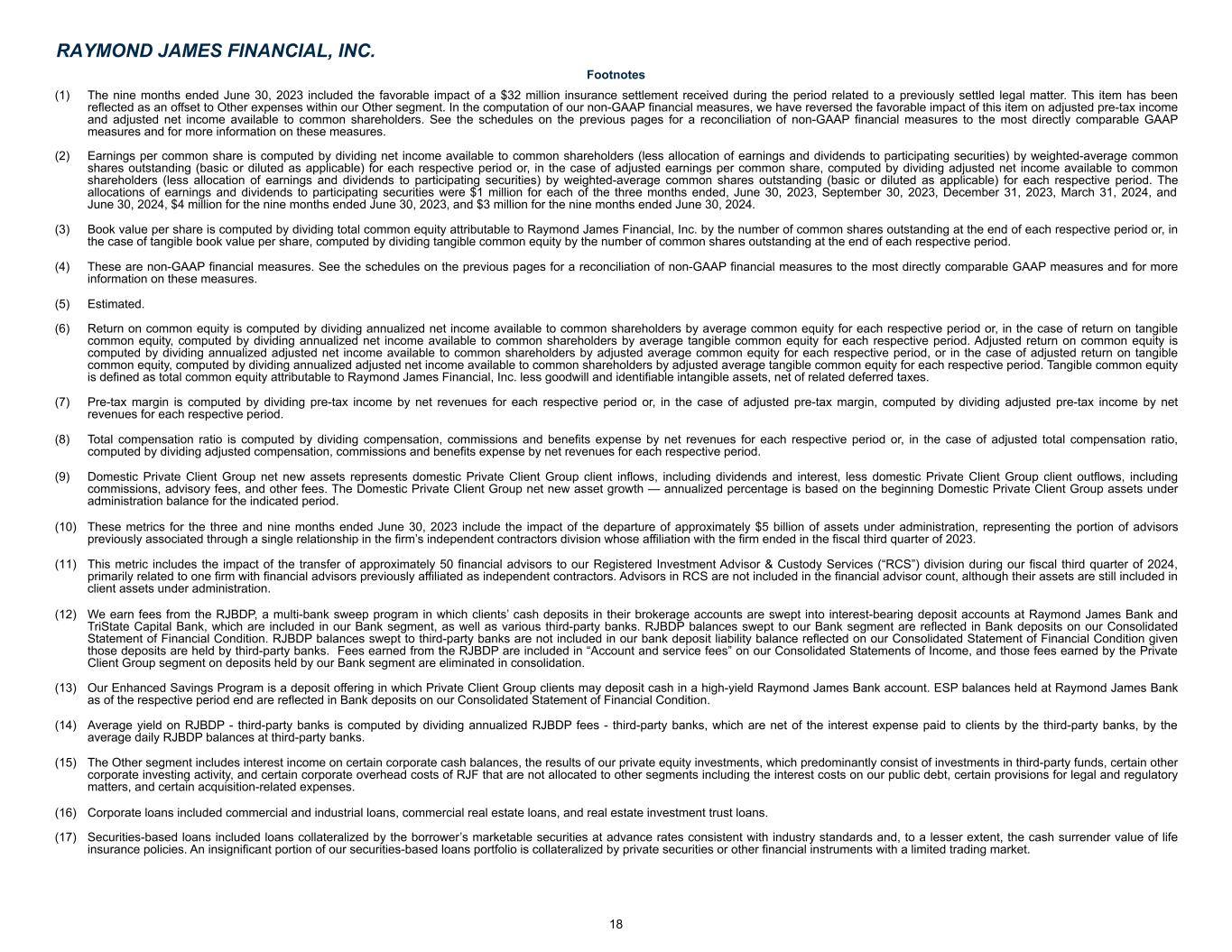 Footnotes (1) The nine months ended June 30, 2023 included the favorable impact of a $32 million insurance settlement received during the period related to a previously settled legal matter. This item has been reflected as an offset to Other expenses within our Other segment. In the computation of our non-GAAP financial measures, we have reversed the favorable impact of this item on adjusted pre-tax income and adjusted net income available to common shareholders. See the schedules on the previous pages for a reconciliation of non-GAAP financial measures to the most directly comparable GAAP measures and for more information on these measures. (2) Earnings per common share is computed by dividing net income available to common shareholders (less allocation of earnings and dividends to participating securities) by weighted-average common shares outstanding (basic or diluted as applicable) for each respective period or, in the case of adjusted earnings per common share, computed by dividing adjusted net income available to common shareholders (less allocation of earnings and dividends to participating securities) by weighted-average common shares outstanding (basic or diluted as applicable) for each respective period. The allocations of earnings and dividends to participating securities were $1 million for each of the three months ended, June 30, 2023, September 30, 2023, December 31, 2023, March 31, 2024, and June 30, 2024, $4 million for the nine months ended June 30, 2023, and $3 million for the nine months ended June 30, 2024. (3) Book value per share is computed by dividing total common equity attributable to Raymond James Financial, Inc. by the number of common shares outstanding at the end of each respective period or, in the case of tangible book value per share, computed by dividing tangible common equity by the number of common shares outstanding at the end of each respective period. (4) These are non-GAAP financial measures. See the schedules on the previous pages for a reconciliation of non-GAAP financial measures to the most directly comparable GAAP measures and for more information on these measures. (5) Estimated. (6) Return on common equity is computed by dividing annualized net income available to common shareholders by average common equity for each respective period or, in the case of return on tangible common equity, computed by dividing annualized net income available to common shareholders by average tangible common equity for each respective period. Adjusted return on common equity is computed by dividing annualized adjusted net income available to common shareholders by adjusted average common equity for each respective period, or in the case of adjusted return on tangible common equity, computed by dividing annualized adjusted net income available to common shareholders by adjusted average tangible common equity for each respective period. Tangible common equity is defined as total common equity attributable to Raymond James Financial, Inc. less goodwill and identifiable intangible assets, net of related deferred taxes. (7) Pre-tax margin is computed by dividing pre-tax income by net revenues for each respective period or, in the case of adjusted pre-tax margin, computed by dividing adjusted pre-tax income by net revenues for each respective period. (8) Total compensation ratio is computed by dividing compensation, commissions and benefits expense by net revenues for each respective period or, in the case of adjusted total compensation ratio, computed by dividing adjusted compensation, commissions and benefits expense by net revenues for each respective period. (9) Domestic Private Client Group net new assets represents domestic Private Client Group client inflows, including dividends and interest, less domestic Private Client Group client outflows, including commissions, advisory fees, and other fees. The Domestic Private Client Group net new asset growth — annualized percentage is based on the beginning Domestic Private Client Group assets under administration balance for the indicated period. (10) These metrics for the three and nine months ended June 30, 2023 include the impact of the departure of approximately $5 billion of assets under administration, representing the portion of advisors previously associated through a single relationship in the firm’s independent contractors division whose affiliation with the firm ended in the fiscal third quarter of 2023. (11) This metric includes the impact of the transfer of approximately 50 financial advisors to our Registered Investment Advisor & Custody Services (“RCS”) division during our fiscal third quarter of 2024, primarily related to one firm with financial advisors previously affiliated as independent contractors. Advisors in RCS are not included in the financial advisor count, although their assets are still included in client assets under administration. (12) We earn fees from the RJBDP, a multi-bank sweep program in which clients’ cash deposits in their brokerage accounts are swept into interest-bearing deposit accounts at Raymond James Bank and TriState Capital Bank, which are included in our Bank segment, as well as various third-party banks. RJBDP balances swept to our Bank segment are reflected in Bank deposits on our Consolidated Statement of Financial Condition. RJBDP balances swept to third-party banks are not included in our bank deposit liability balance reflected on our Consolidated Statement of Financial Condition given those deposits are held by third-party banks. Fees earned from the RJBDP are included in “Account and service fees” on our Consolidated Statements of Income, and those fees earned by the Private Client Group segment on deposits held by our Bank segment are eliminated in consolidation. (13) Our Enhanced Savings Program is a deposit offering in which Private Client Group clients may deposit cash in a high-yield Raymond James Bank account. ESP balances held at Raymond Jame