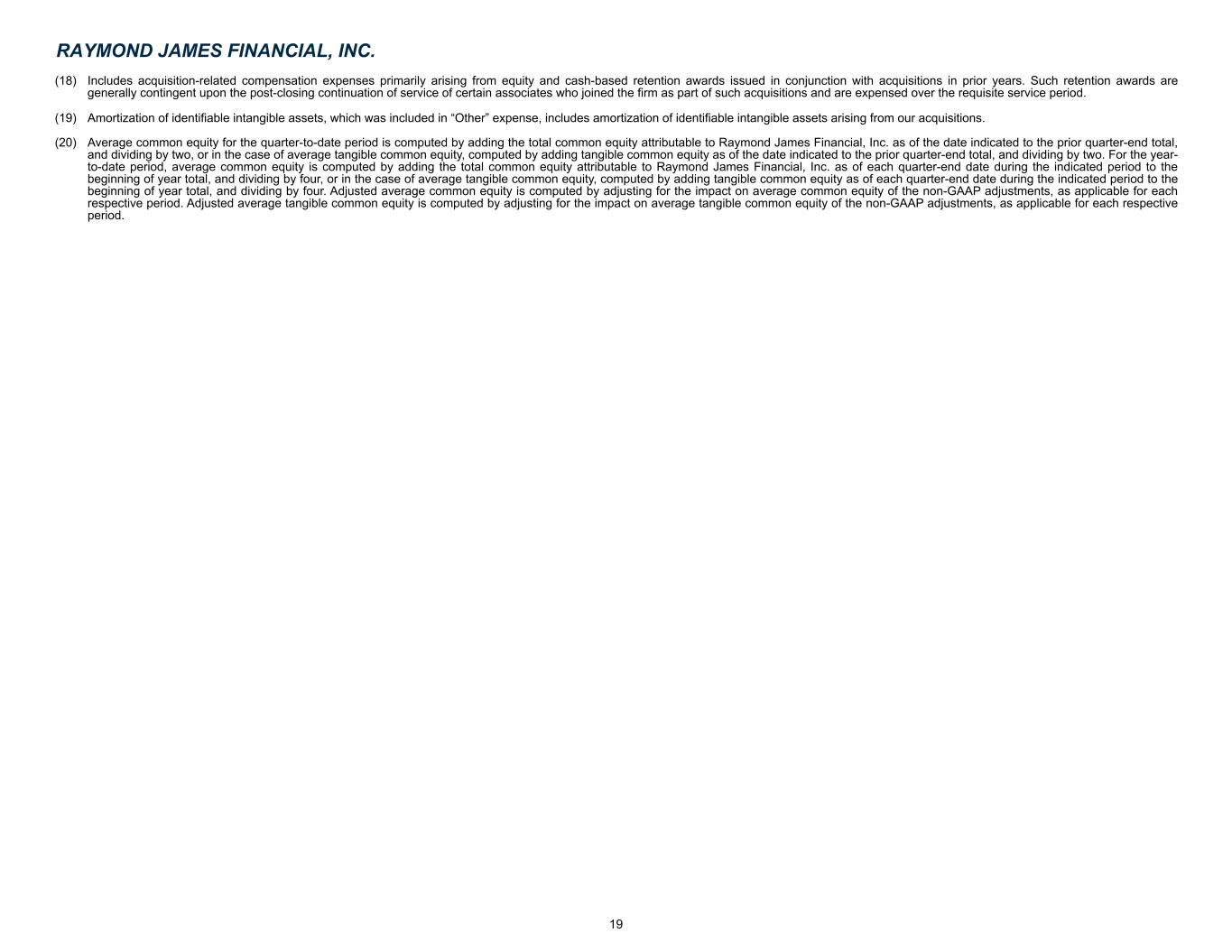 (18) Includes acquisition-related compensation expenses primarily arising from equity and cash-based retention awards issued in conjunction with acquisitions in prior years. Such retention awards are generally contingent upon the post-closing continuation of service of certain associates who joined the firm as part of such acquisitions and are expensed over the requisite service period. (19) Amortization of identifiable intangible assets, which was included in “Other” expense, includes amortization of identifiable intangible assets arising from our acquisitions. (20) Average common equity for the quarter-to-date period is computed by adding the total common equity attributable to Raymond James Financial, Inc. as of the date indicated to the prior quarter-end total, and dividing by two, or in the case of average tangible common equity, computed by adding tangible common equity as of the date indicated to the prior quarter-end total, and dividing by two. For the year- to-date period, average common equity is computed by adding the total common equity attributable to Raymond James Financial, Inc. as of each quarter-end date during the indicated period to the beginning of year total, and dividing by four, or in the case of average tangible common equity, computed by adding tangible common equity as of each quarter-end date during the indicated period to the beginning of year total, and dividing by four. Adjusted average common equity is computed by adjusting for the impact on average common equity of the non-GAAP adjustments, as applicable for each respective period. Adjusted average tangible common equity is computed by adjusting for the impact on average tangible common equity of the non-GAAP adjustments, as applicable for each respective period. RAYMOND JAMES FINANCIAL, INC. 19