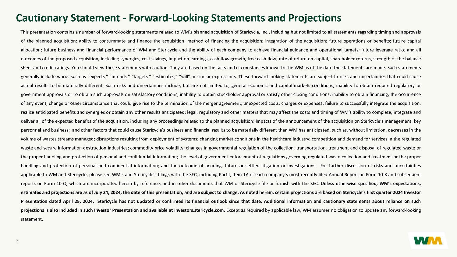 CONFIDENTIAL AND PROPRIETARY INFORMATION OF WM This presentation contains a number of forward - looking statements related to WM’s planned acquisition of Stericycle, Inc . , including but not limited to all statements regarding timing and approvals of the planned acquisition ; ability to consummate and finance the acquisition ; method of financing the acquisition ; integration of the acquisition ; future operations or benefits ; future capital allocation ; future business and financial performance of WM and Stericycle and the ability of each company to achieve financial guidance and operational targets ; future leverage ratio ; and all outcomes of the proposed acquisition, including synergies, cost savings, impact on earnings, cash flow growth, free cash flow, rate of return on capital, shareholder returns, strength of the balance sheet and credit ratings . You should view these statements with caution . They are based on the facts and circumstances known to the WM as of the date the statements are made . Such statements generally include words such as “expects,” “intends,” “targets,” “estimates,” “will” or similar expressions . These forward - looking statements are subject to risks and uncertainties that could cause actual results to be materially different . Such risks and uncertainties include, but are not limited to, general economic and capital markets conditions ; inability to obtain required regulatory or government approvals or to obtain such approvals on satisfactory conditions ; inability to obtain stockholder approval or satisfy other closing conditions ; inability to obtain financing ; the occurrence of any event, change or other circumstance that could give rise to the termination of the merger agreement ; unexpected costs, charges or expenses ; failure to successfully integrate the acquisition, realize anticipated benefits and synergies or obtain any other results anticipated ; legal, regulatory and other matters that may affect the costs and timing of WM’s ability to complete, integrate and deliver all of the expected benefits of the acquisition, including any proceedings related to the planned acquisition ; impacts of the announcement of the acquisition on Stericycle’s management, key personnel and business ; and other factors that could cause Stericycle’s business and financial results to be materially different than WM has anticipated, such as, without limitation, decreases in the volume of wastes streams managed ; disruptions resulting from deployment of systems ; changing market conditions in the healthcare industry ; competition and demand for services in the regulated waste and secure information destruction industries ; commodity price volatility ; changes in governmental regulation of the collection, transportation, treatment and disposal of regulated waste or the proper handling and protection of personal and confidential information ; the level of government enforcement of regulations governing regulated waste collection and treatment or the proper handling and protection of personal and confidential information ; and the outcome of pending, future or settled litigation or investigations . For further discussion of risks and uncertainties applicable to WM and Stericycle, please see WM’s and Stericycle’s filings with the SEC, including Part I, Item 1 A of each company’s most recently filed Annual Report on Form 10 - K and subsequent reports on Form 10 - Q, which are incorporated herein by reference, and in other documents that WM or Stericycle file or furnish with the SEC . Unless otherwise specified, WM’s expectations, estimates and projections are as of July 24 , 2024 , the date of this presentation, and are subject to change . As noted herein, certain projections are based on Stericycle’s first quarter 2024 Investor Presentation dated April 25 , 2024 . Stericycle has not updated or confirmed its financial outlook since that date . Additional information and cautionary statements about reliance on such projections is also included in such Investor Presentation and available at investors . stericycle . com . Except as required by applicable law, WM assumes no obligation to update any forward - looking statement . 2 Cautionary Statement - Forward - Looking Statements and Projections