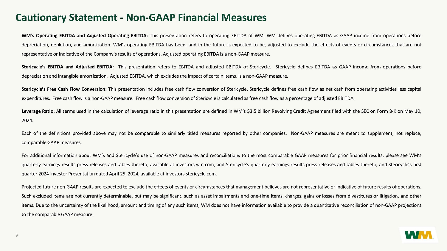 CONFIDENTIAL AND PROPRIETARY INFORMATION OF WM WM’s Operating EBITDA and Adjusted Operating EBITDA : This presentation refers to operating EBITDA of WM . WM defines operating EBITDA as GAAP income from operations before depreciation, depletion, and amortization . WM’s operating EBITDA has been, and in the future is expected to be, adjusted to exclude the effects of events or circumstances that are not representative or indicative of the Company’s results of operations . Adjusted operating EBITDA is a non - GAAP measure . Stericycle’s EBITDA and Adjusted EBITDA : This presentation refers to EBITDA and adjusted EBITDA of Stericycle . Stericycle defines EBITDA as GAAP income from operations before depreciation and intangible amortization . Adjusted EBITDA, which excludes the impact of certain items, is a non - GAAP measure . Stericycle’s Free Cash Flow Conversion : This presentation includes free cash flow conversion of Stericycle . Stericycle defines free cash flow as net cash from operating activities less capital expenditures . Free cash flow is a non - GAAP measure . Free cash flow conversion of Stericycle is calculated as free cash flow as a percentage of adjusted EBITDA . Leverage Ratio : All terms used in the calculation of leverage ratio in this presentation are defined in WM’s $ 3 . 5 billion Revolving Credit Agreement filed with the SEC on Form 8 - K on May 10 , 2024 . Each of the definitions provided above may not be comparable to similarly titled measures reported by other companies . Non - GAAP measures are meant to supplement, not replace, comparable GAAP measures . For additional information about WM’s and Stericycle’s use of non - GAAP measures and reconciliations to the most comparable GAAP measures for prior financial results, please see WM’s quarterly earnings results press releases and tables thereto, available at investors . wm . com, and Stericycle’s quarterly earnings results press releases and tables thereto, and Stericycle’s first quarter 2024 Investor Presentation dated April 25 , 2024 , available at investors . stericycle . com . Projected future non - GAAP results are expected to exclude the effects of events or circumstances that management believes are not representative or indicative of future results of operations . Such excluded items are not currently determinable, but may be significant, such as asset impairments and one - time items, charges, gains or losses from divestitures or litigation, and other items . Due to the uncertainty of the likelihood, amount and timing of any such items, WM does not have information available to provide a quantitative reconciliation of non - GAAP projections to the comparable GAAP measure . 3 Cautionary Statement - Non - GAAP Financial Measures