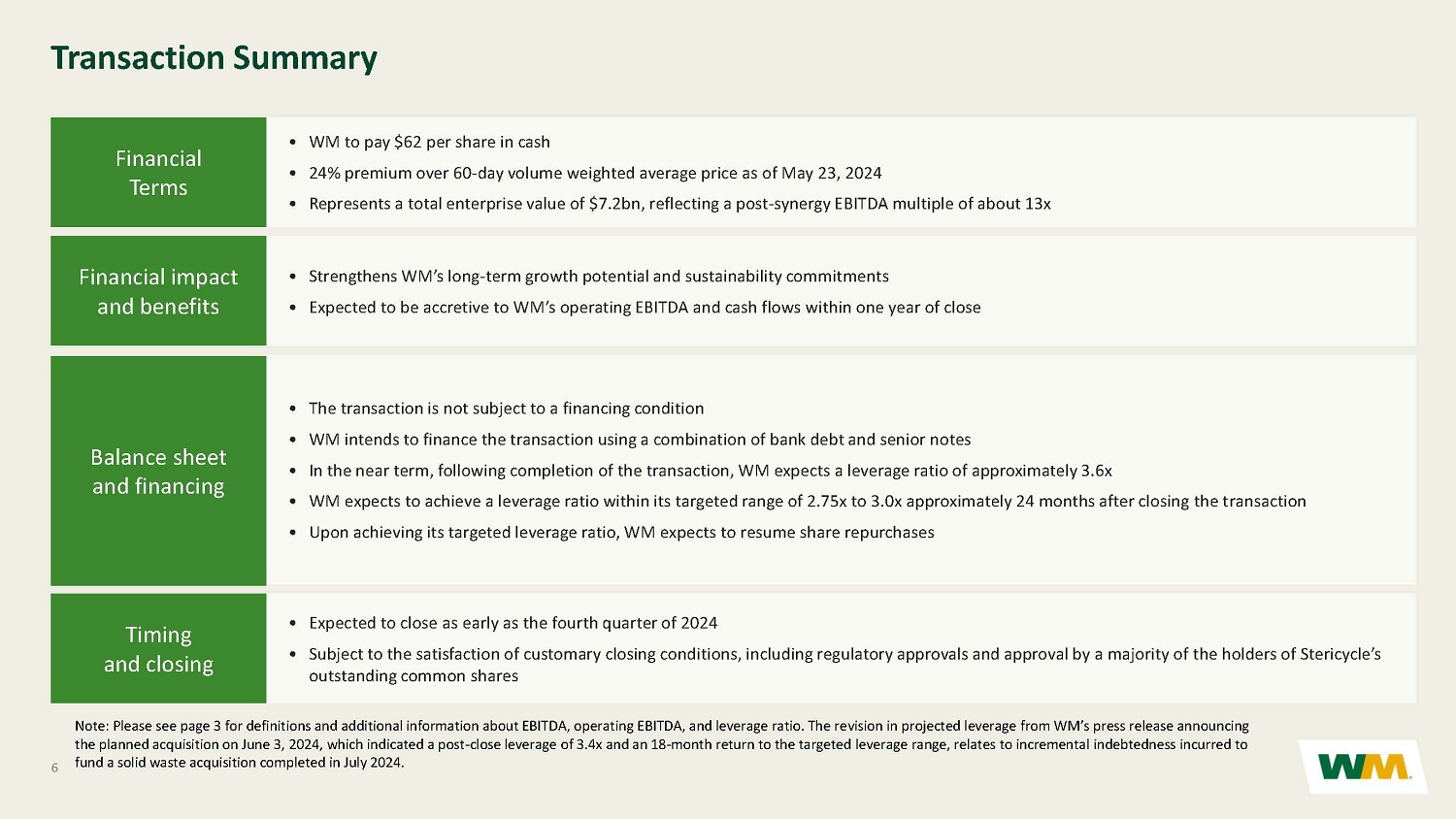 CONFIDENTIAL AND PROPRIETARY INFORMATION OF WM CONFIDENTIAL AND PROPRIETARY INFORMATION OF WM 6 Transaction Summary • WM to pay $62 per share in cash • 24% premium over 60 - day volume weighted average price as of May 23, 2024 • Represents a total enterprise value of $7.2bn, reflecting a post - synergy EBITDA multiple of about 13x Financial Terms • Strengthens WM’s long - term growth potential and sustainability commitments • Expected to be accretive to WM’s operating EBITDA and cash flows within one year of close Financial impact and benefits • The transaction is not subject to a financing condition • WM intends to finance the transaction using a combination of bank debt and senior notes • In the near term, following completion of the transaction, WM expects a leverage ratio of approximately 3.6x • WM expects to achieve a leverage ratio within its targeted range of 2.75x to 3.0x approximately 24 months after closing the t ran saction • Upon achieving its targeted leverage ratio, WM expects to resume share repurchases Balance sheet and financing • Expected to close as early as the fourth quarter of 2024 • Subject to the satisfaction of customary closing conditions, including regulatory approvals and approval by a majority of the ho lders of Stericycle’s outstanding common shares Timing and closing Note: Please see page 3 for definitions and additional information about EBITDA, operating EBITDA, and leverage ratio. The re vis ion in projected leverage from WM’s press release announcing the planned acquisition on June 3, 2024, which indicated a post - close leverage of 3.4x and an 18 - month return to the targeted le verage range, relates to incremental indebtedness incurred to fund a solid waste acquisition completed in July 2024.