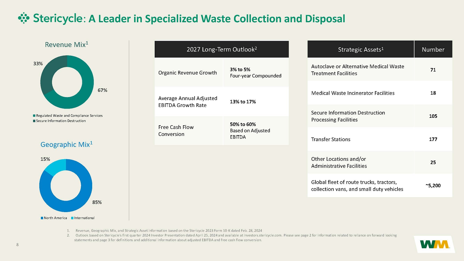 CONFIDENTIAL AND PROPRIETARY INFORMATION OF WM 7 Overview of Stericycle Based on Stericycle’s 2023 Form 10 - K and its first quarter 2024 Investor Presentation dated April 25, 2024. Items available at i nvestors.stericycle.com. Additional information and cautionary statements about reliance on projections is included on page 2 and in the referenced St eri cycle Investor Presentation.