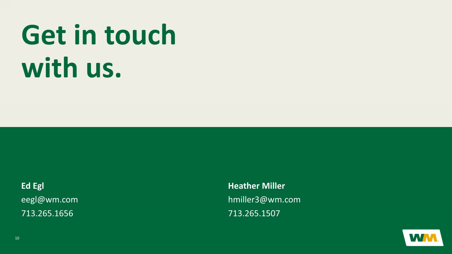 CONFIDENTIAL AND PROPRIETARY INFORMATION OF WM 10 Get in touch with us. Ed Egl eegl@wm.com 713.265.1656 Heather Miller hmiller3@wm.com 713.265.1507