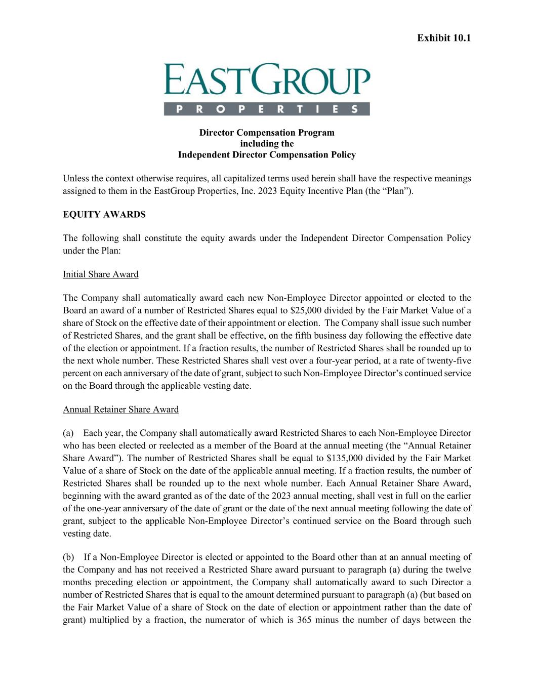 Exhibit 10.1 Director Compensation Program including the Independent Director Compensation Policy Unless the context otherwise requires, all capitalized terms used herein shall have the respective meanings assigned to them in the EastGroup Properties, Inc. 2023 Equity Incentive Plan (the “Plan”). EQUITY AWARDS The following shall constitute the equity awards under the Independent Director Compensation Policy under the Plan: Initial Share Award The Company shall automatically award each new Non-Employee Director appointed or elected to the Board an award of a number of Restricted Shares equal to $25,000 divided by the Fair Market Value of a share of Stock on the effective date of their appointment or election. The Company shall issue such number of Restricted Shares, and the grant shall be effective, on the fifth business day following the effective date of the election or appointment. If a fraction results, the number of Restricted Shares shall be rounded up to the next whole number. These Restricted Shares shall vest over a four-year period, at a rate of twenty-five percent on each anniversary of the date of grant, subject to such Non-Employee Director’s continued service on the Board through the applicable vesting date. Annual Retainer Share Award (a) Each year, the Company shall automatically award Restricted Shares to each Non-Employee Director who has been elected or reelected as a member of the Board at the annual meeting (the “Annual Retainer Share Award”). The number of Restricted Shares shall be equal to $135,000 divided by the Fair Market Value of a share of Stock on the date of the applicable annual meeting. If a fraction results, the number of Restricted Shares shall be rounded up to the next whole number. Each Annual Retainer Share Award, beginning with the award granted as of the date of the 2023 annual meeting, shall vest in full on the earlier of the one-year anniversary of the date of grant or the date of the next annual meeting following the date of grant, subject to the applicable Non-Employee Director’s continued service on the Board through such vesting date. (b) If a Non-Employee Director is elected or appointed to the Board other than at an annual meeting of the Company and has not received a Restricted Share award pursuant to paragraph (a) during the twelve months preceding election or appointment, the Company shall automatically award to such Director a number of Restricted Shares that is equal to the amount determined pursuant to paragraph (a) (but based on the Fair Market Value of a share of Stock on the date of election or appointment rather than the date of grant) multiplied by a fraction, the numerator of which is 365 minus the number of days between the