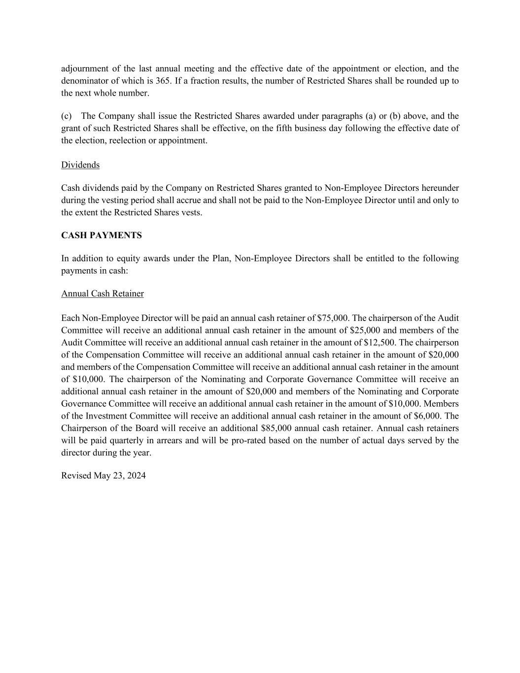 adjournment of the last annual meeting and the effective date of the appointment or election, and the denominator of which is 365. If a fraction results, the number of Restricted Shares shall be rounded up to the next whole number. (c) The Company shall issue the Restricted Shares awarded under paragraphs (a) or (b) above, and the grant of such Restricted Shares shall be effective, on the fifth business day following the effective date of the election, reelection or appointment. Dividends Cash dividends paid by the Company on Restricted Shares granted to Non-Employee Directors hereunder during the vesting period shall accrue and shall not be paid to the Non-Employee Director until and only to the extent the Restricted Shares vests. CASH PAYMENTS In addition to equity awards under the Plan, Non-Employee Directors shall be entitled to the following payments in cash: Annual Cash Retainer Each Non-Employee Director will be paid an annual cash retainer of $75,000. The chairperson of the Audit Committee will receive an additional annual cash retainer in the amount of $25,000 and members of the Audit Committee will receive an additional annual cash retainer in the amount of $12,500. The chairperson of the Compensation Committee will receive an additional annual cash retainer in the amount of $20,000 and members of the Compensation Committee will receive an additional annual cash retainer in the amount of $10,000. The chairperson of the Nominating and Corporate Governance Committee will receive an additional annual cash retainer in the amount of $20,000 and members of the Nominating and Corporate Governance Committee will receive an additional annual cash retainer in the amount of $10,000. Members of the Investment Committee will receive an additional annual cash retainer in the amount of $6,000. The Chairperson of the Board will receive an additional $85,000 annual cash retainer. Annual cash retainers will be paid quarterly in arrears and will be pro-rated based on the number of actual days served by the director during the year. Revised May 23, 2024