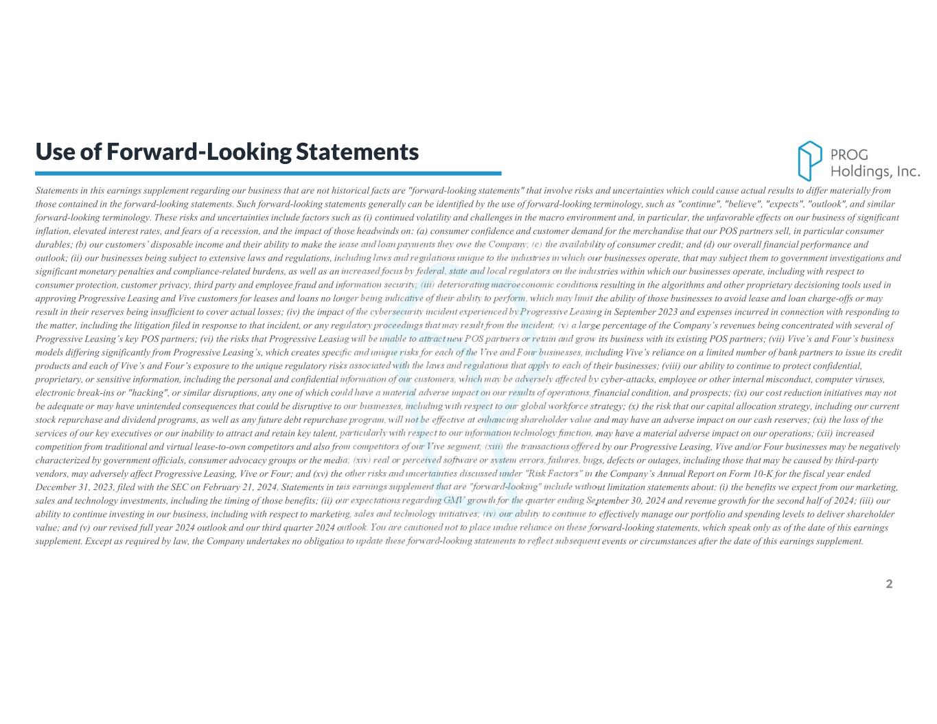 2 Statements in this earnings supplement regarding our business that are not historical facts are "forward-looking statements" that involve risks and uncertainties which could cause actual results to differ materially from those contained in the forward-looking statements. Such forward-looking statements generally can be identified by the use of forward-looking terminology, such as "continue", "believe", "expects", "outlook", and similar forward-looking terminology. These risks and uncertainties include factors such as (i) continued volatility and challenges in the macro environment and, in particular, the unfavorable effects on our business of significant inflation, elevated interest rates, and fears of a recession, and the impact of those headwinds on: (a) consumer confidence and customer demand for the merchandise that our POS partners sell, in particular consumer durables; (b) our customers’ disposable income and their ability to make the lease and loan payments they owe the Company; (c) the availability of consumer credit; and (d) our overall financial performance and outlook; (ii) our businesses being subject to extensive laws and regulations, including laws and regulations unique to the industries in which our businesses operate, that may subject them to government investigations and significant monetary penalties and compliance-related burdens, as well as an increased focus by federal, state and local regulators on the industries within which our businesses operate, including with respect to consumer protection, customer privacy, third party and employee fraud and information security; (iii) deteriorating macroeconomic conditions resulting in the algorithms and other proprietary decisioning tools used in approving Progressive Leasing and Vive customers for leases and loans no longer being indicative of their ability to perform, which may limit the ability of those businesses to avoid lease and loan charge-offs or may result in their reserves being insufficient to cover actual losses; (iv) the impact of the cybersecurity incident experienced by Progressive Leasing in September 2023 and expenses incurred in connection with responding to the matter, including the litigation filed in response to that incident, or any regulatory proceedings that may result from the incident; (v) a large percentage of the Company’s revenues being concentrated with several of Progressive Leasing’s key POS partners; (vi) the risks that Progressive Leasing will be unable to attract new POS partners or retain and grow its business with its existing POS partners; (vii) Vive’s and Four’s business models differing significantly from Progressive Leasing’s, which creates specific and unique risks for each of the Vive and Four businesses, including Vive’s reliance on a limited number of bank partners to issue its credit products and each of Vive’s and Four’s exposure to the unique regulatory risks associated with the laws and regulations that apply to each of their businesses; (viii) our ability to continue to protect confidential, proprietary, or sensitive information, including the personal and confidential information of our customers, which may be adversely affected by cyber-attacks, employee or other internal misconduct, computer viruses, electronic break-ins or "hacking", or similar disruptions, any one of which could have a material adverse impact on our results of operations, financial condition, and prospects; (ix) our cost reduction initiatives may not be adequate or may have unintended consequences that could be disruptive to our businesses, including with respect to our global workforce strategy; (x) the risk that our capital allocation strategy, including our current stock repurchase and dividend programs, as well as any future debt repurchase program, will not be effective at enhancing shareholder value and may have an adverse impact on our cash reserves; (xi) the loss of the services of our key executives or our inability to attract and retain key talent, particularly with respect to our information technology function, may have a material adverse impact on our operations; (xii) increased competition from traditional and virtual lease-to-own competitors and also from competitors of our Vive segment; (xiii) the transactions offered by our Progressive Leasing, Vive and/or Four businesses may be negatively characterized by government officials, consumer advocacy groups or the media; (xiv) real or perceived software or system errors, failures, bugs, defects or outages, including those that may be caused by third-party vendors, may adversely affect Progressive Leasing, Vive or Four; and (xv) the other risks and uncertainties discussed under "Risk Factors" in the Company’s Annual Report on Form 10-K for the fiscal year ended December 31, 2023, filed with the SEC on February 21, 2024. Statements in this earnings supplement that are "forward-looking" include without limitation statements about: (i) the benefits we expect from our marketing, sales and technology investments, including the timing of those benefits; (ii) our expectations regarding GMV growth for the quarter ending September 30, 2024 and revenue growth for the second half of 2024; (iii) our ability to continue investing in our business, including with respect to marketing, sales and technology initiatives; (iv) our ability to continue to effectively manage our portfolio and spending levels to deliver shareholder value; and (v) our revised full year 2024 outlook and our third quarter 2024 outlook. You are cautioned not to place undue reliance on these forward-looking statements, which speak only as of the date of this earnings supplement. Except as required by law, the Company undertakes no obligation to update these forward-looking statements to reflect subsequent events or circumstances after the date of this earnings supplement. Use of Forward-Looking Statements