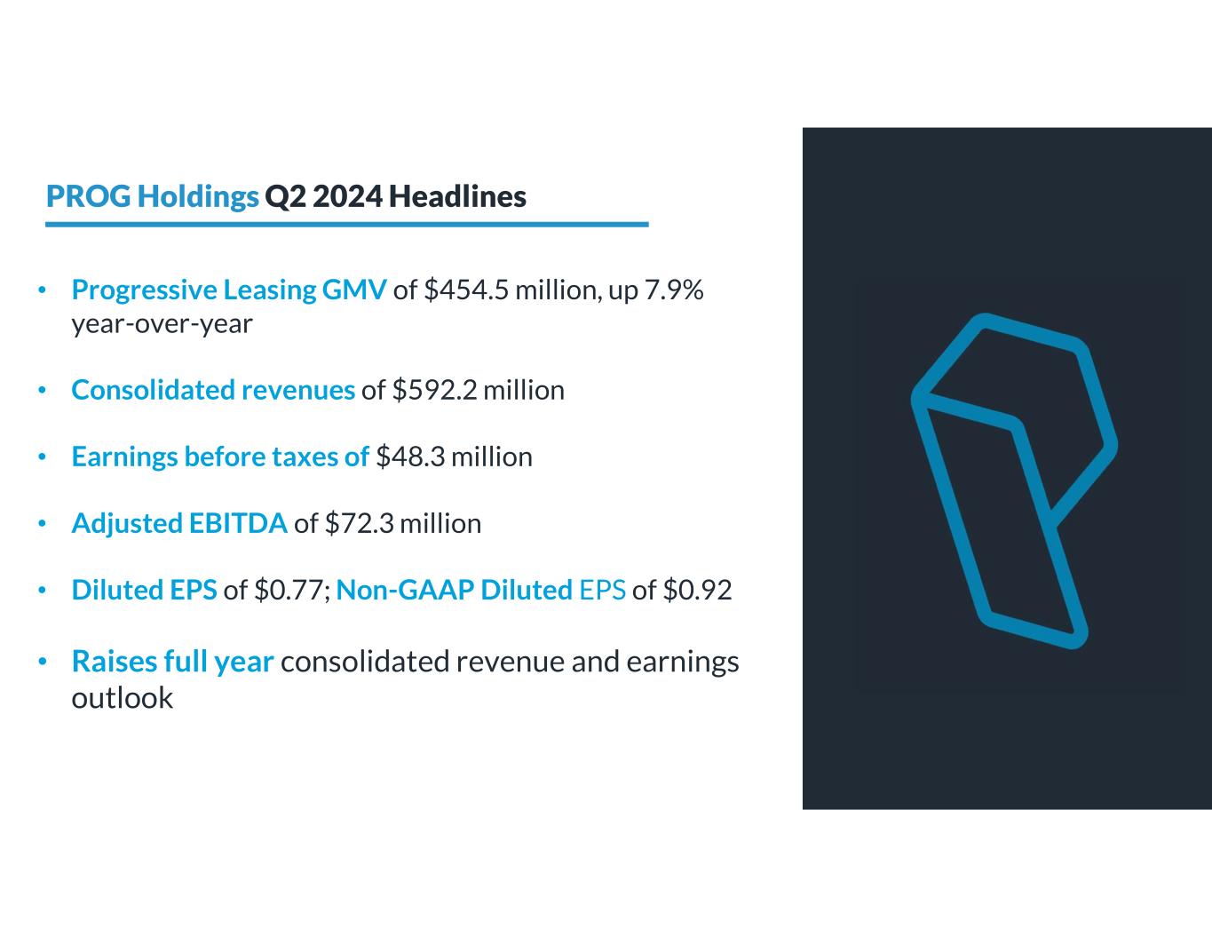 SALT LAKE CITY, July 24, 2024 - PROG Holdings, Inc. (NYSE:PRG), the fintech holding company for Progressive Leasing, Vive Financial, Four Technologies, and Build today announced financial results for the second quarter ended June 30, 2024.