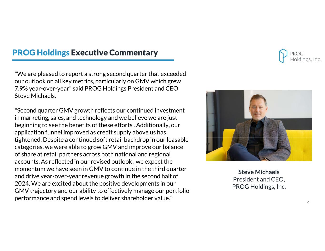 "We are pleased to report a strong second quarter that exceeded our outlook on all key metrics, particularly on GMV, which grew 7.9% year-over-year" said PROG Holdings President and CEO Steve Michaels. Second quarter GMV growth reflects our continued investment in marketing, sales, and technology, and we believe we are just beginning to see the benefits of these efforts. Additionally, our application funnel improved as credit supply above us has tightened. Despite a continued soft retail backdrop in our leasable categories, we were able to grow GMV and improve our balance of share at retail partners across both national and regional accounts. As reflected in our revised outlook, we expect the momentum we have seen in GMV to continue in the third quarter and drive year-over-year revenue growth in the second half of 2024. We are excited about the positive developments in our GMV trajectory and our ability to effectively manage our portfolio performance and spend levels to deliver shareholder value," concluded Michaels.