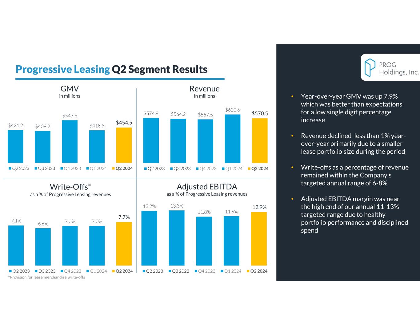 •Progressive Leasing GMV of $454.5 million, 7.9% growth year-over-year