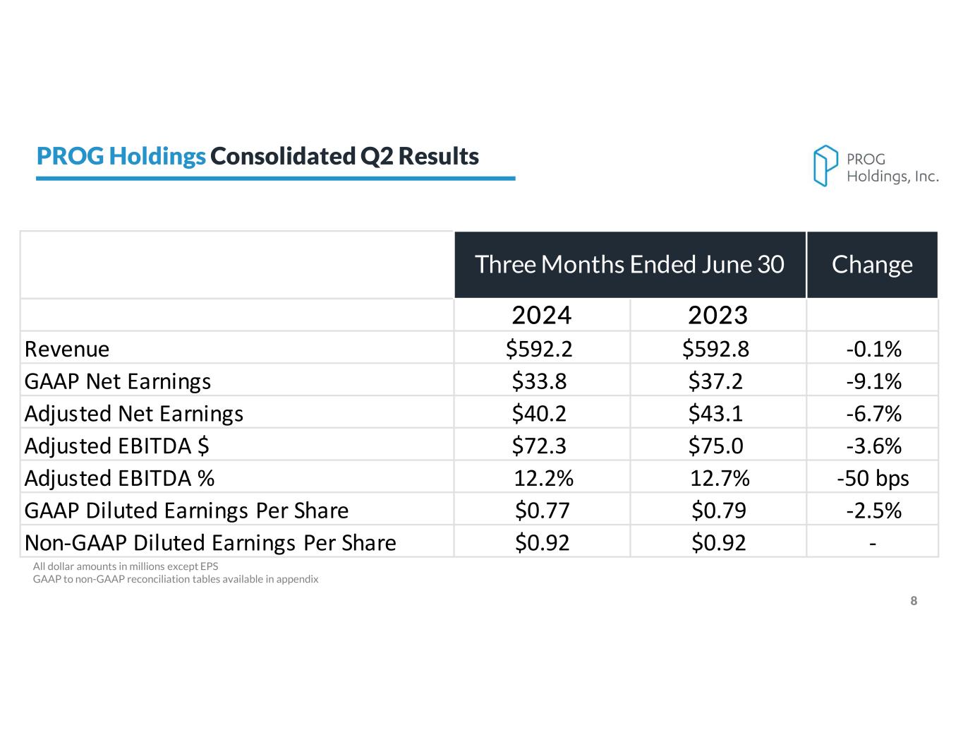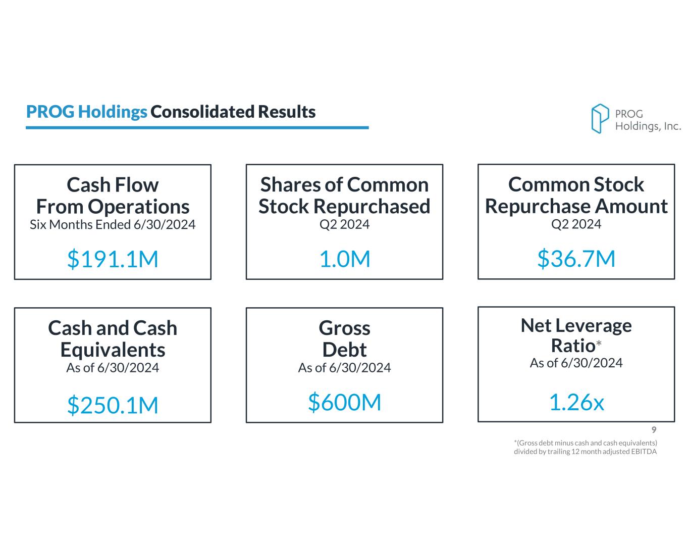 8 2024 2023 Revenue $592.2 $592.8 -0.1% GAAP Net Earnings $33.8 $37.2 -9.1% Adjusted Net Earnings $40.2 $43.1 -6.7% Adjusted EBITDA $ $72.3 $75.0 -3.6% Adjusted EBITDA % 12.2% 12.7% -50 bps GAAP Diluted Earnings Per Share $0.77 $0.79 -2.5% Non-GAAP Diluted Earnings Per Share $0.92 $0.92 - Three Months Ended June 30 Change All dollar amounts in millions except EPS GAAP to non-GAAP reconciliation tables available in appendix PROG Holdings Consolidated Q2 Results