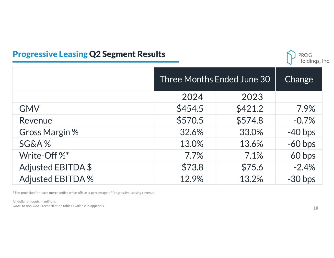 9 *(Gross debt minus cash and cash equivalents) divided by trailing 12 month adjusted EBITDA PROG Holdings Consolidated Results Shares of Common Stock Repurchased Q2 2024 1.0M Cash and Cash Equivalents As of 6/30/2024 $250.1M Gross Debt As of 6/30/2024 $600M Net Leverage Ratio* As of 6/30/2024 1.26x Cash Flow From Operations Six Months Ended 6/30/2024 $191.1M Common Stock Repurchase Amount Q2 2024 $36.7M